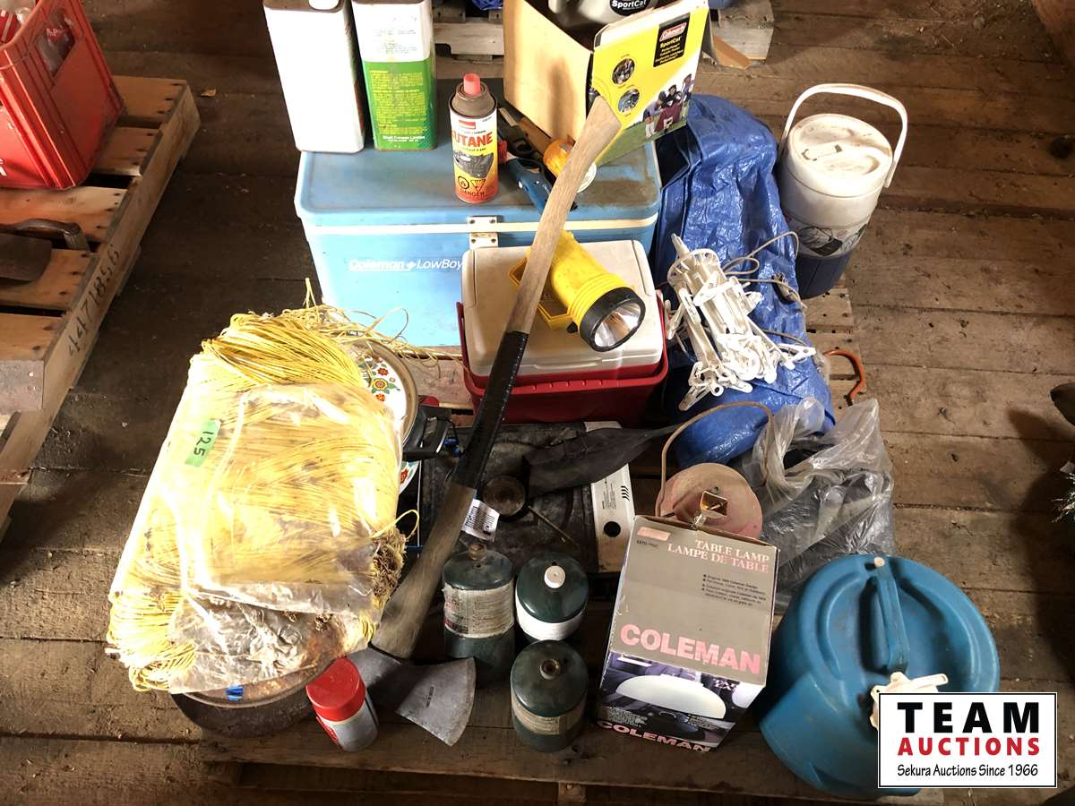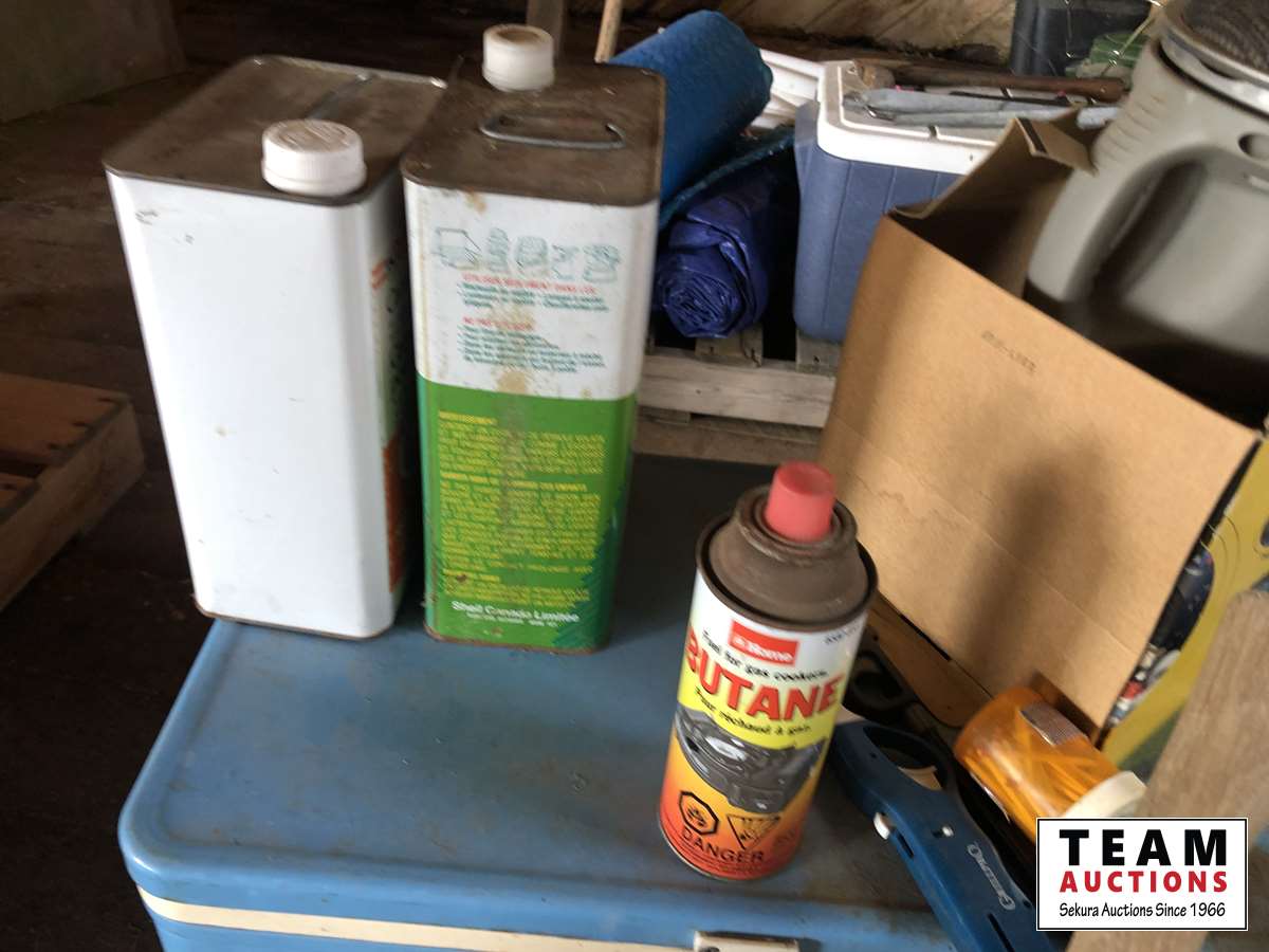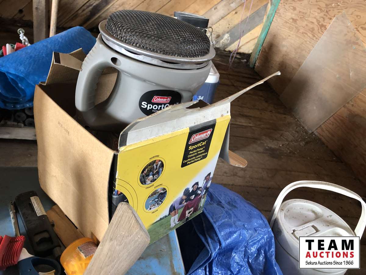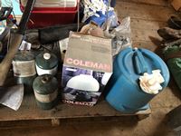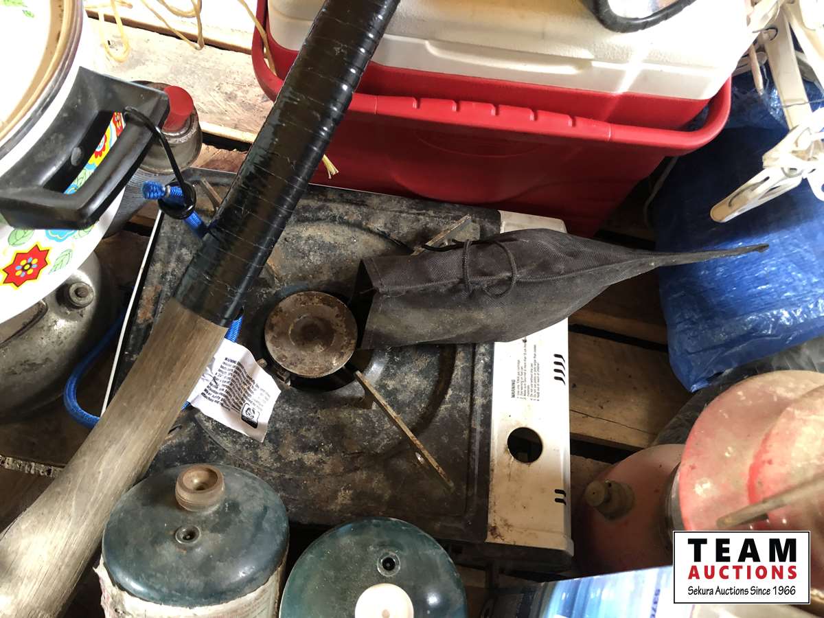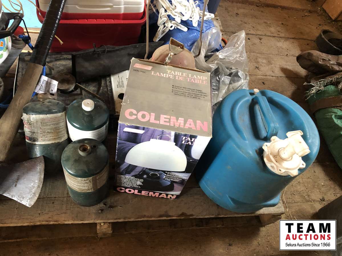 Camping fuel, Coleman cooler, water jug, (3) propane bottles, lamp, axe, Sport Cat heater, tarp