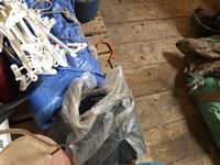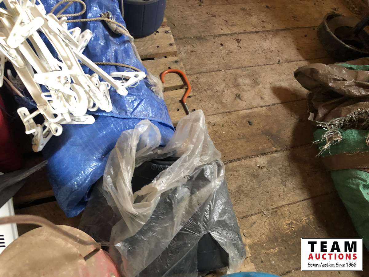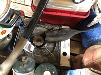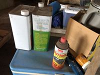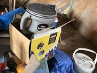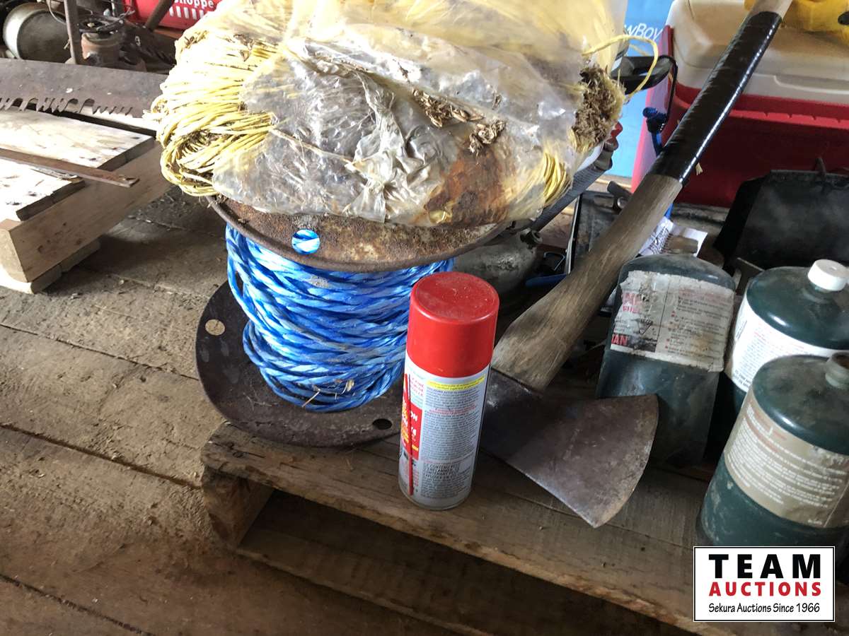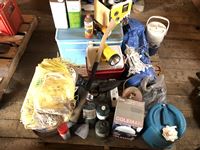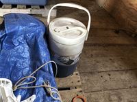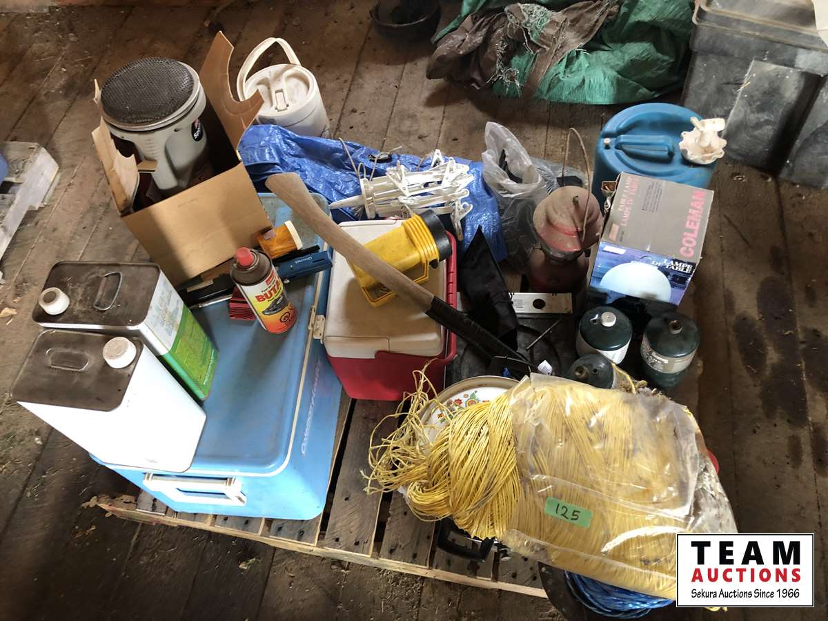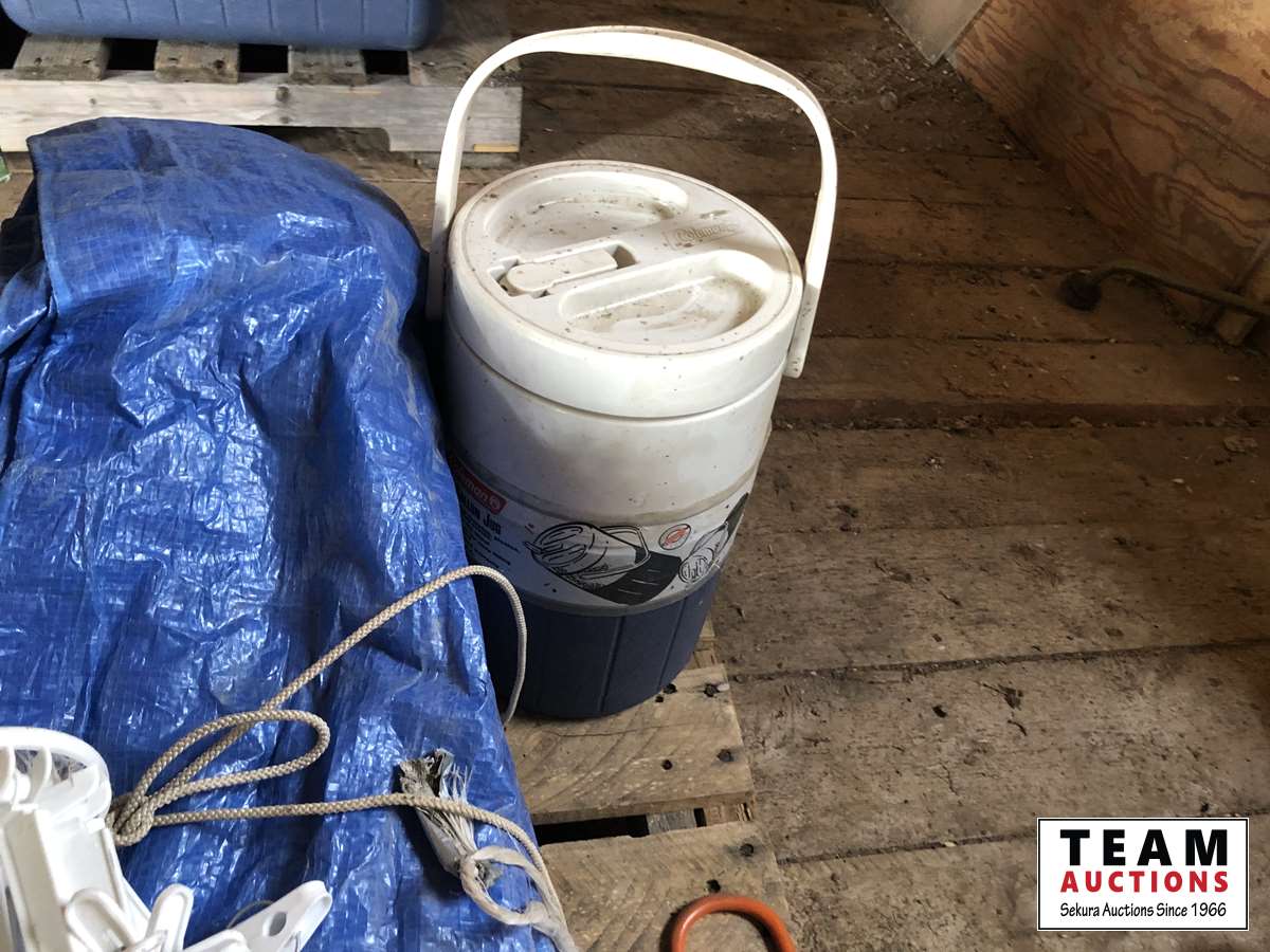 Camping fuel, Coleman cooler, water jug, (3) propane bottles, lamp, axe, Sport Cat heater, tarp