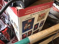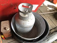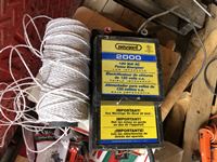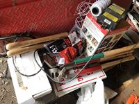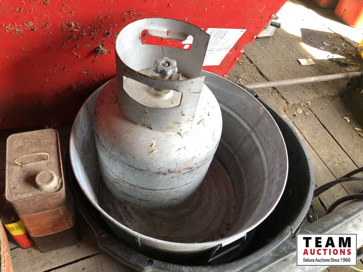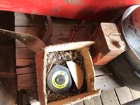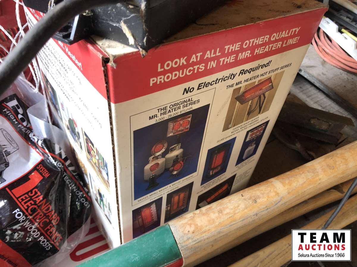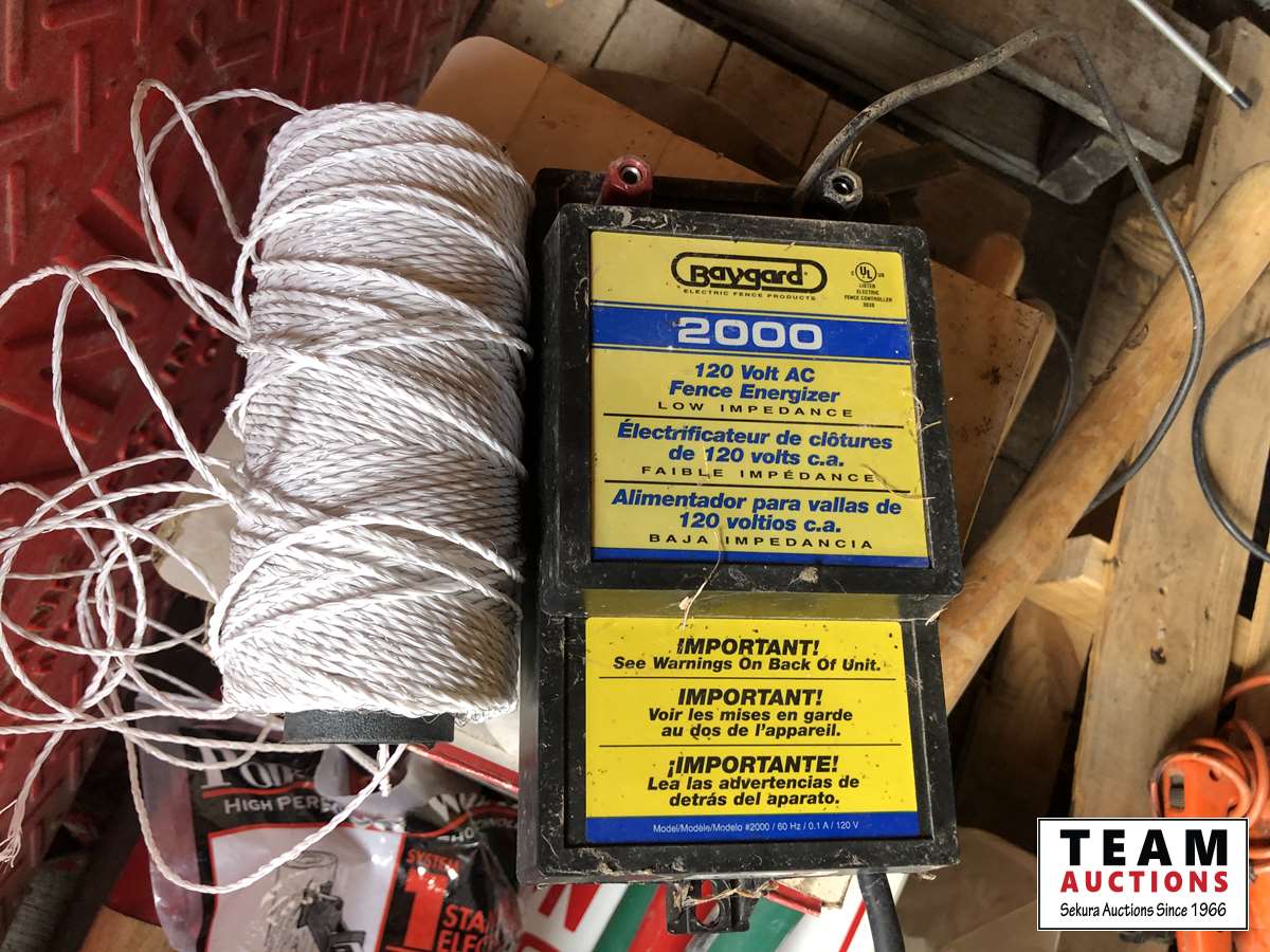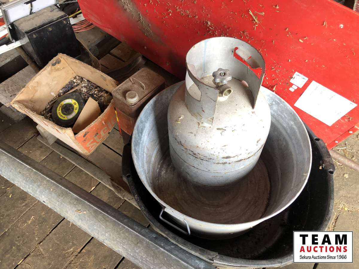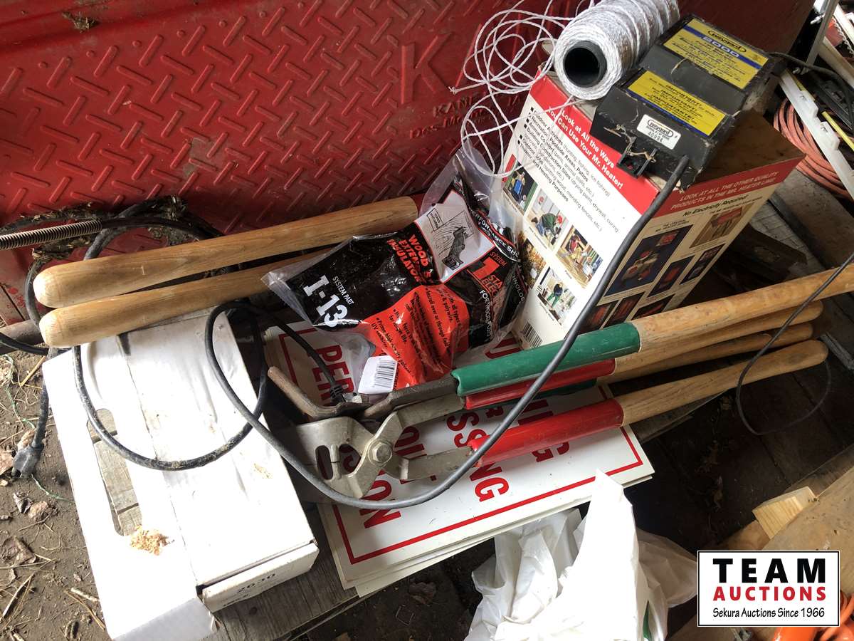 Baygard electric fencer, electric fence wire, Kane heated mat, poly & metal tubs, propane bottle, (2) horse hoof trimmers, propane Mr Heater, partial box of nails