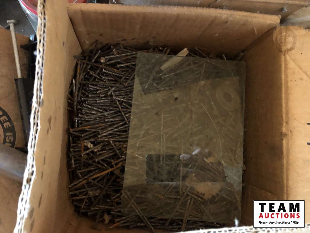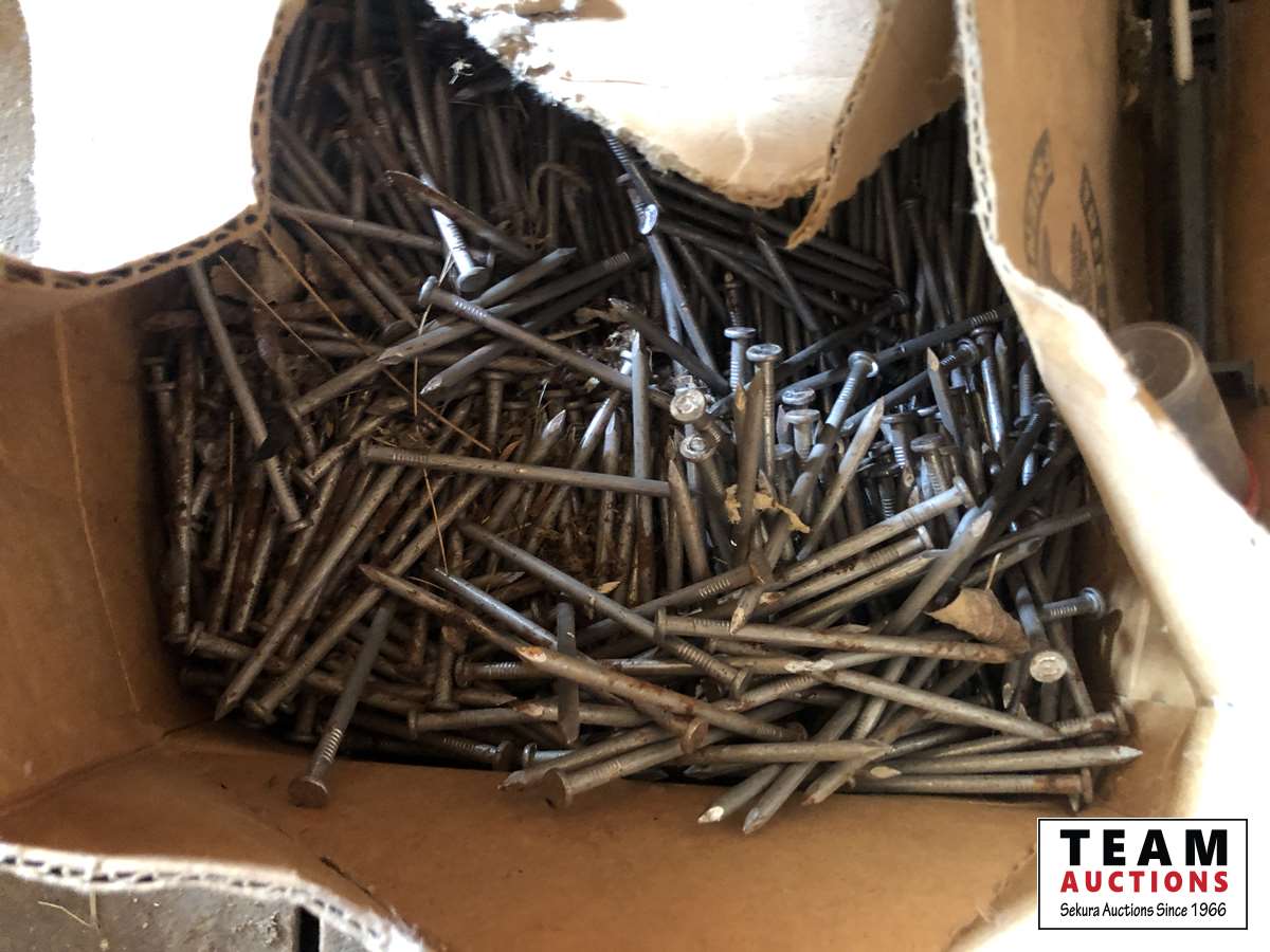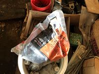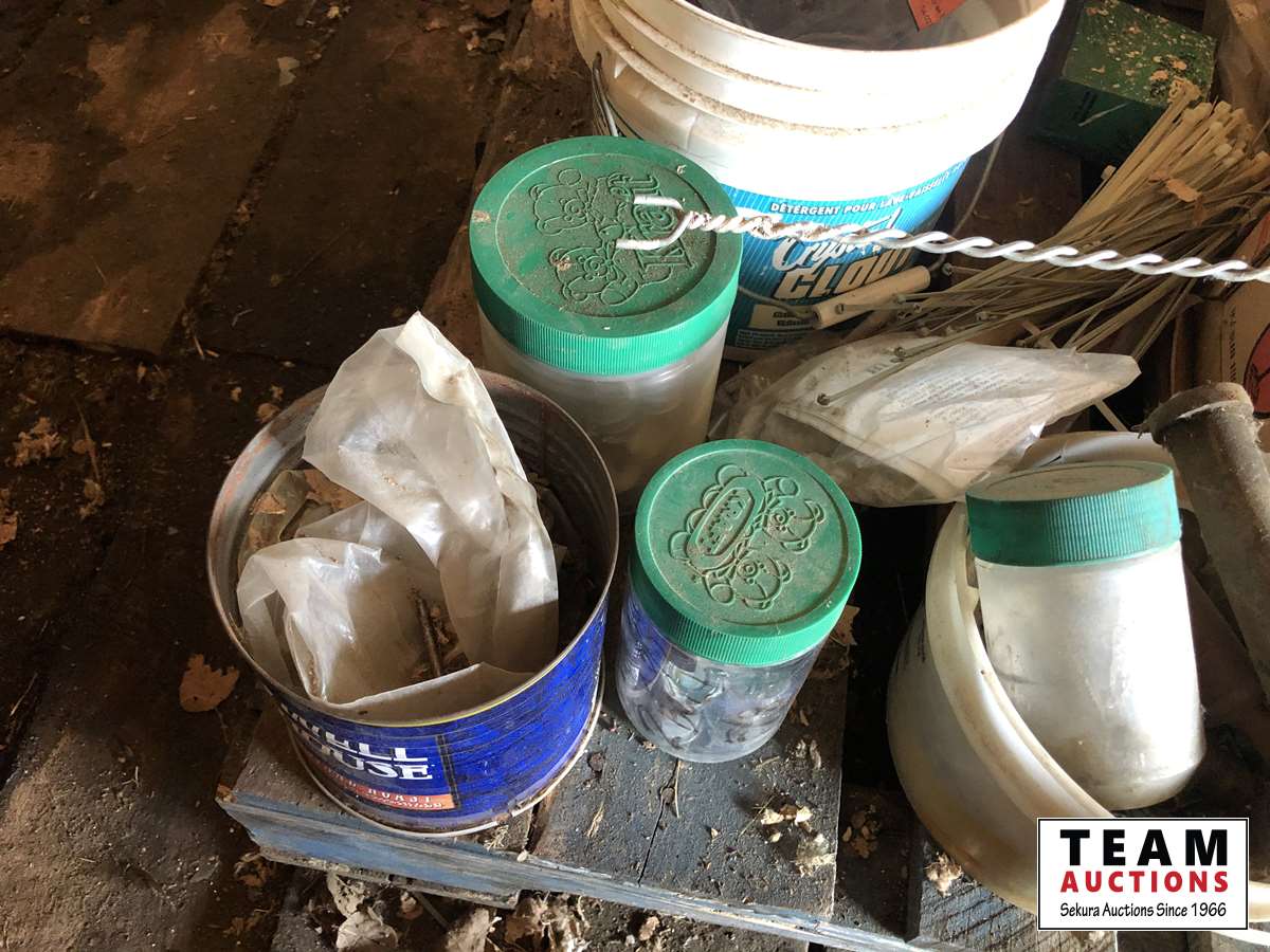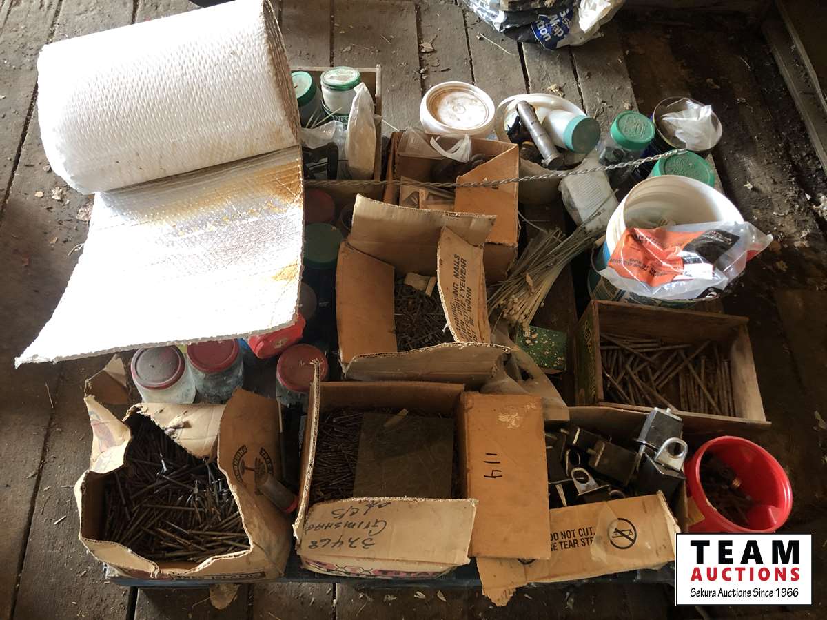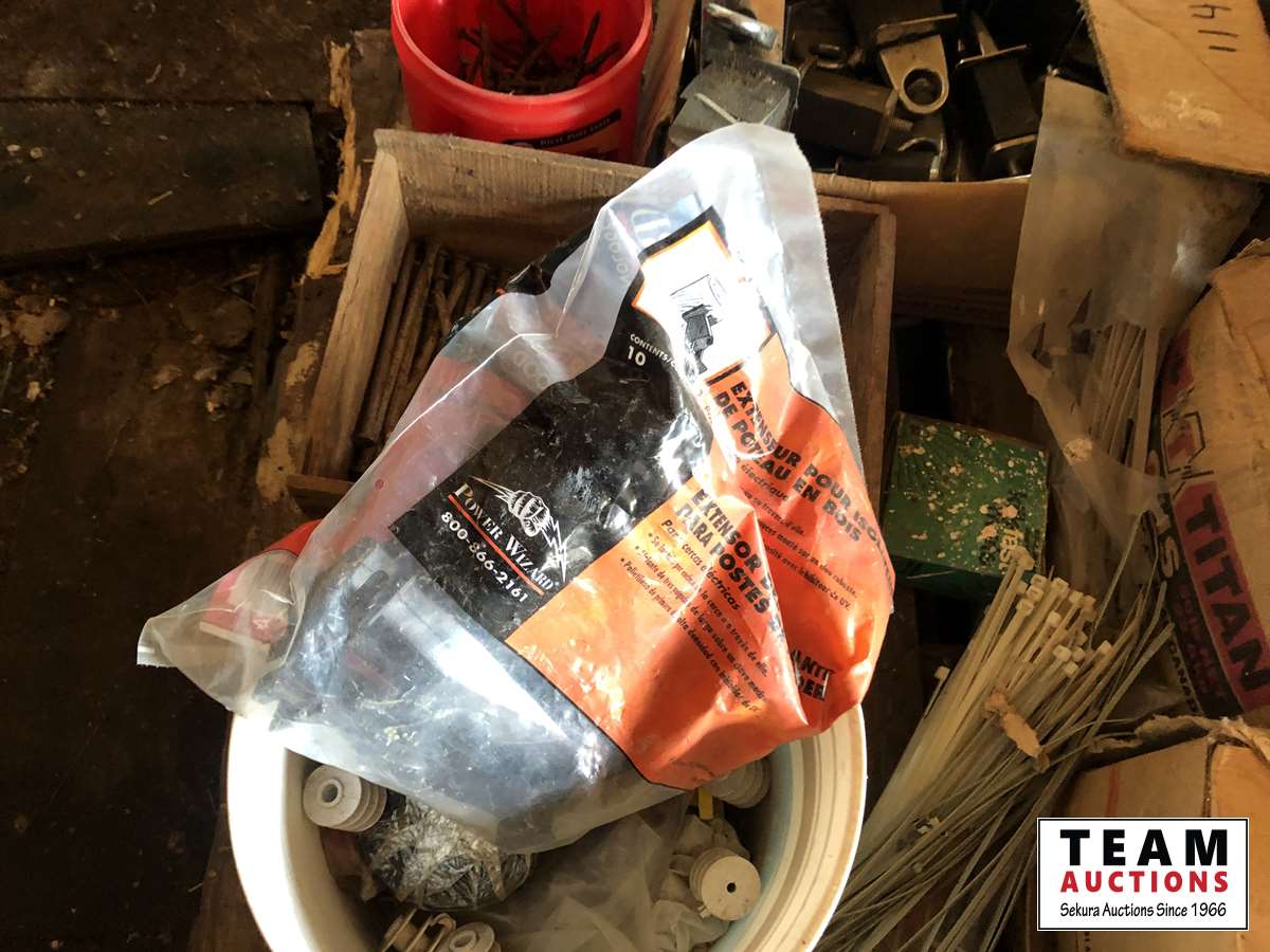 Tie down eyelets, zip ties, fence staples, several partial boxes of nails, insulation wrap