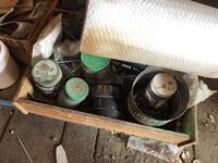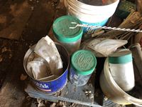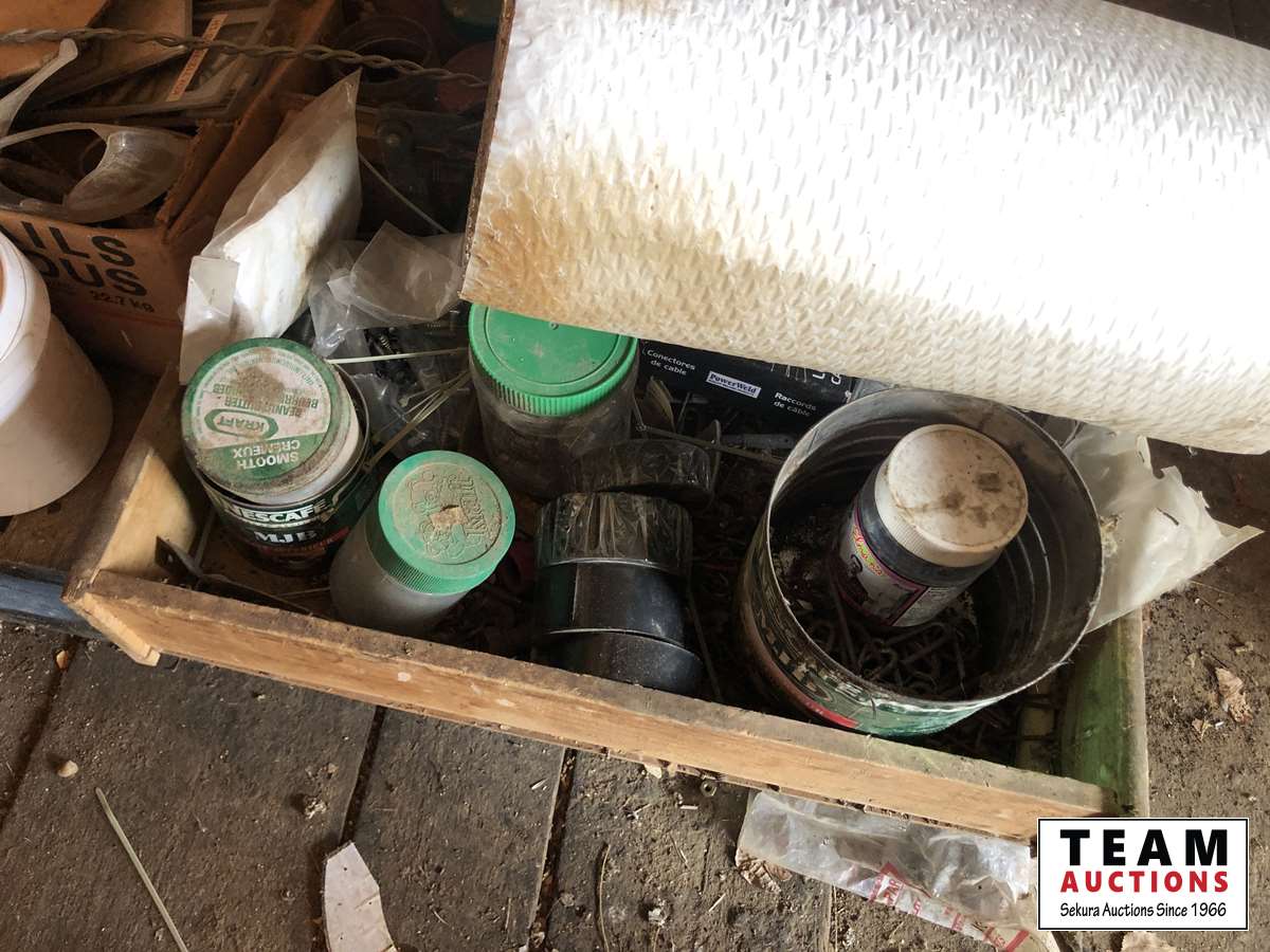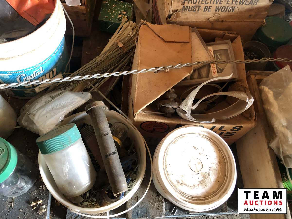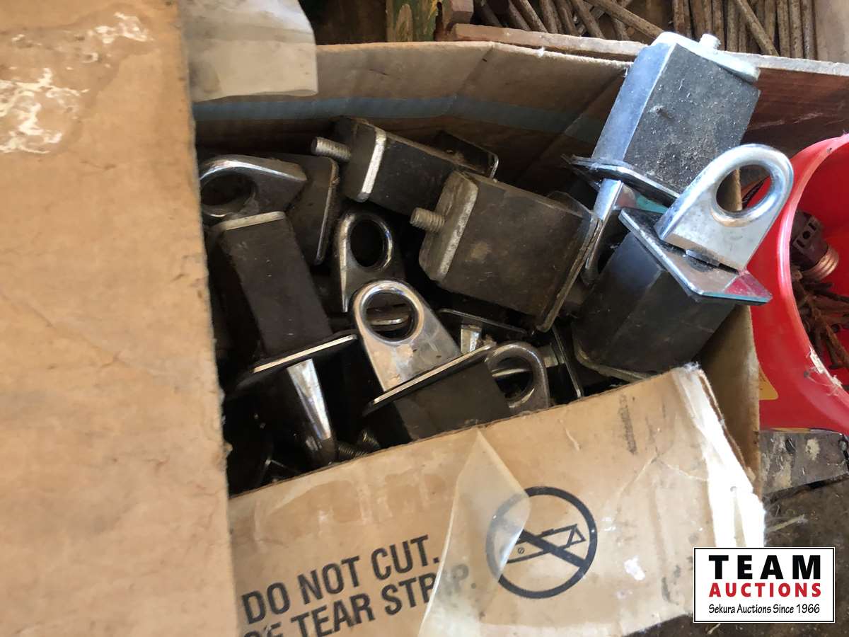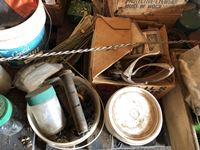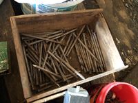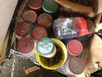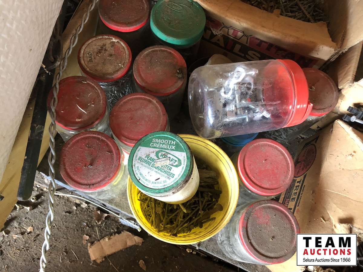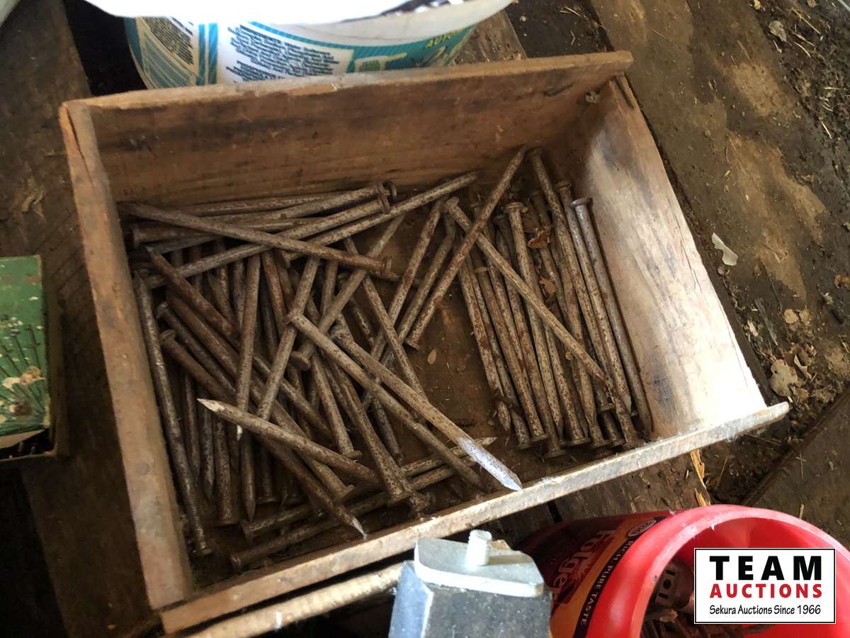 Tie down eyelets, zip ties, fence staples, several partial boxes of nails, insulation wrap