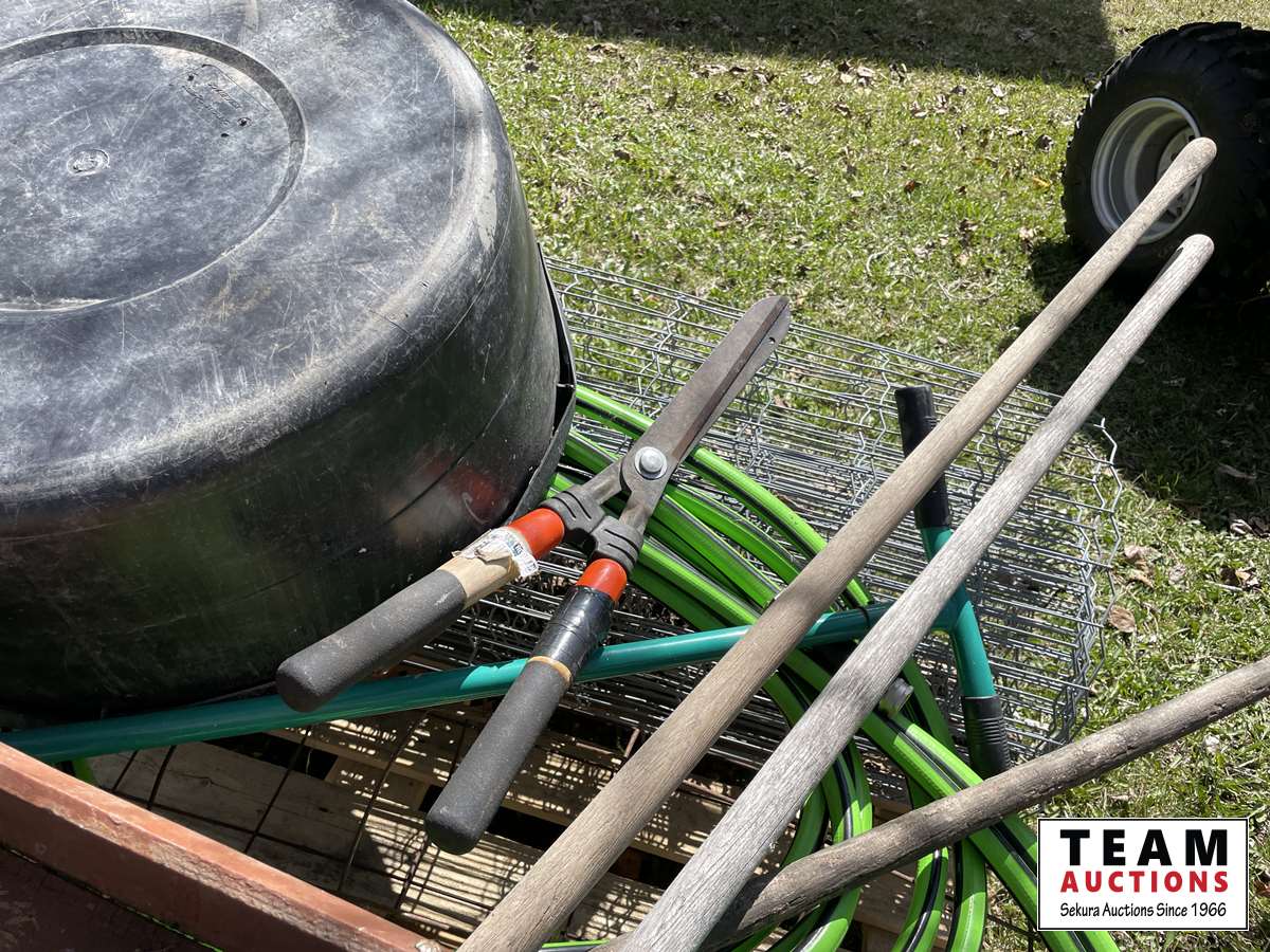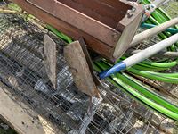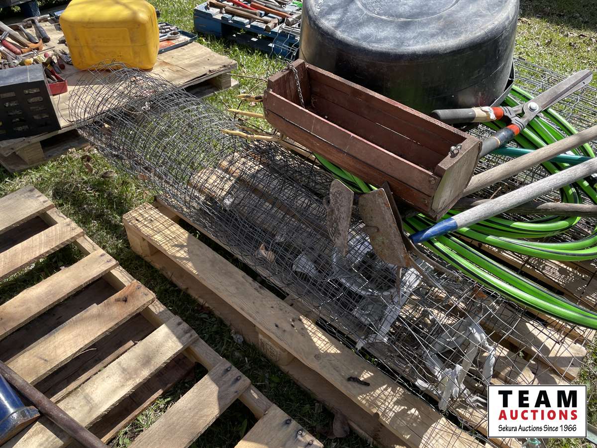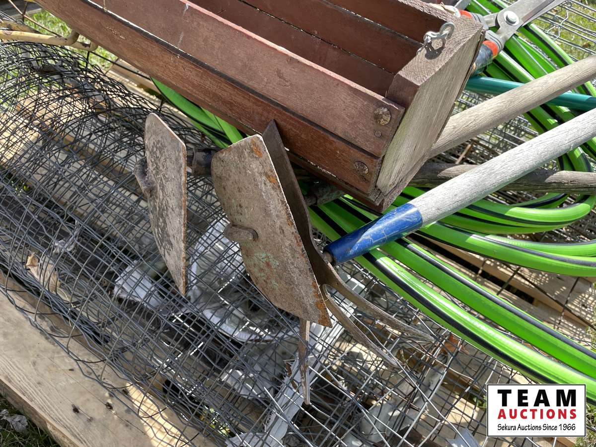 Partial roll of page wire, weed removal tool, (3) hoes, garden hose, poly tub