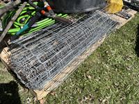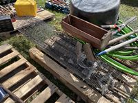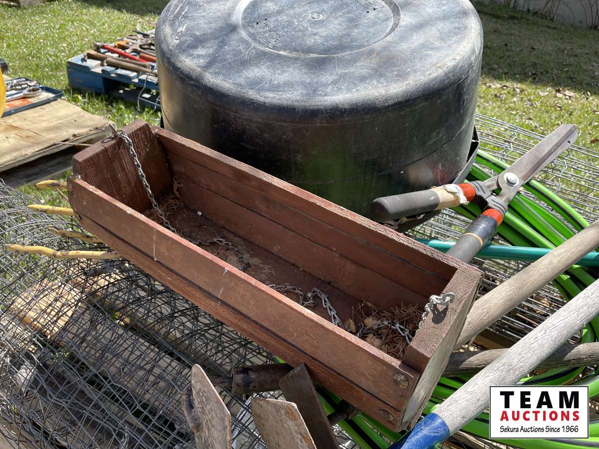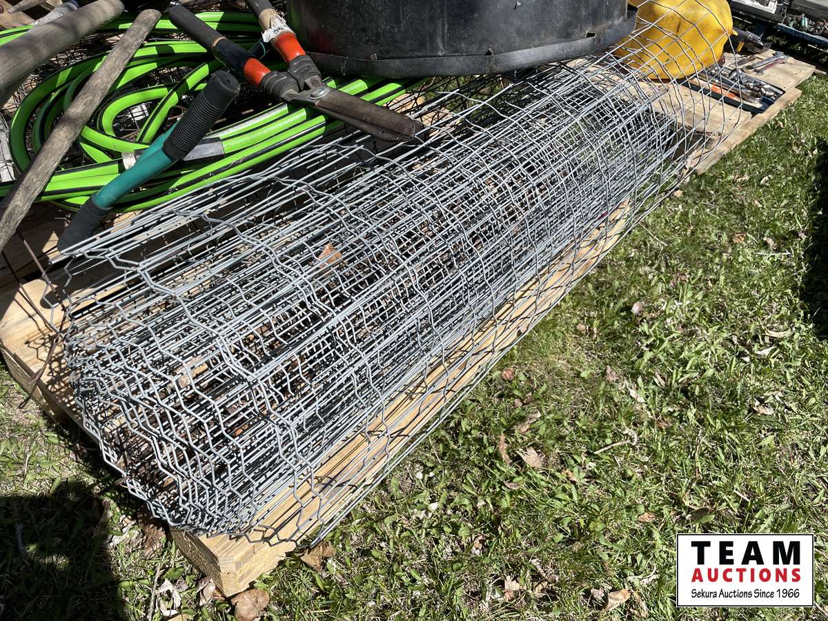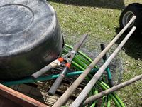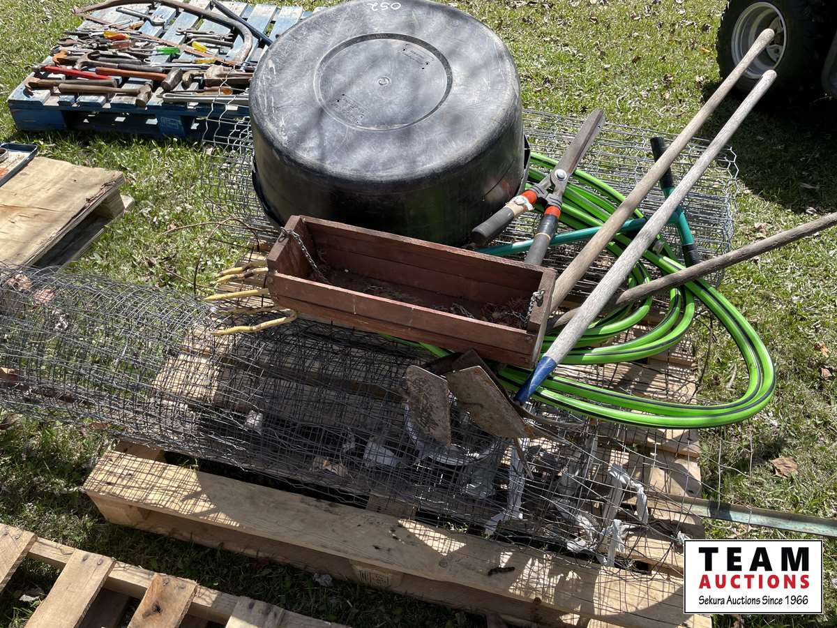 Partial roll of page wire, weed removal tool, (3) hoes, garden hose, poly tub