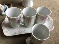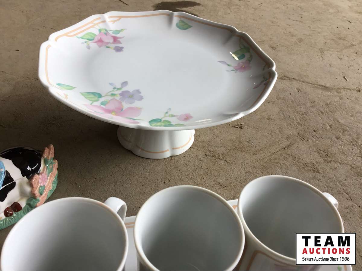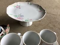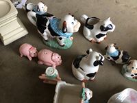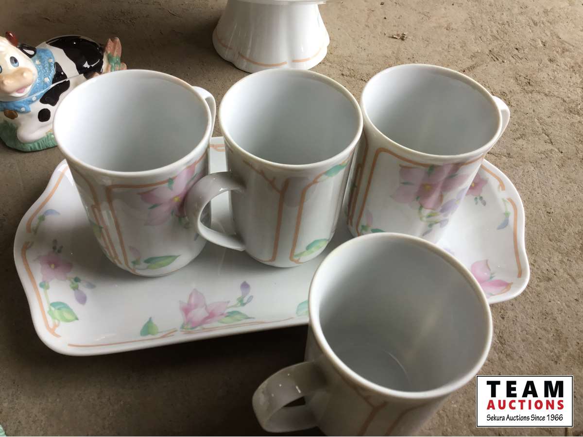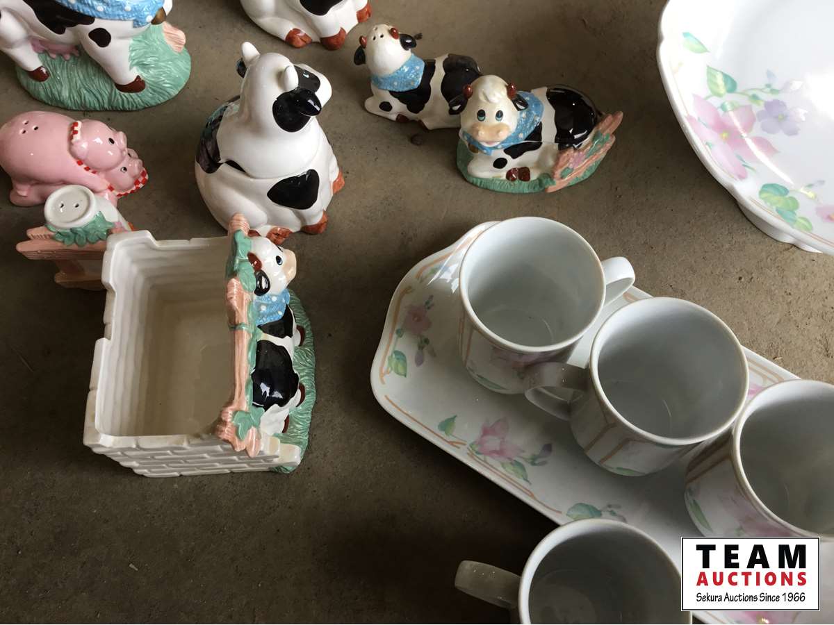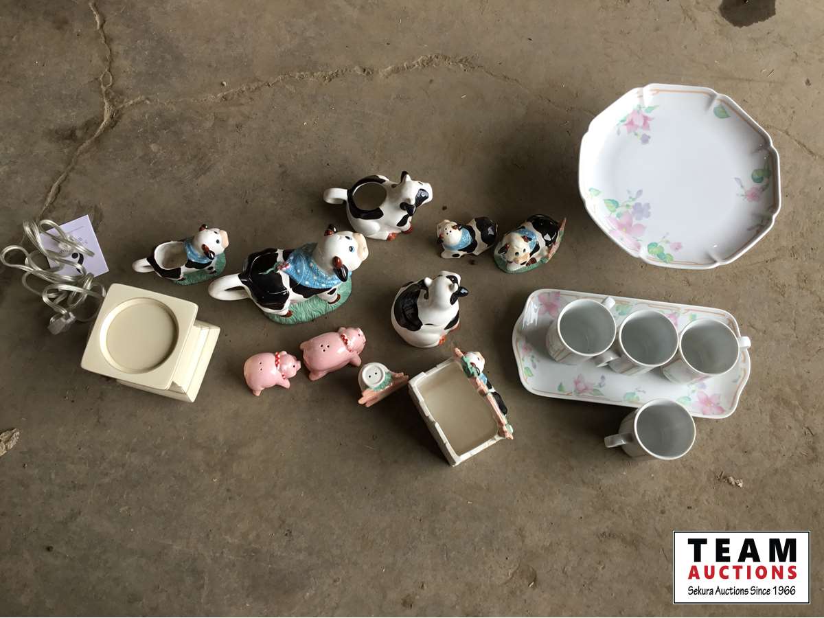 Porcelain cow tea set, salt & pepper shakers, napkin holder, porcelain tea cups and serving plates