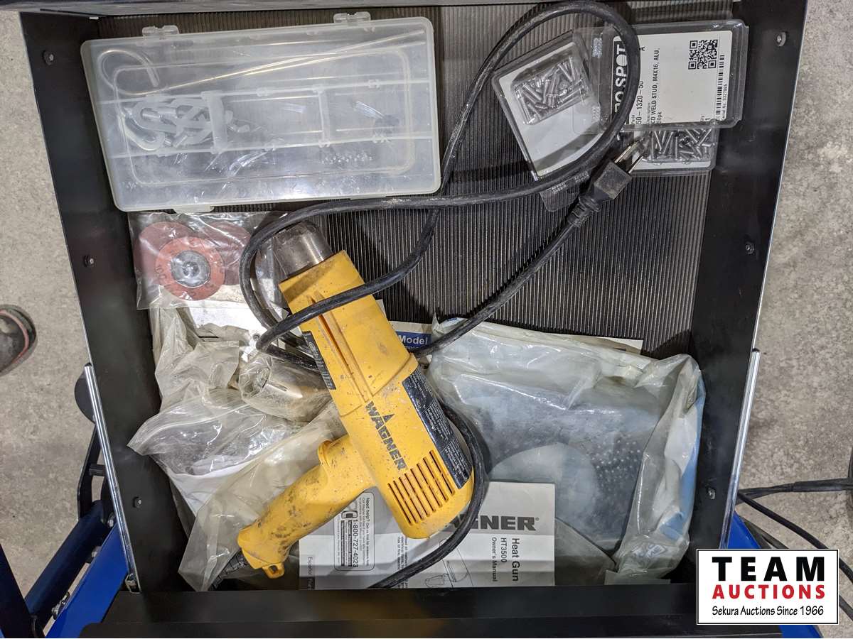 With aluminum pulling system, Wagner heat gun, auto body hammers, Pro Shot Pro Pull