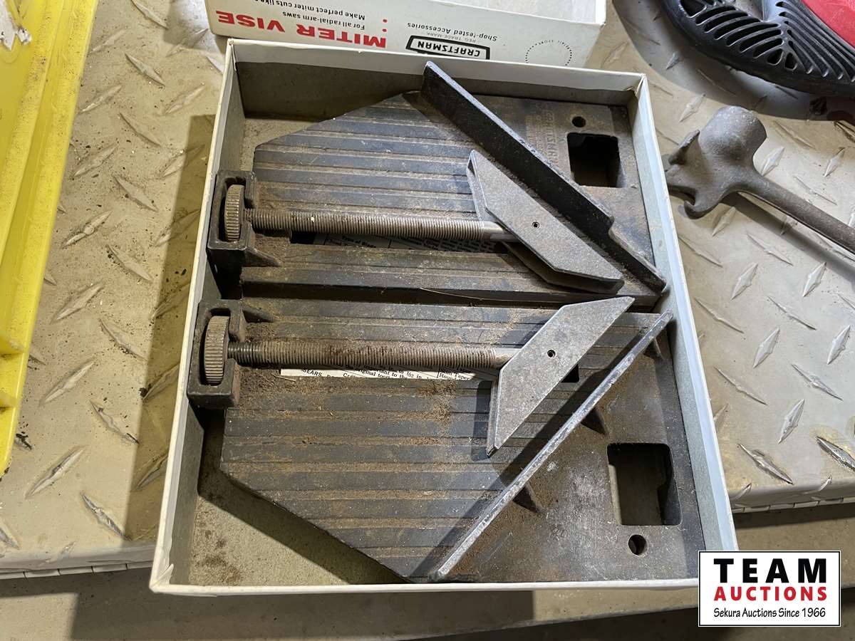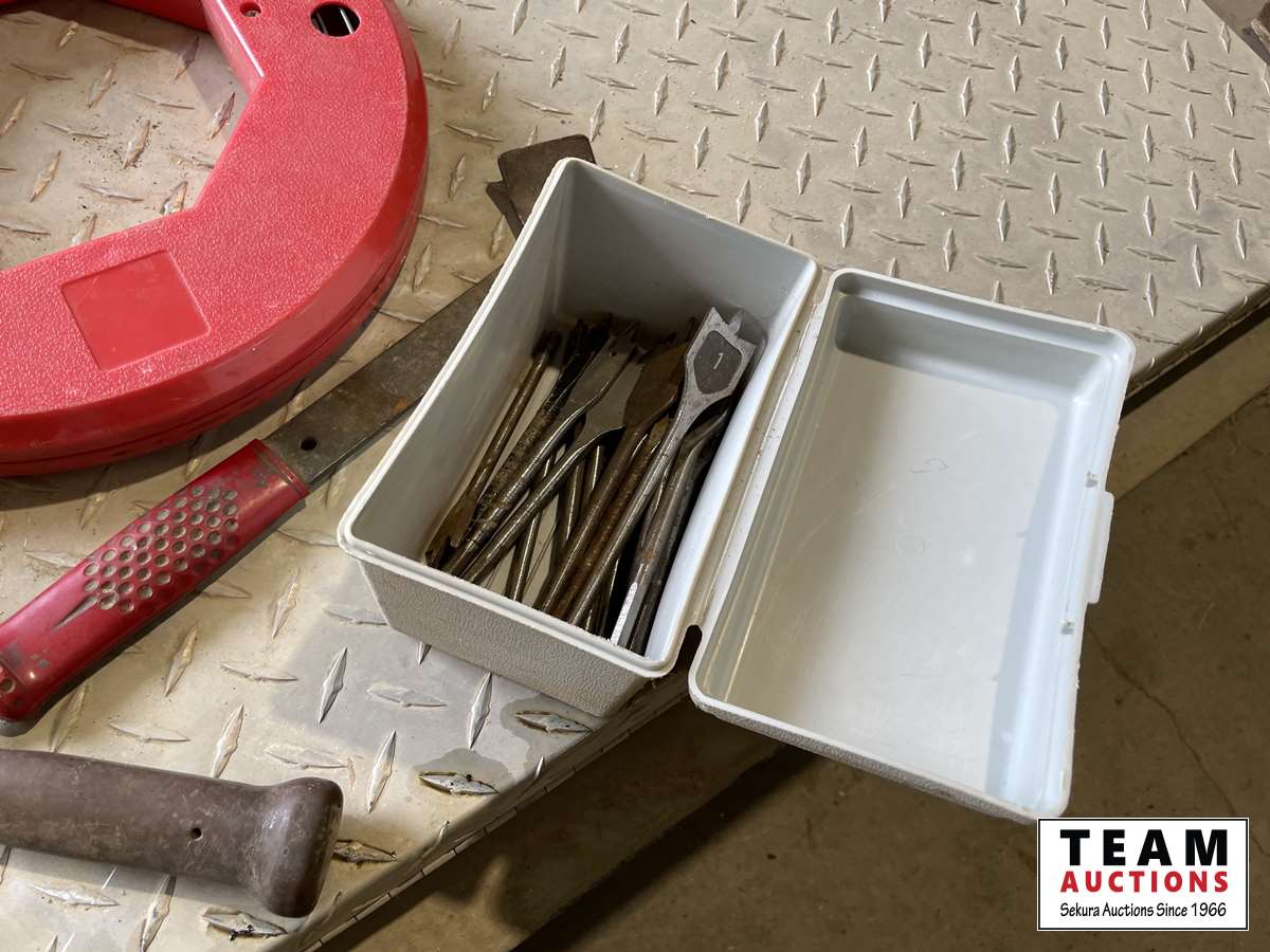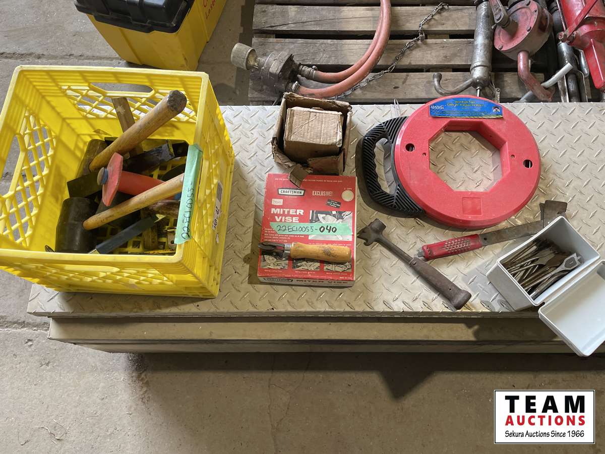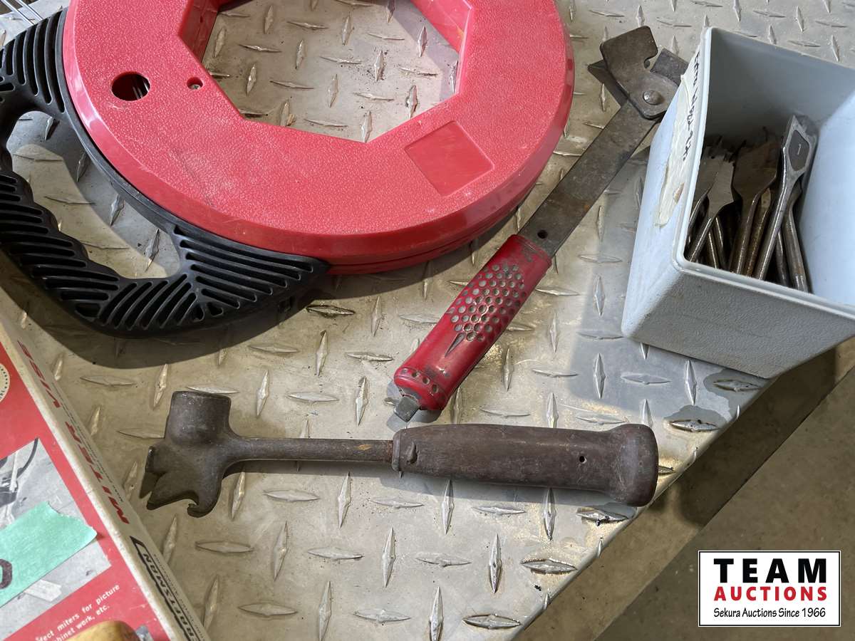 Miter vise, fishing tape, bits, hammers, miscellaneous