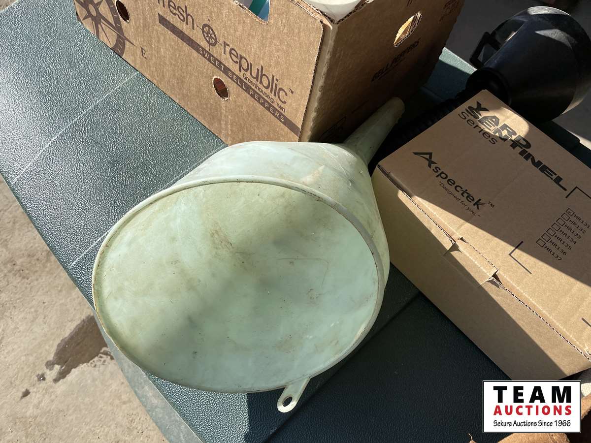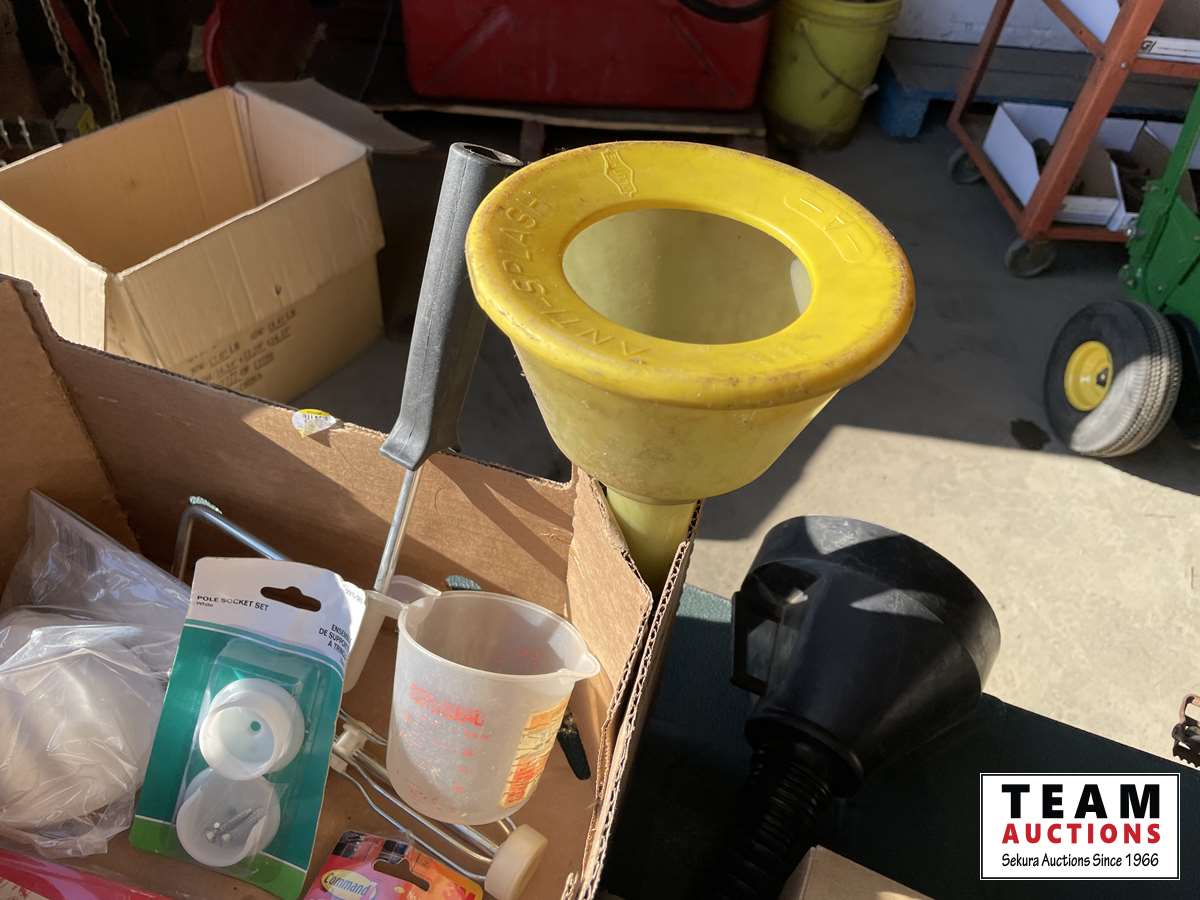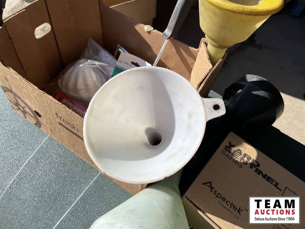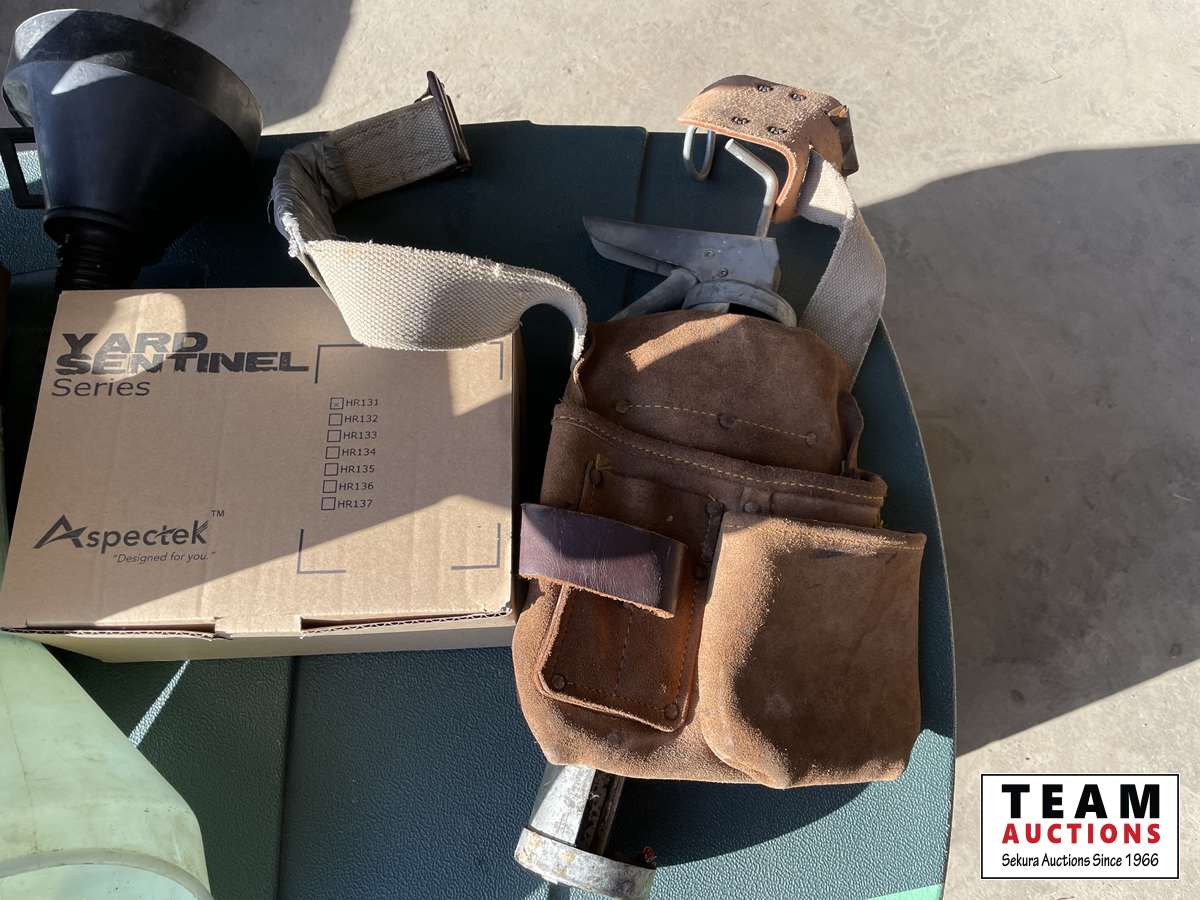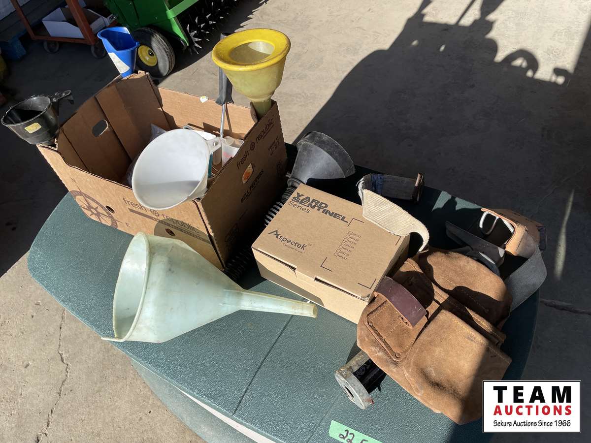 Funnels, tool belt, caulking gin, hooks, pest repellor