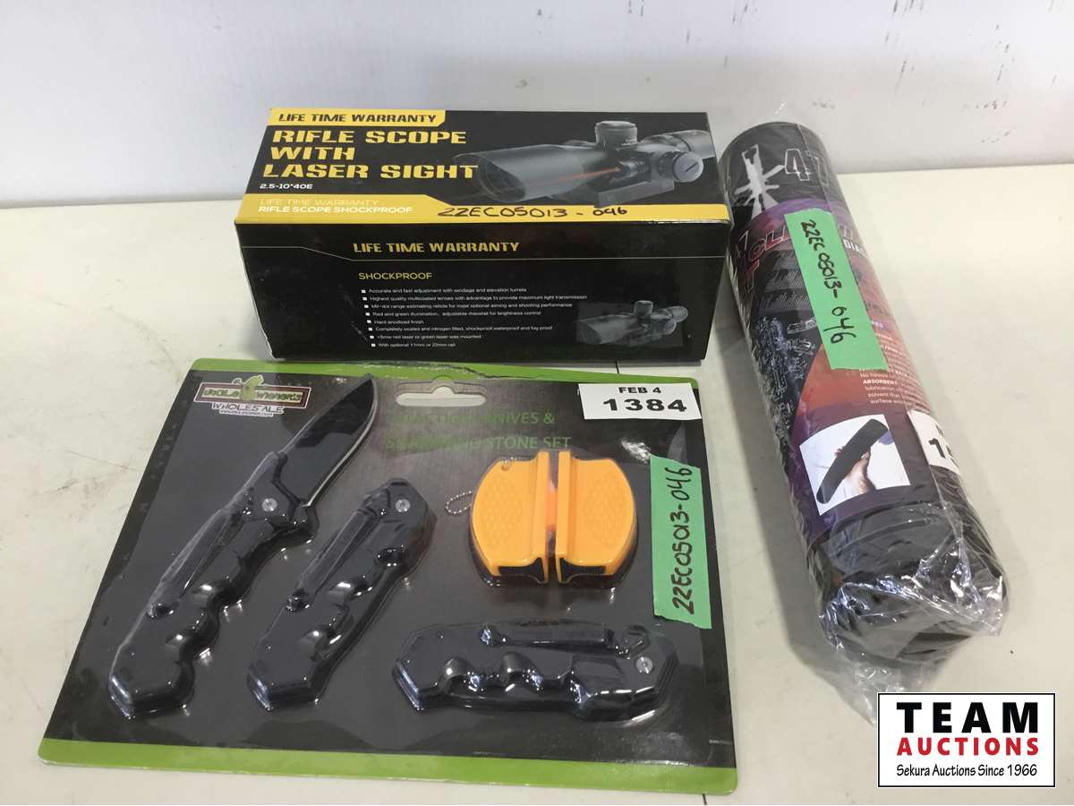2584 Rifle Scope, Gun Cleaning Mat and Knife Kit (Unused)