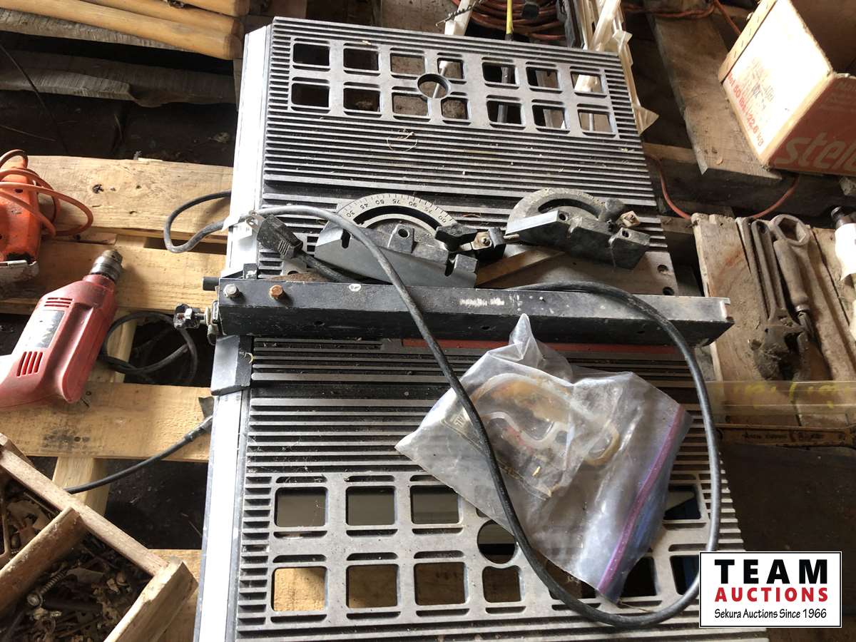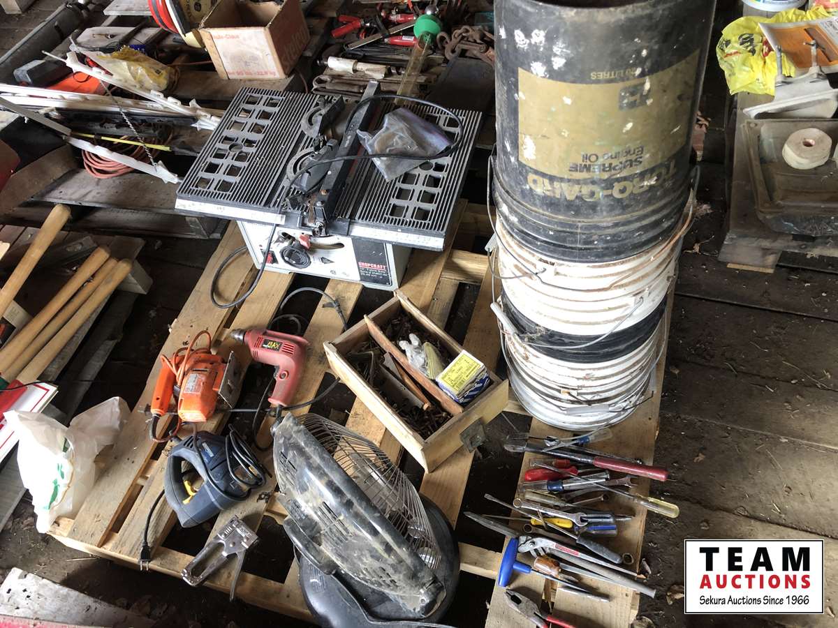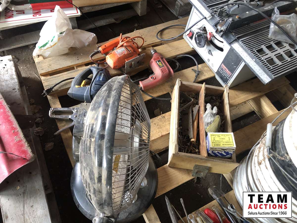 Shopcraft 10 inch table saw, spool of electric fence wire, jig saws, space heater, box of screws, assorted hand tools