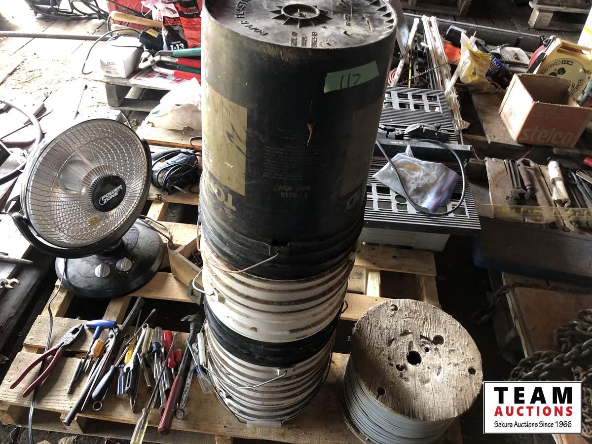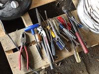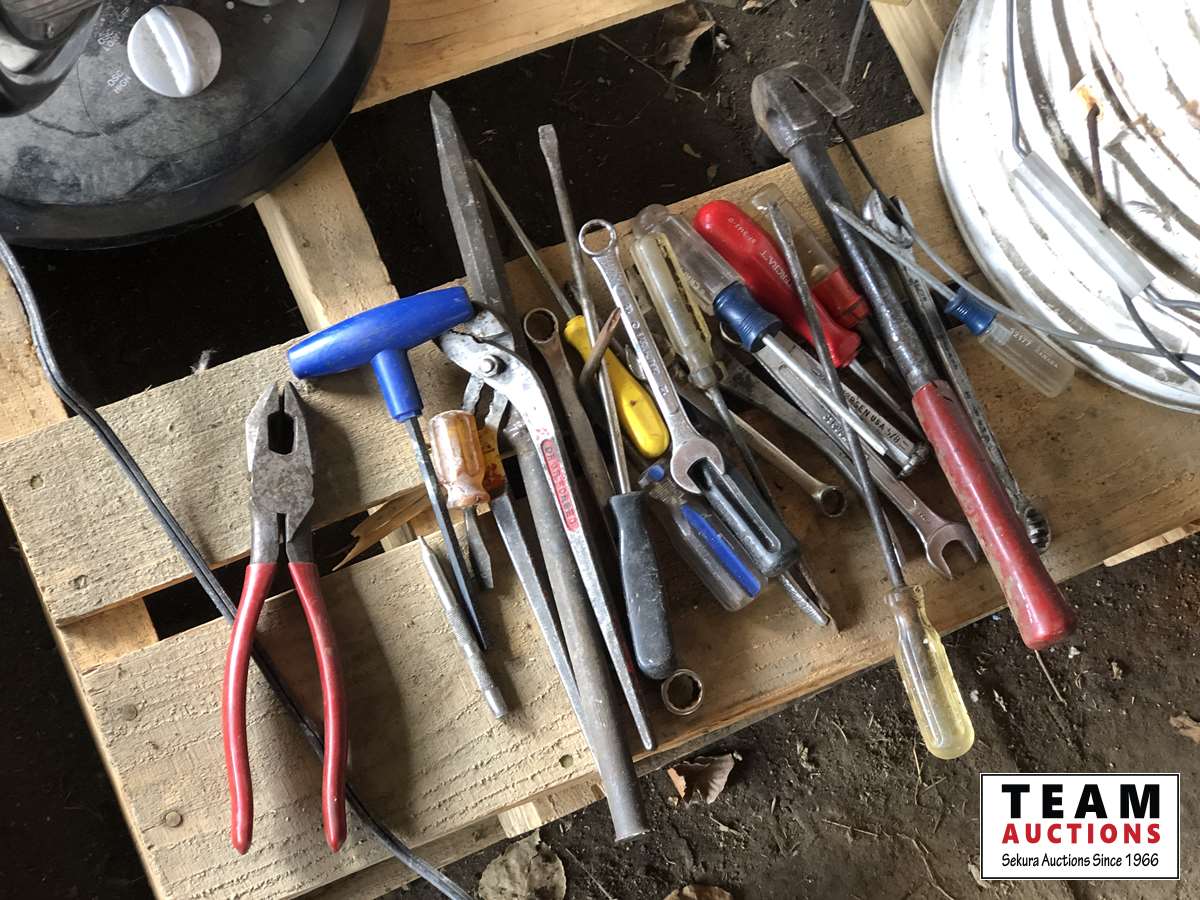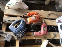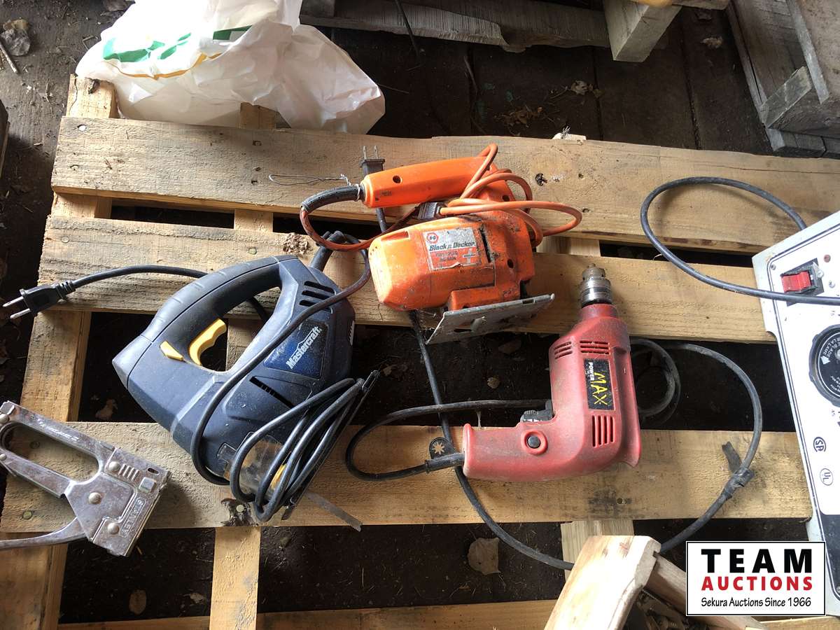 Shopcraft 10 inch table saw, spool of electric fence wire, jig saws, space heater, box of screws, assorted hand tools