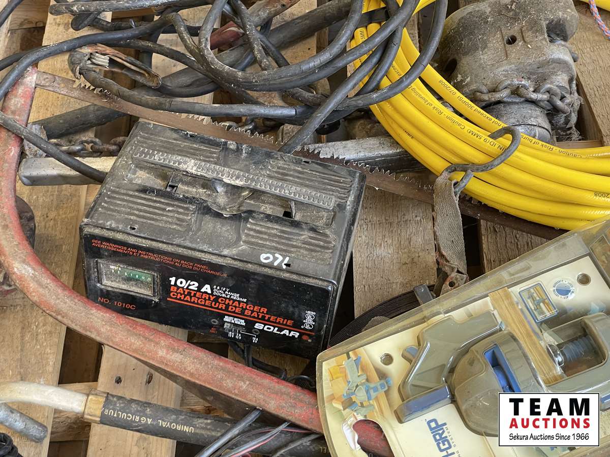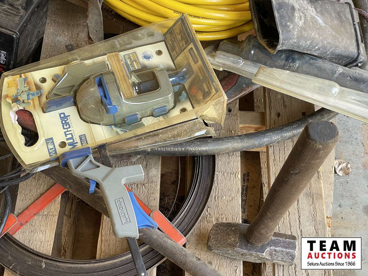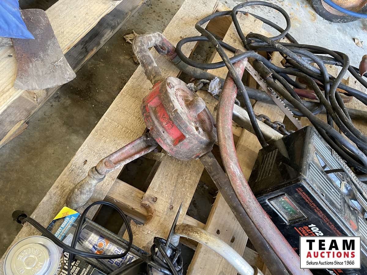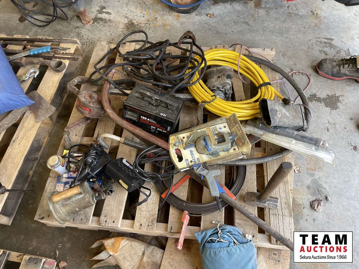 Battery charger, booster cables, air hose, hand clamp, torch, sewer snake, hand barrel pump, come-a-long, hammer, miscellaneous