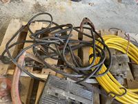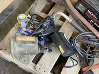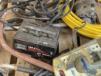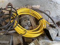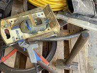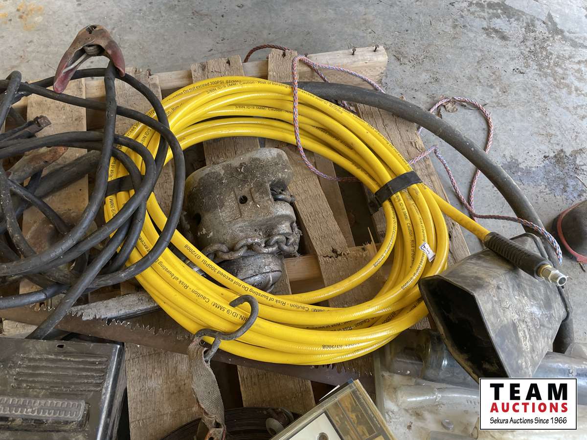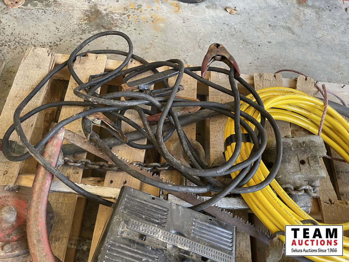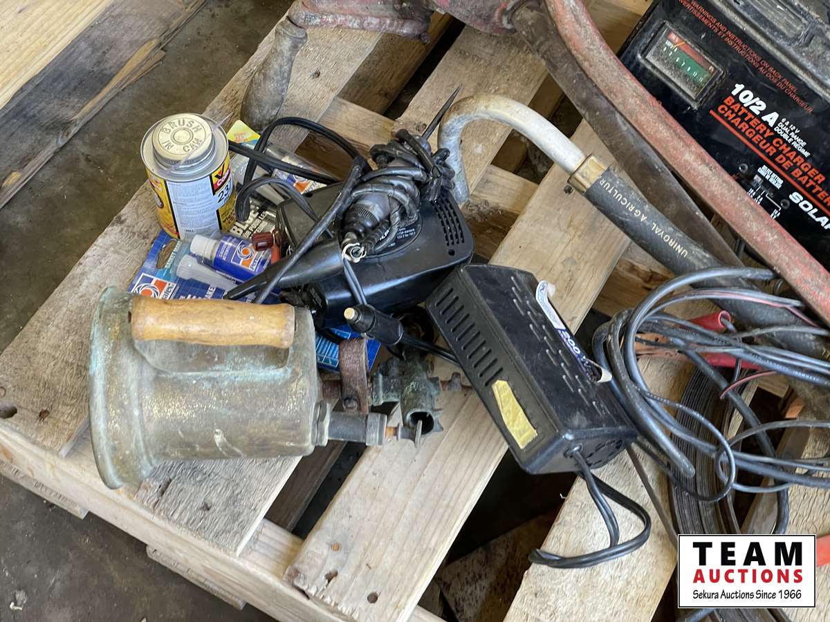 Battery charger, booster cables, air hose, hand clamp, torch, sewer snake, hand barrel pump, come-a-long, hammer, miscellaneous