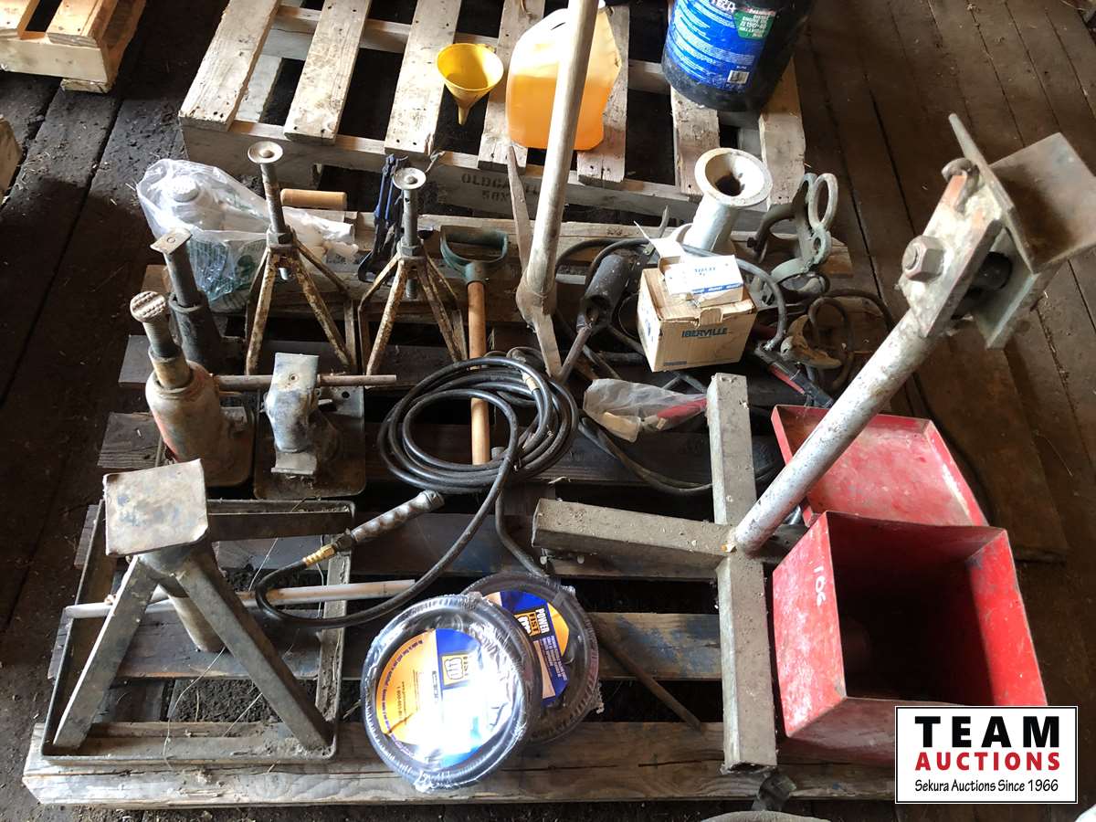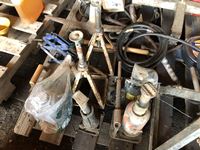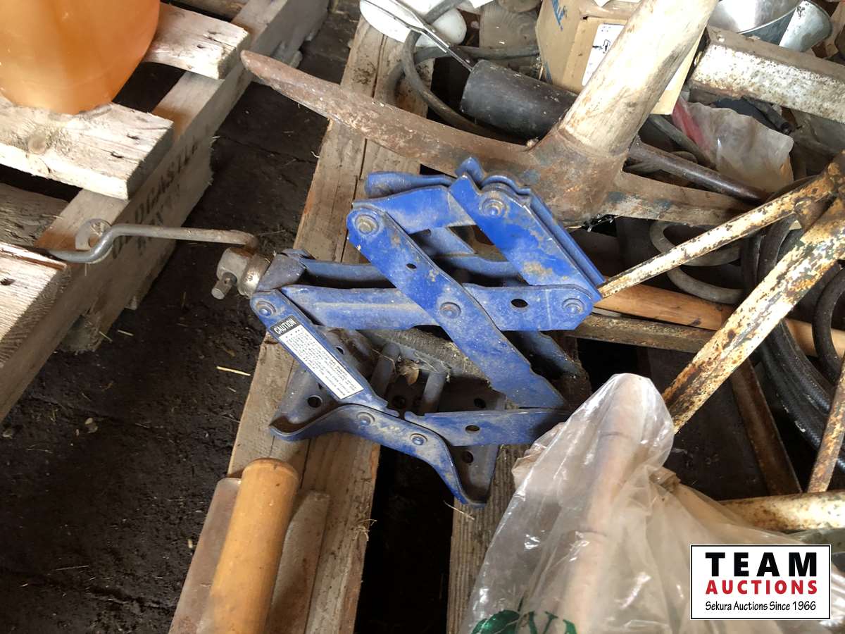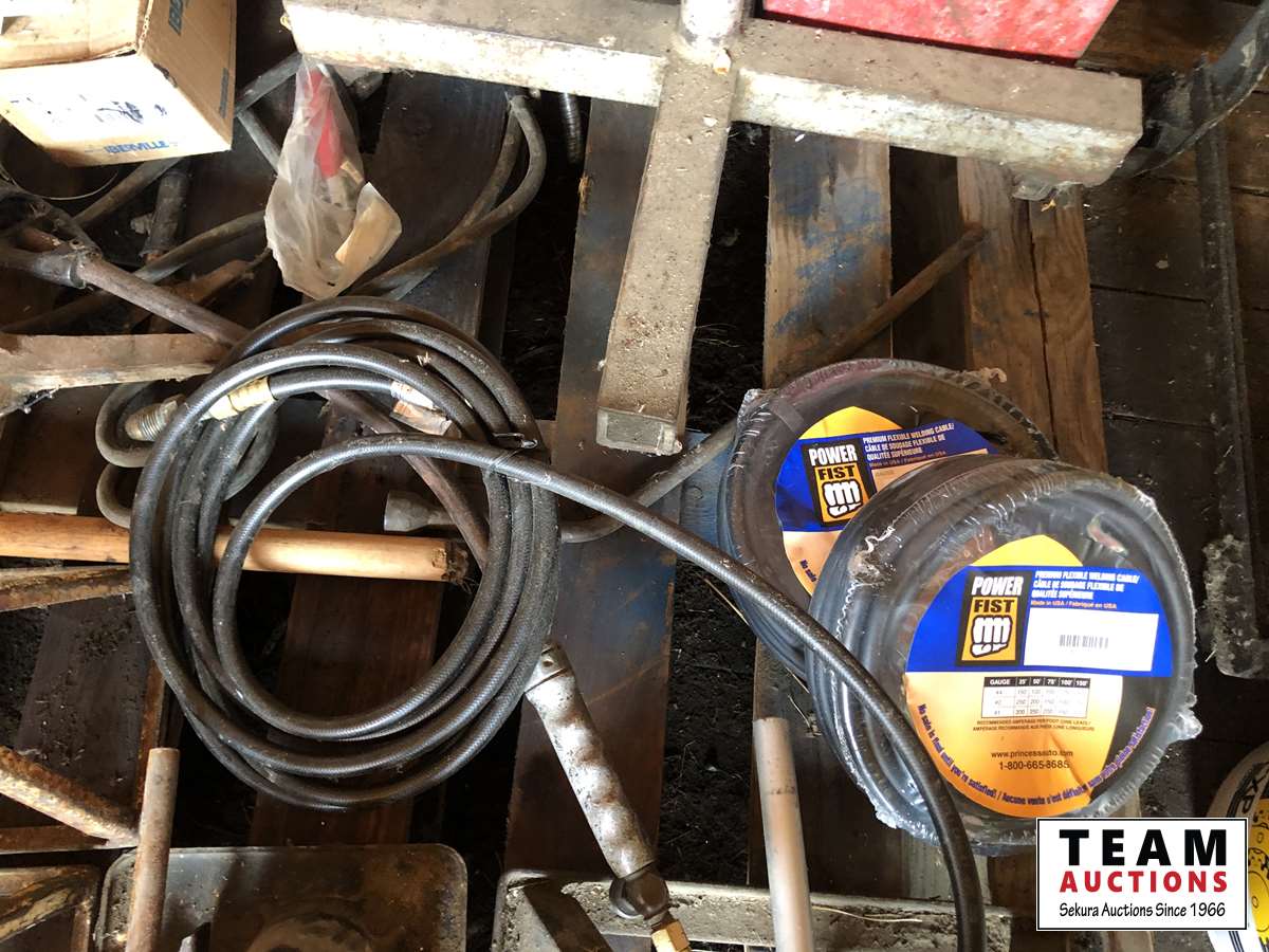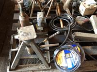 Welding cable unused, tiger torch, booster cables, bottle jacks, jack stands, pick axe, miscellaneous