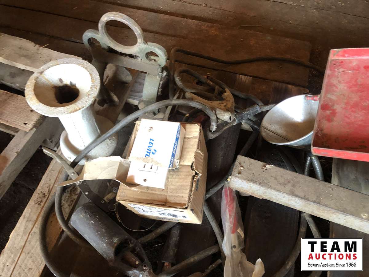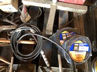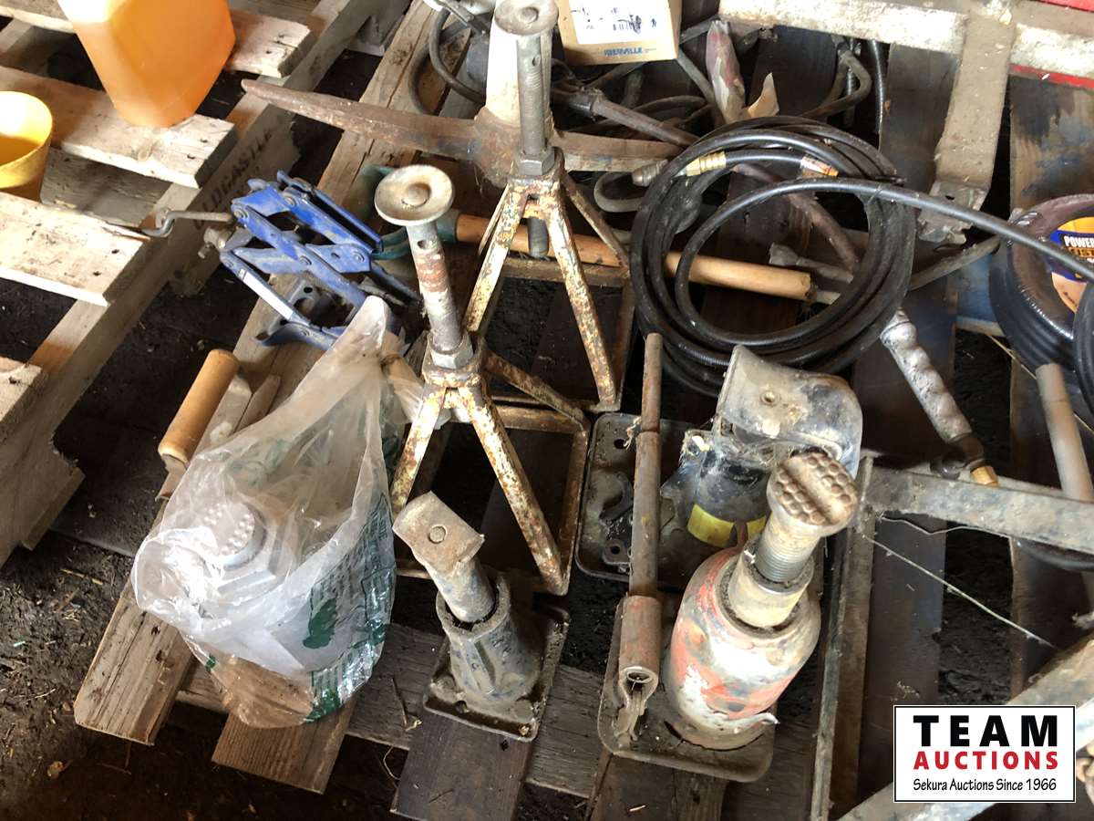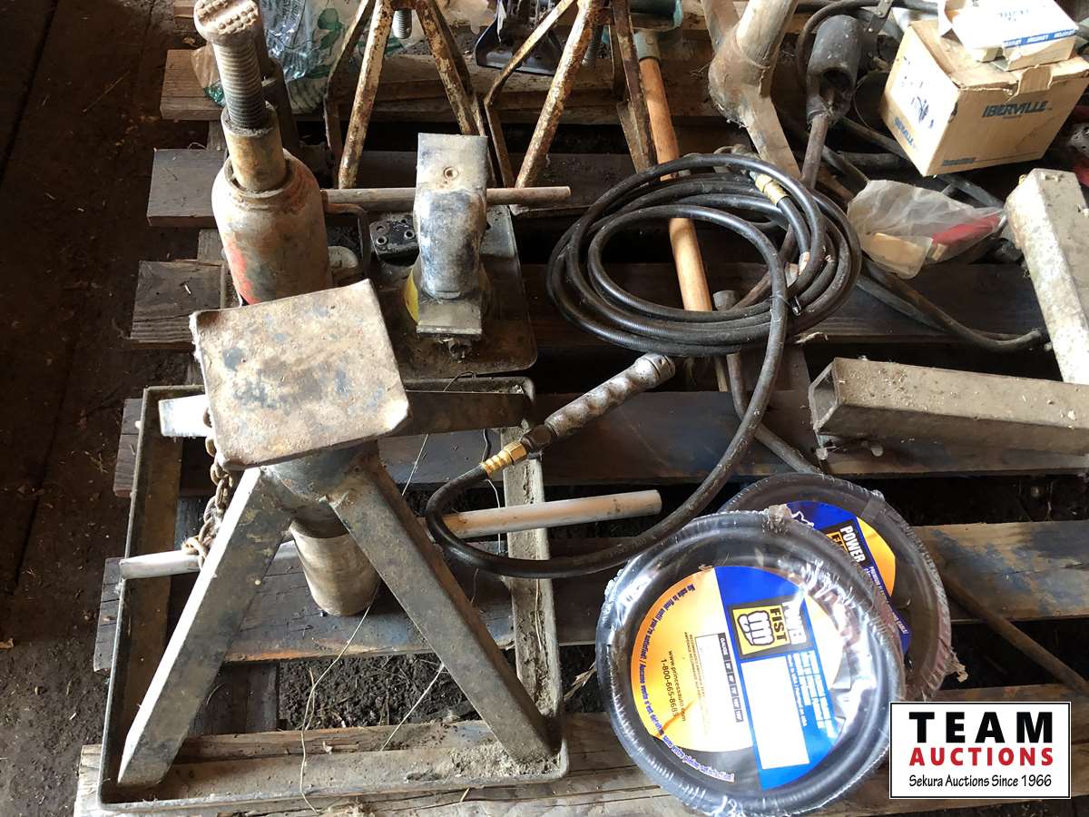Welding cable unused, tiger torch, booster cables, bottle jacks, jack stands, pick axe, miscellaneous
