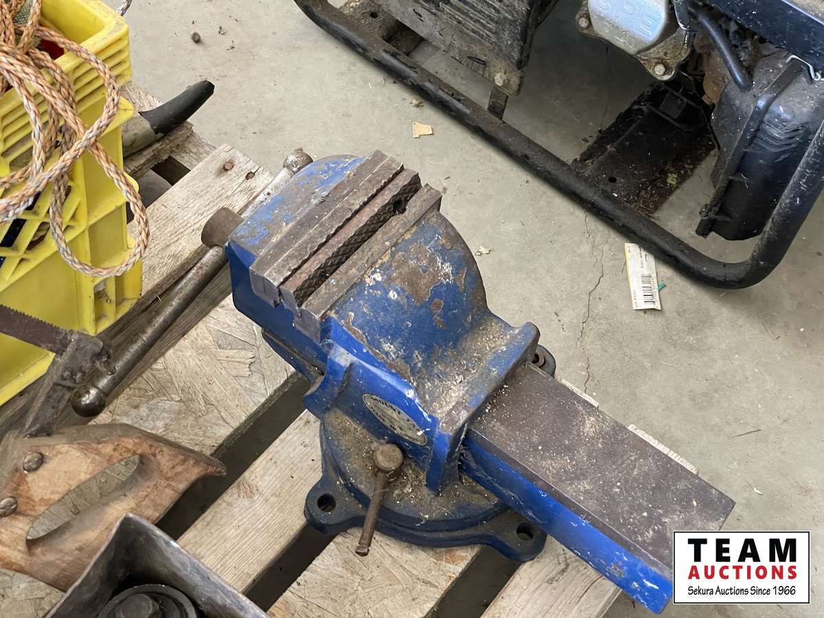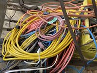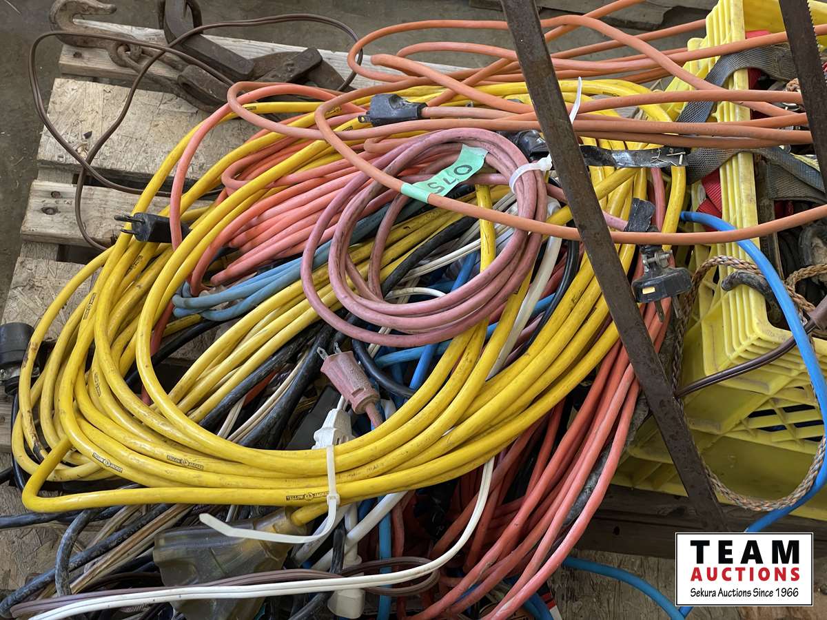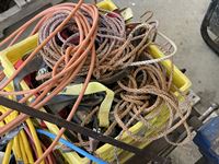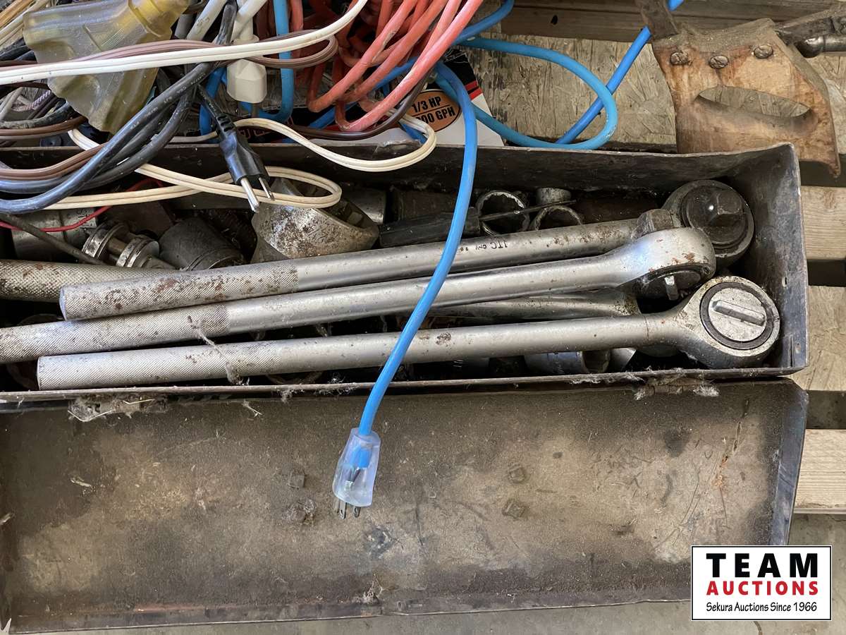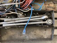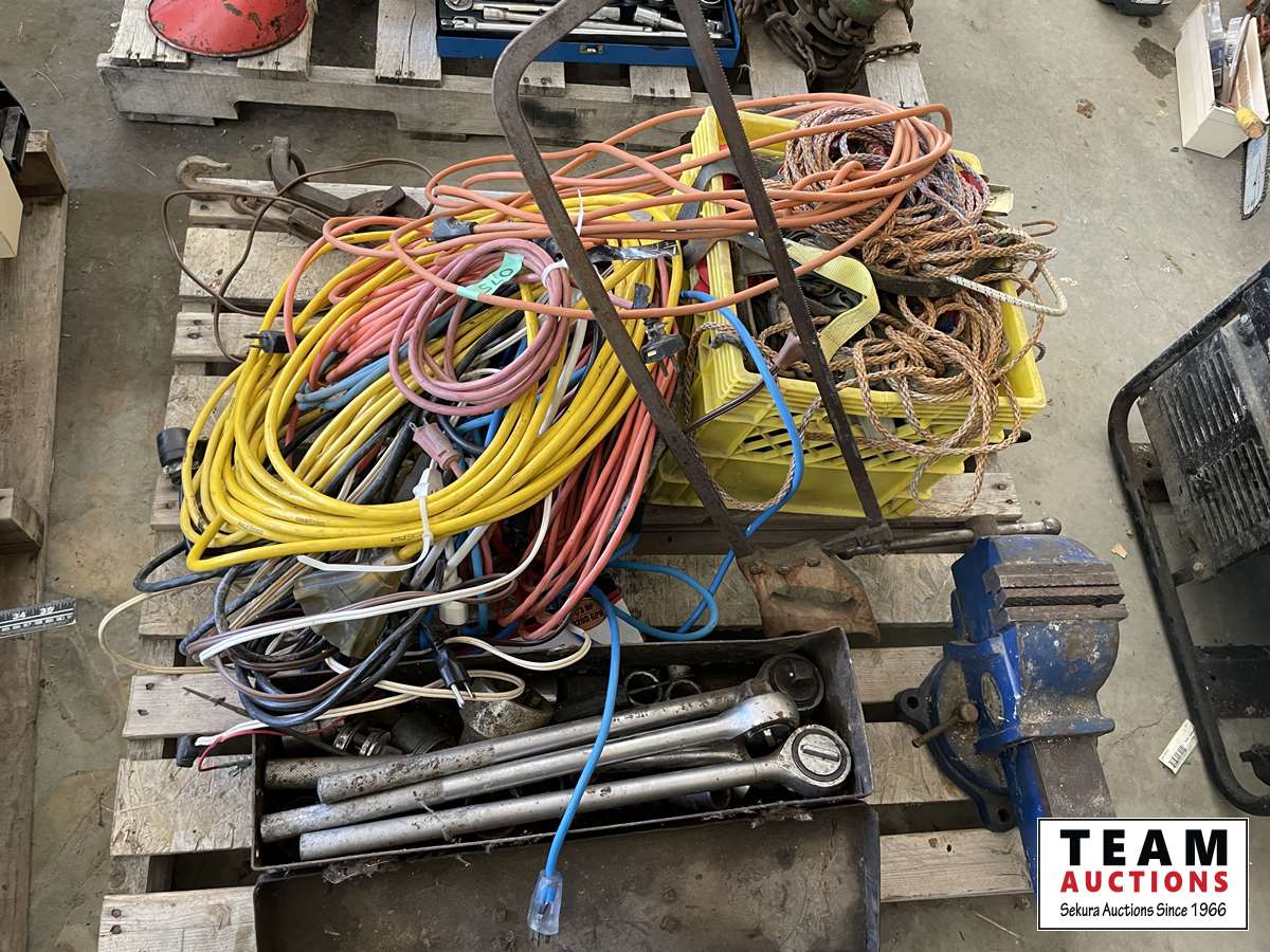 Extension cords, box of rope ratchets, post mall with no handle, 5 inch vise, 3/4 sockets & ratchet, miscellaneous