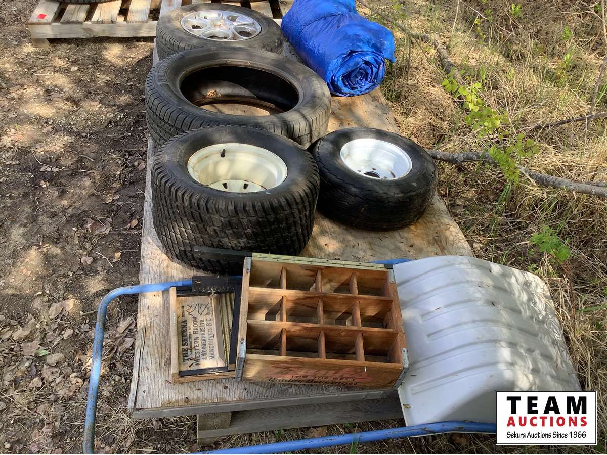 2379 (4) Miscellaneous Tires, Rims, Snow Shovel, Tarp