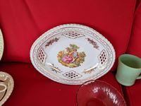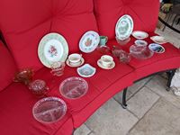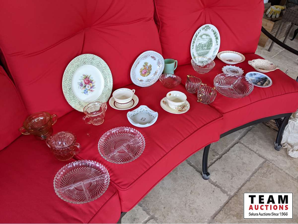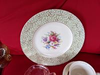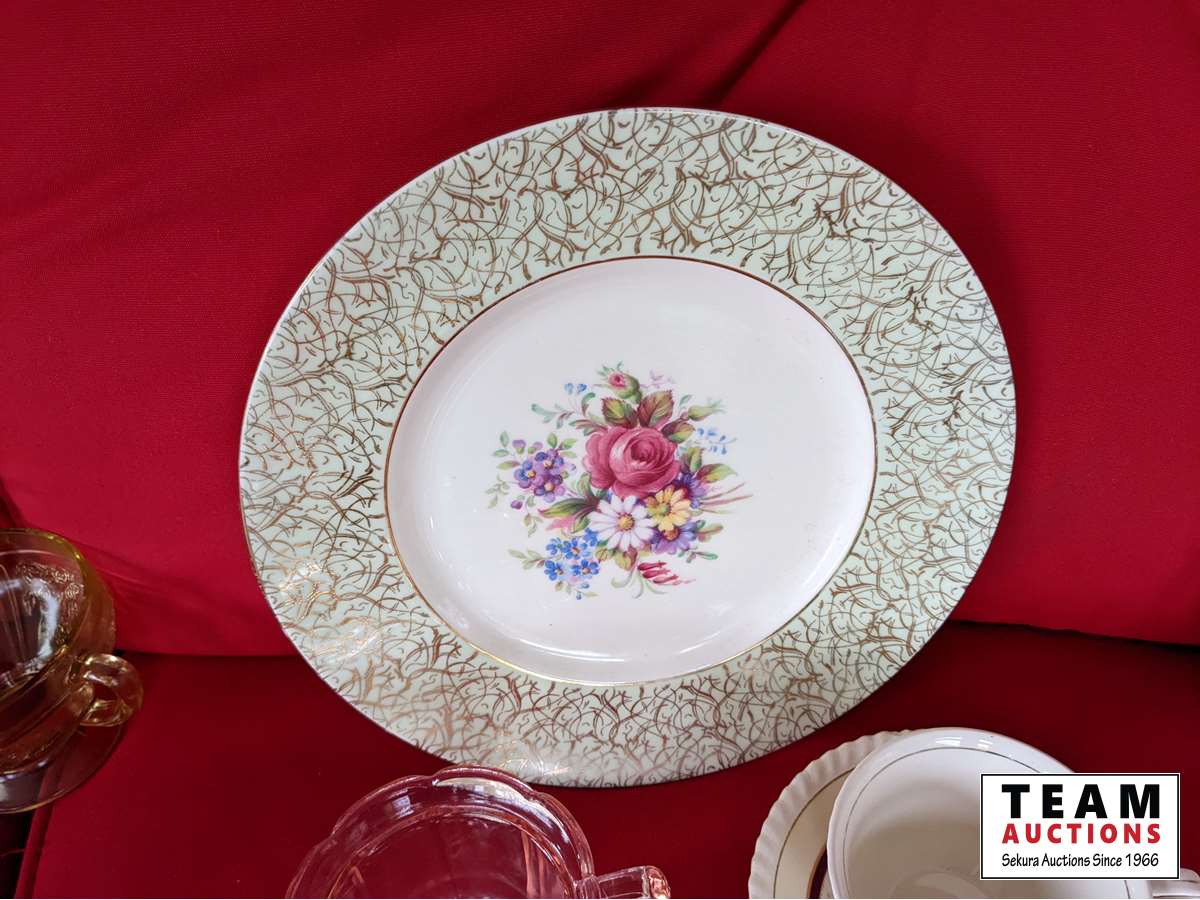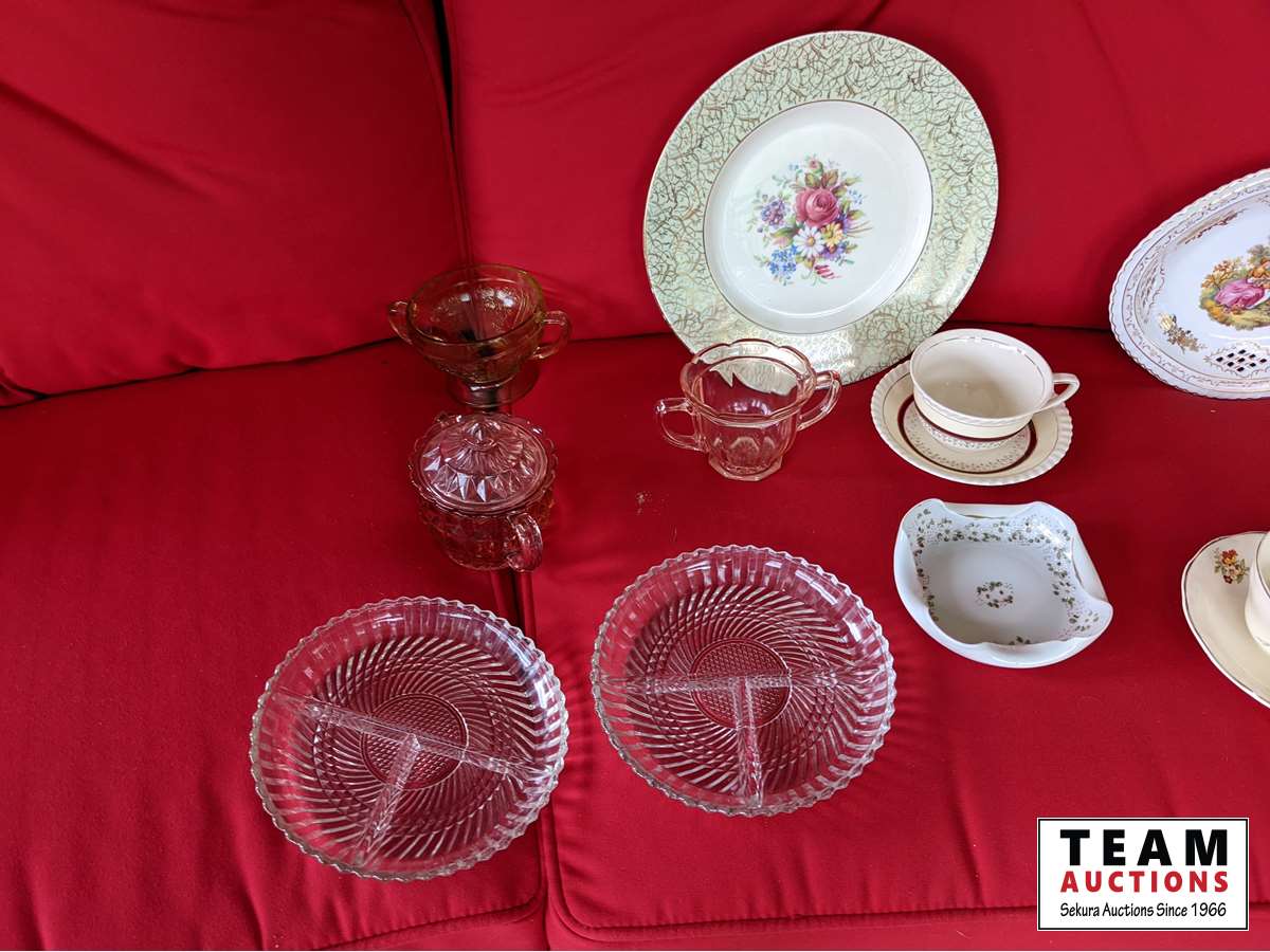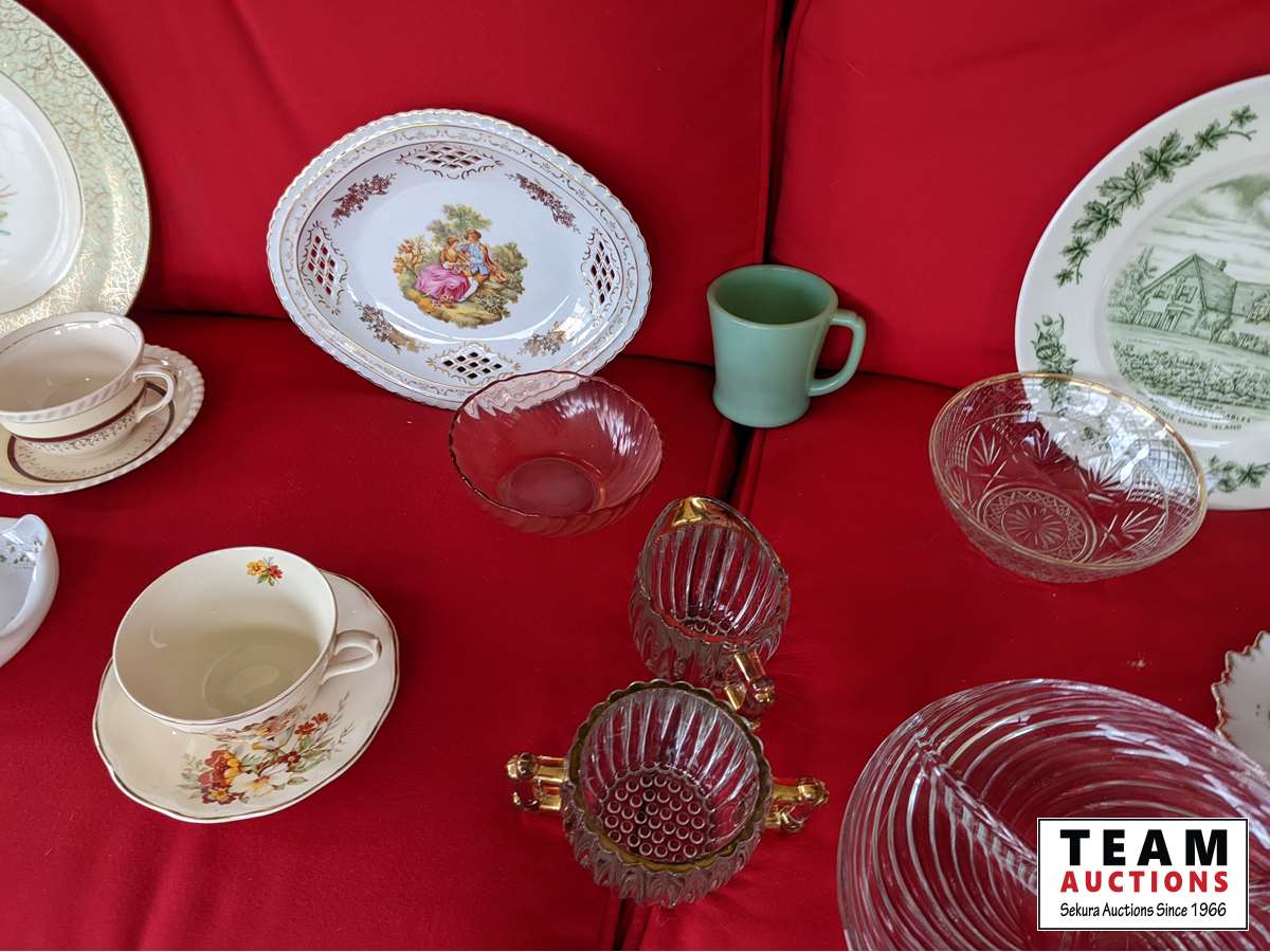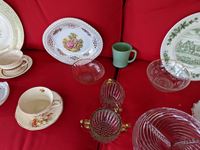 (2) tea cups with saucers, green mug, sugar bowls, creamer, plates, various serving dishes