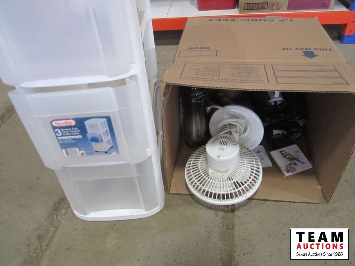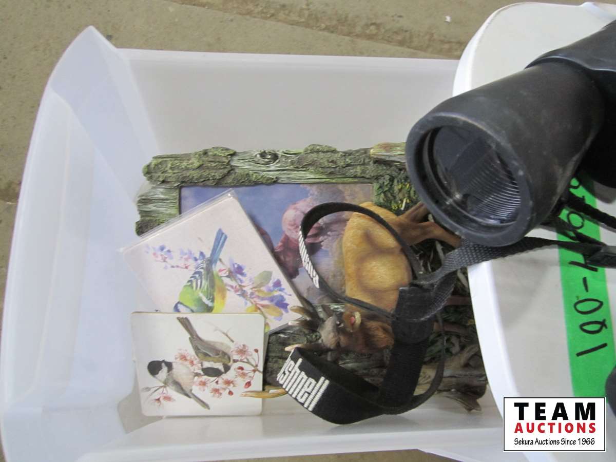 Mugs, plastic drawer, binoculars, etc.