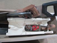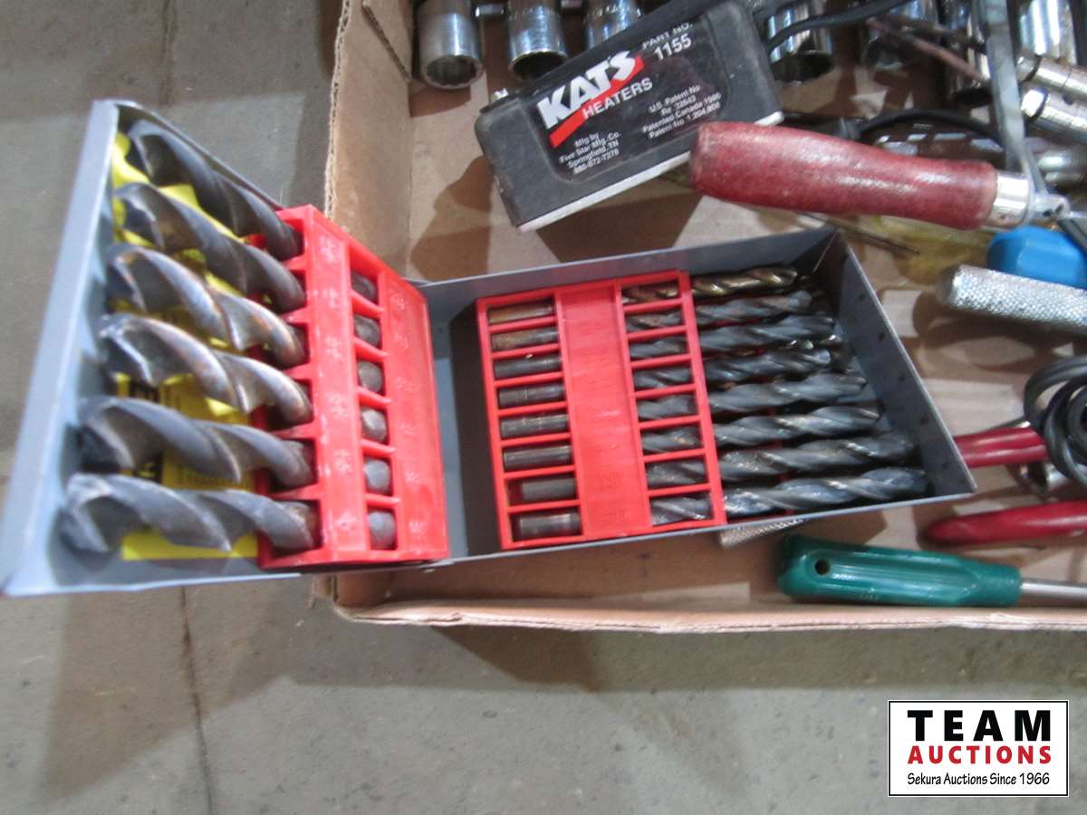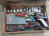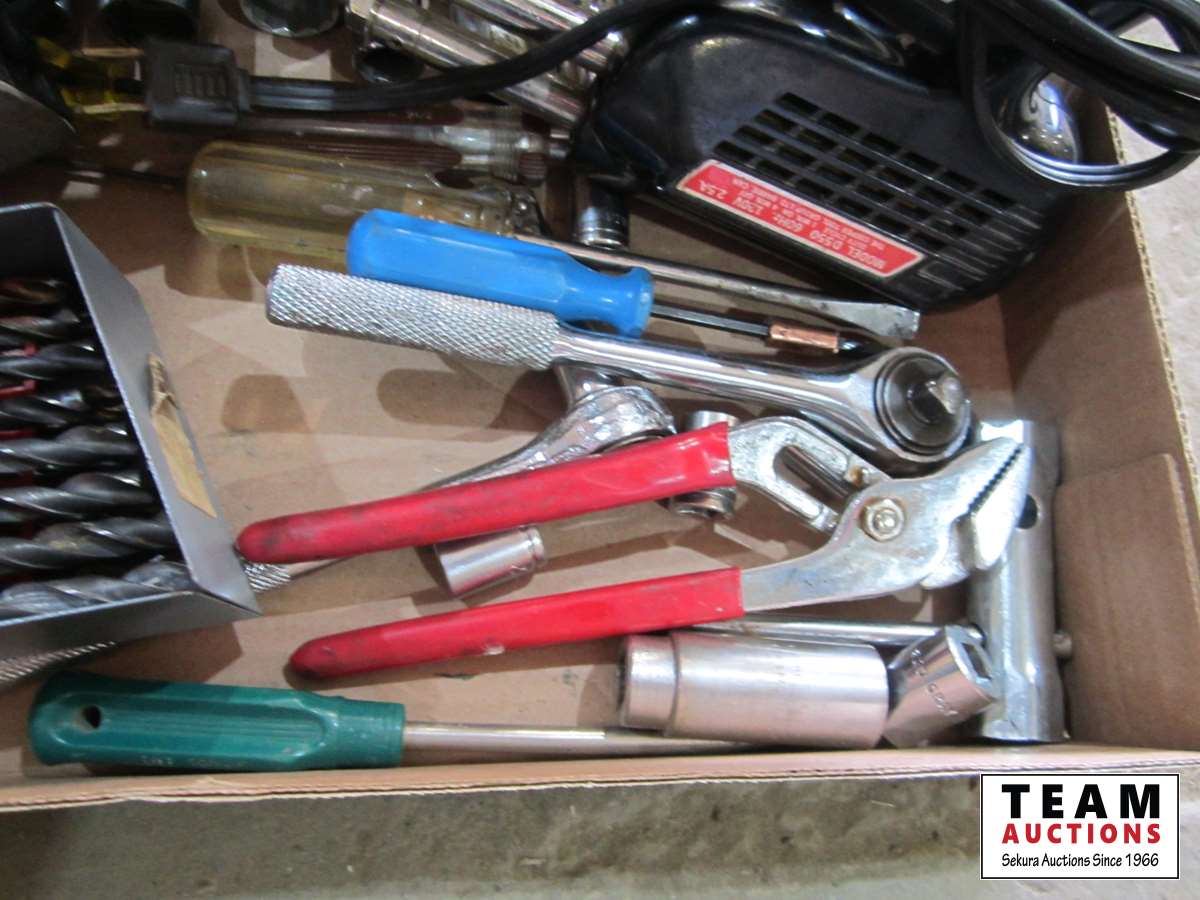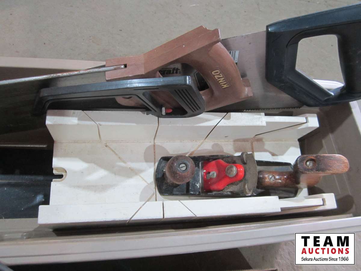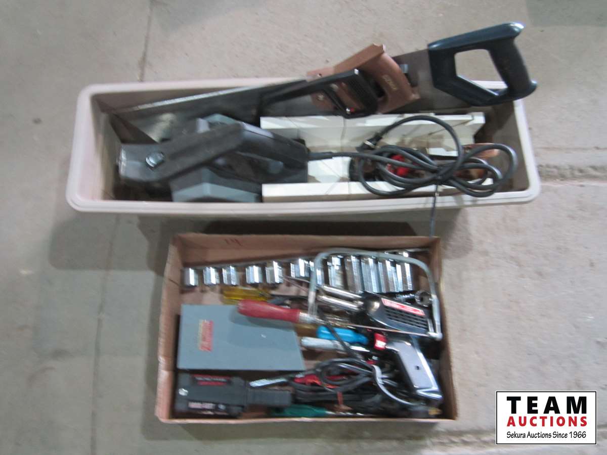 Hand saws, electric planer, antique hand planer, box of assorted tools, sockets, soldering gun etc.