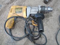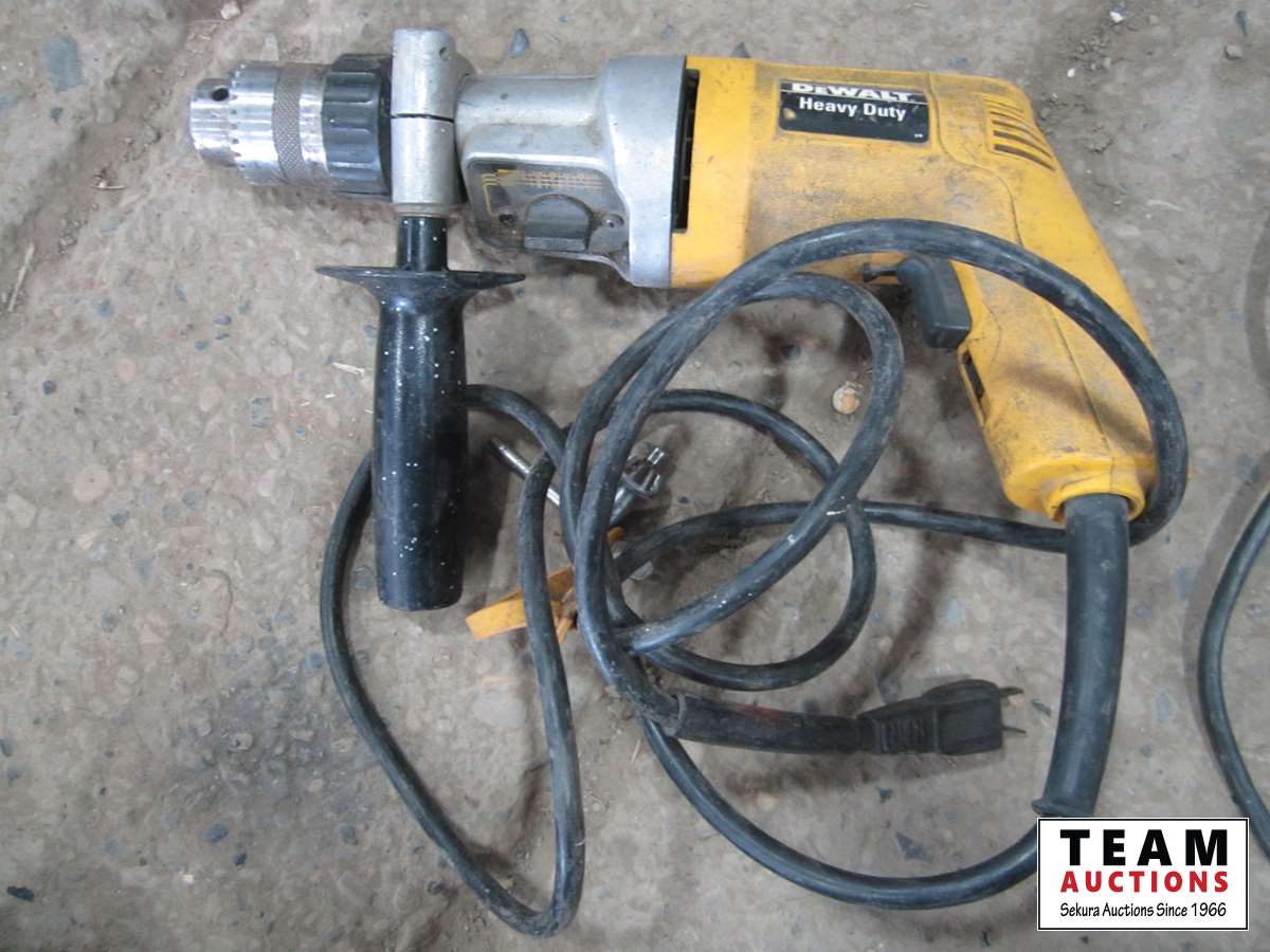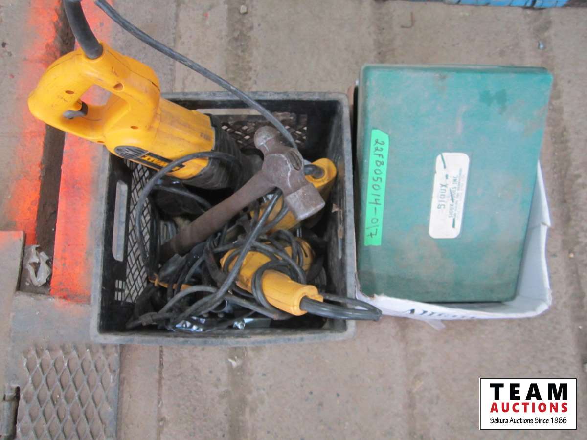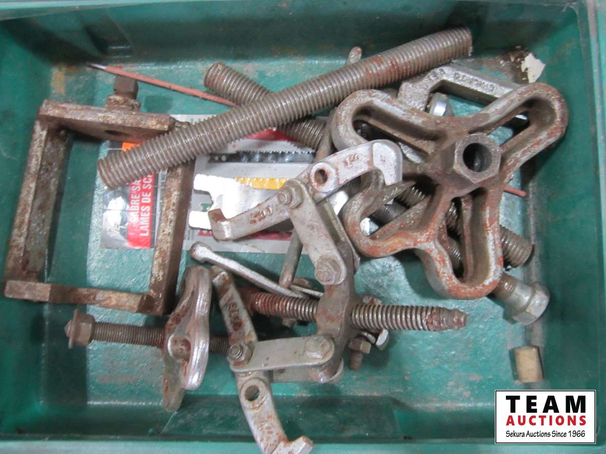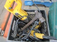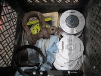 gear pullers and parts, tote of dewalt power tools, grinding discs,