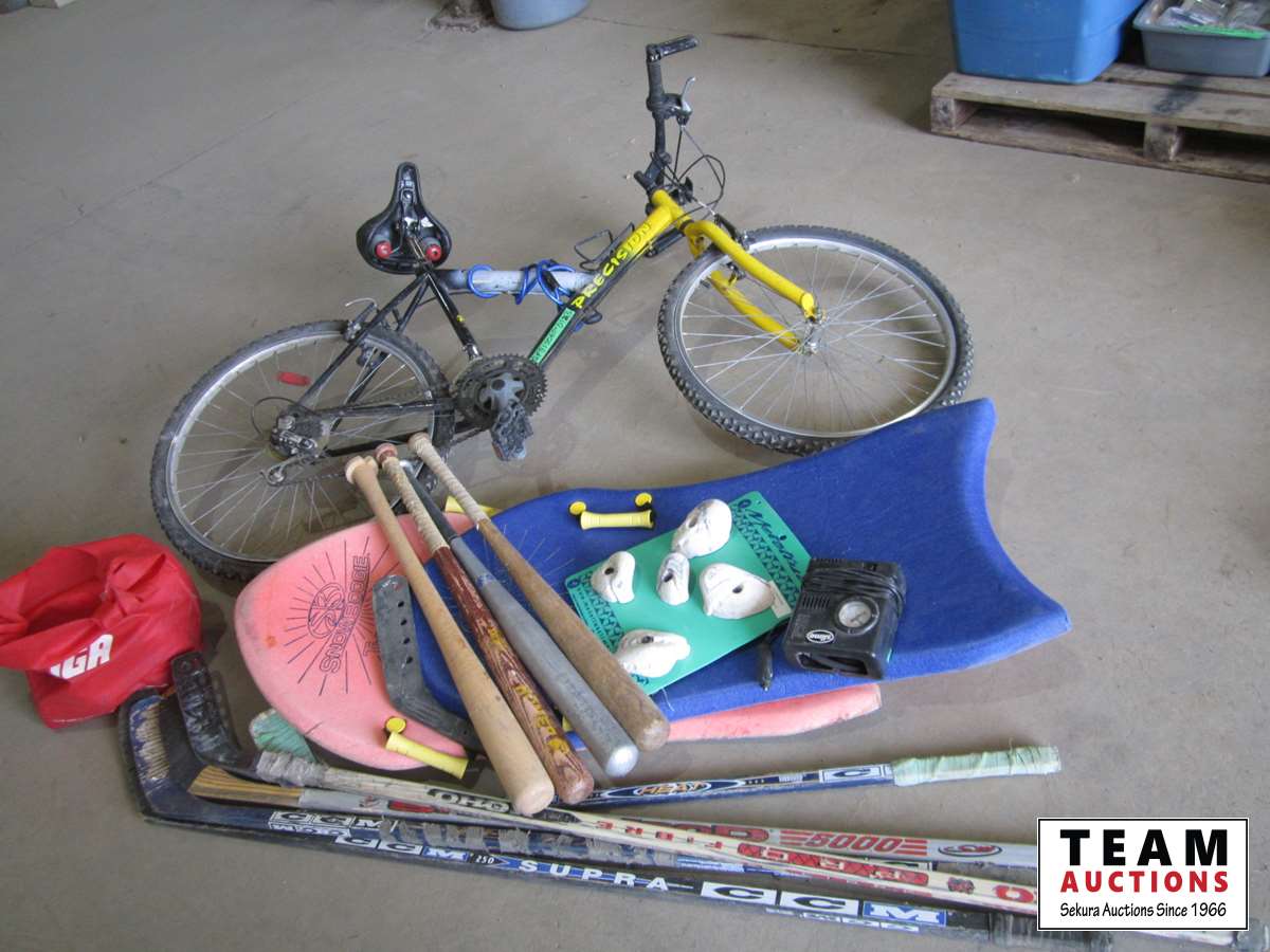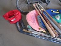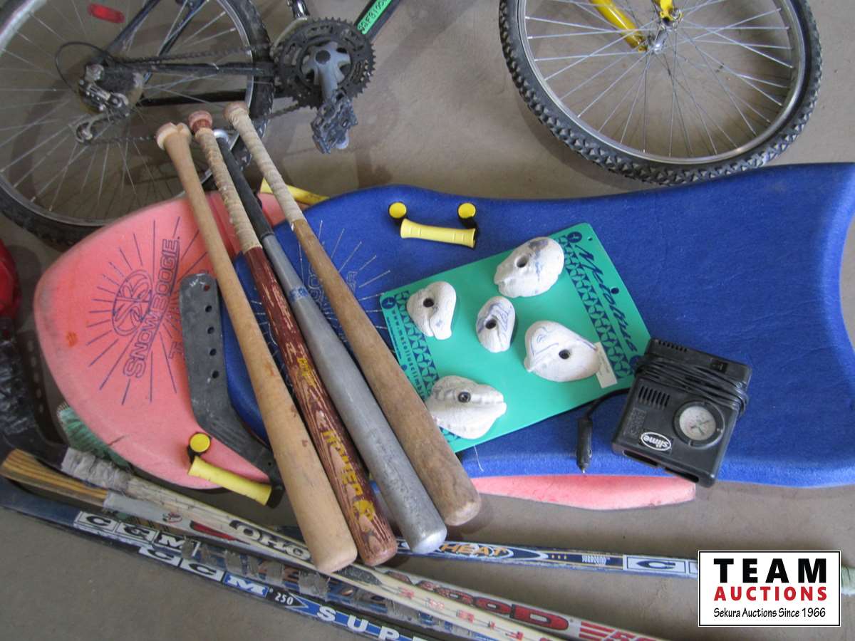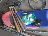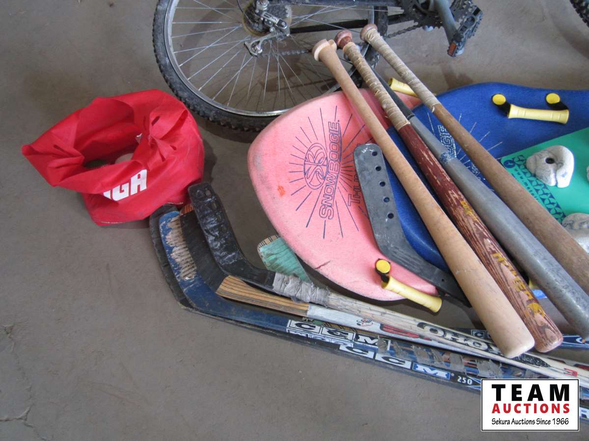 (1) bike, (2) foam boards, (5) hockey sticks, (5) bats, bag of balls, and tire pump