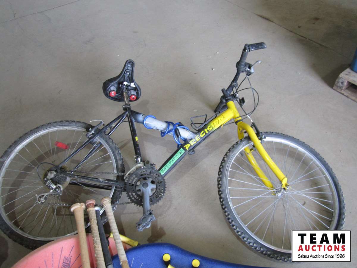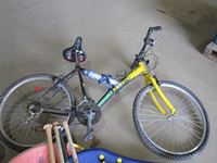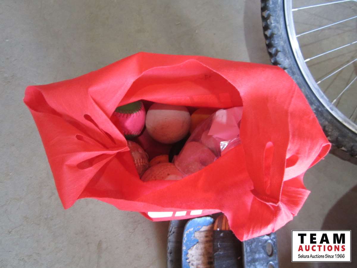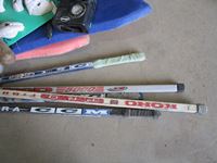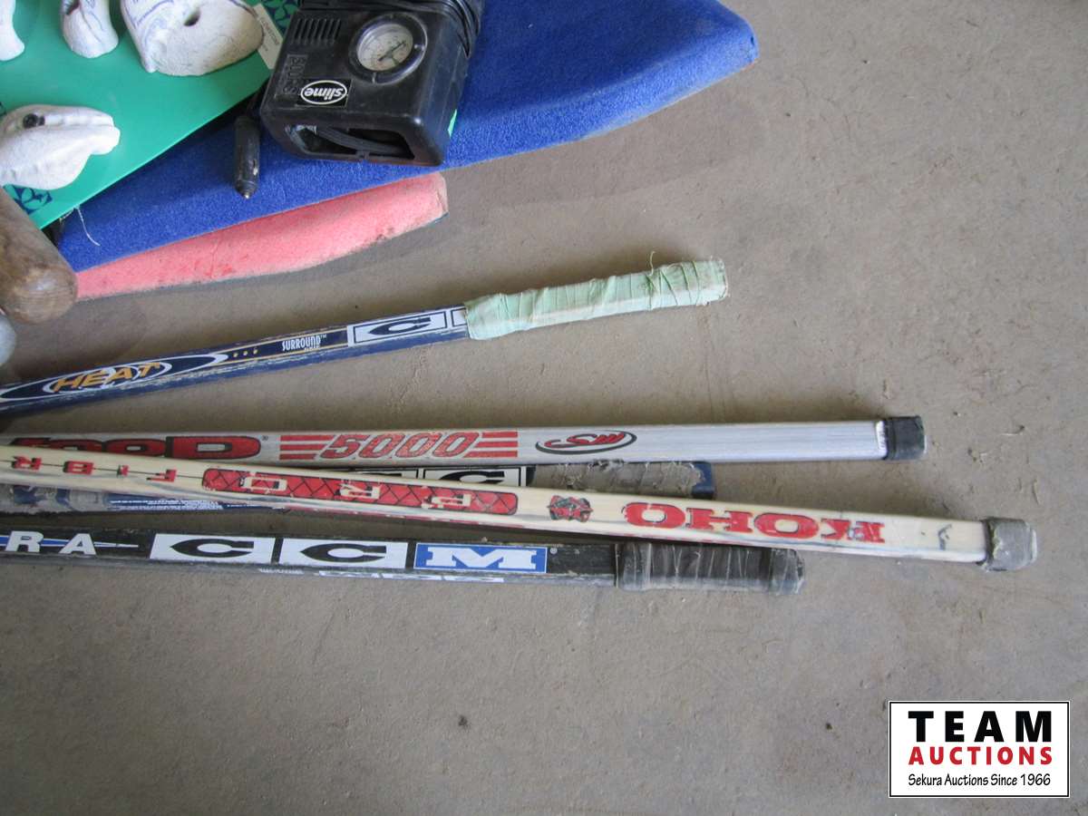 (1) bike, (2) foam boards, (5) hockey sticks, (5) bats, bag of balls, and tire pump