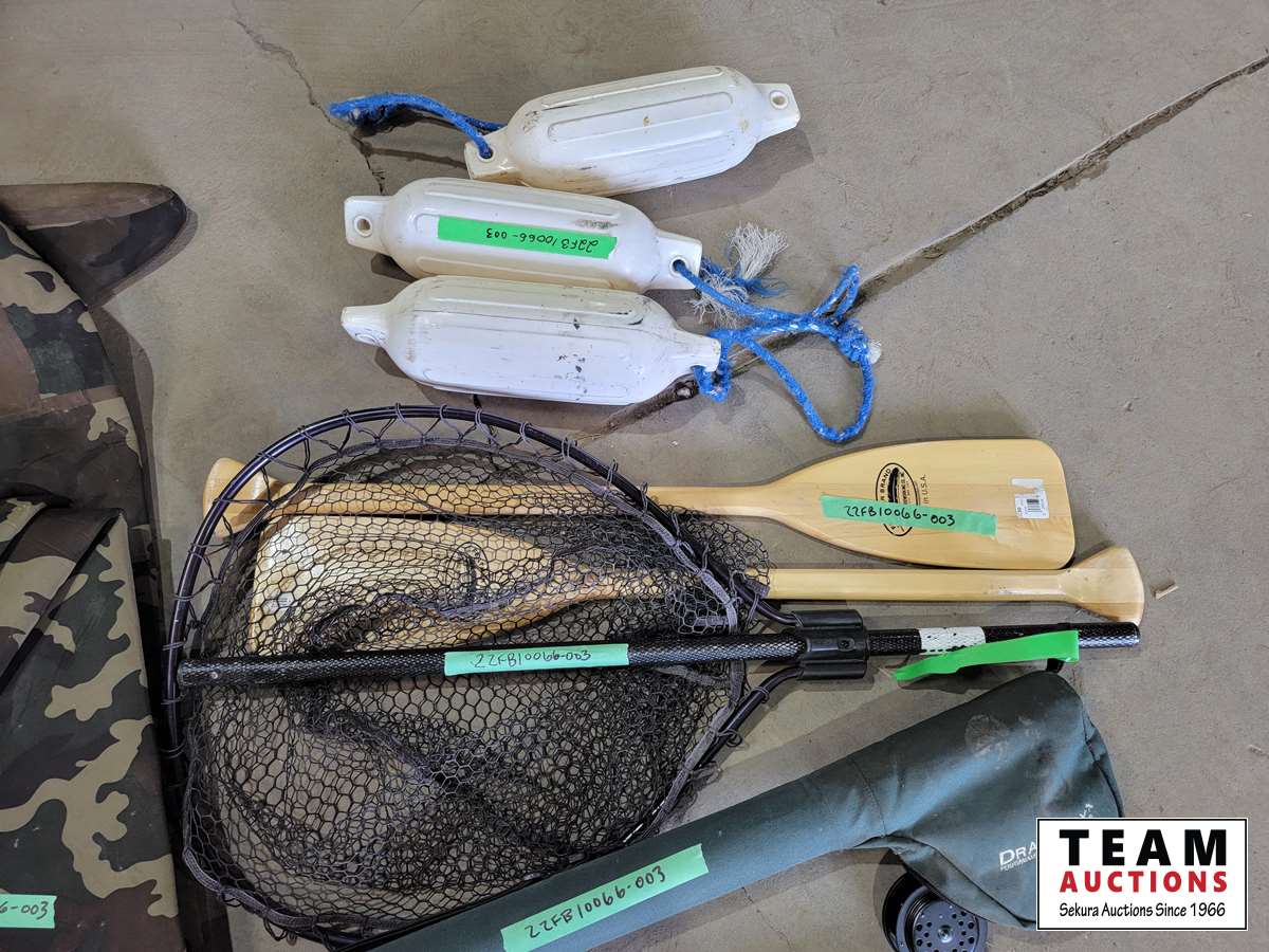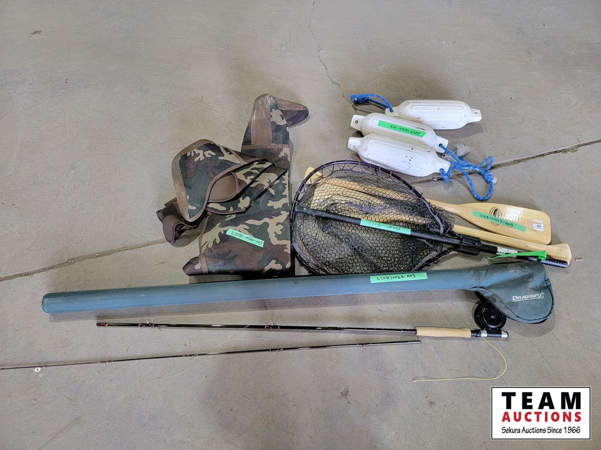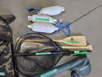 Set of chestwaders size: XXL (used once), paddles, rod, (3) bouys, and fishing net