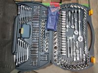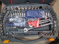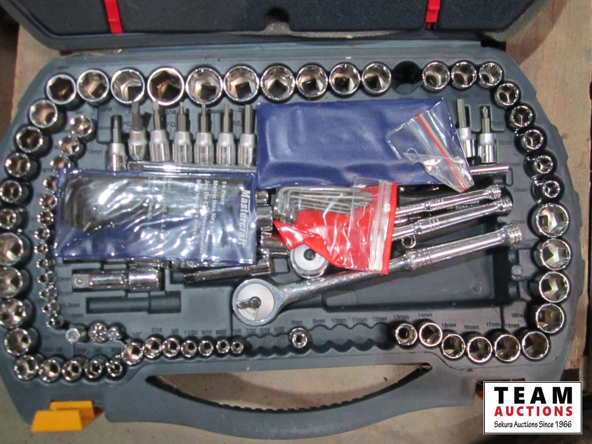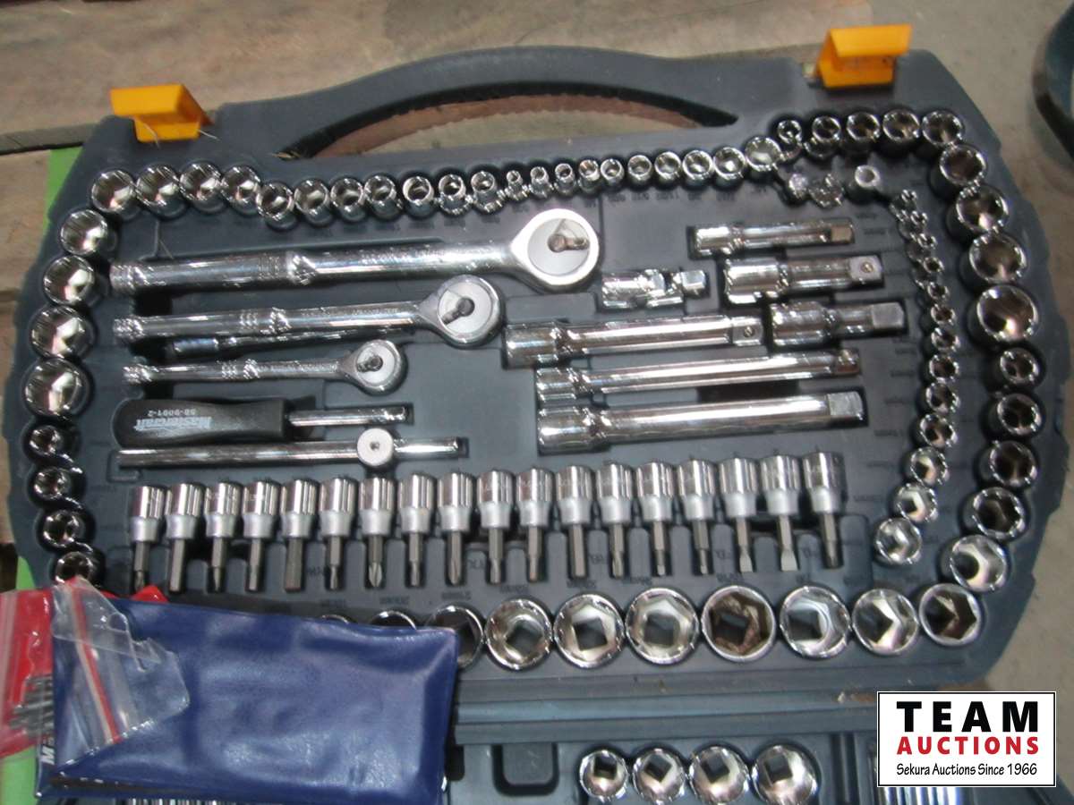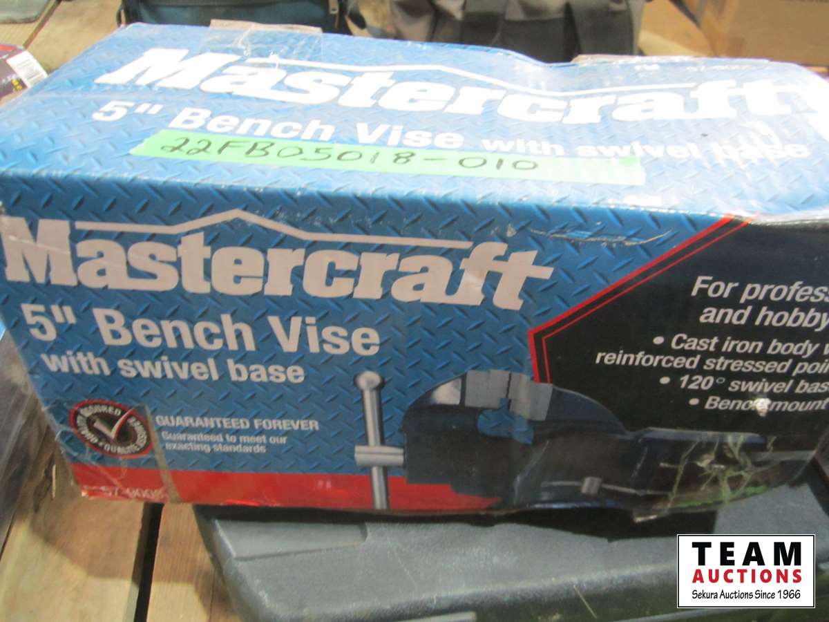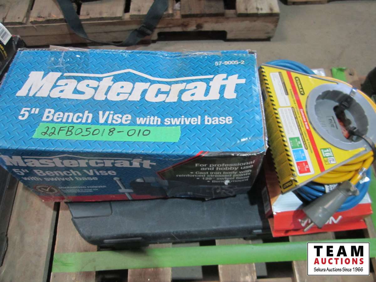 Mastercraft 56 inch vise, extension cords, power bar, Mastercraft socket set