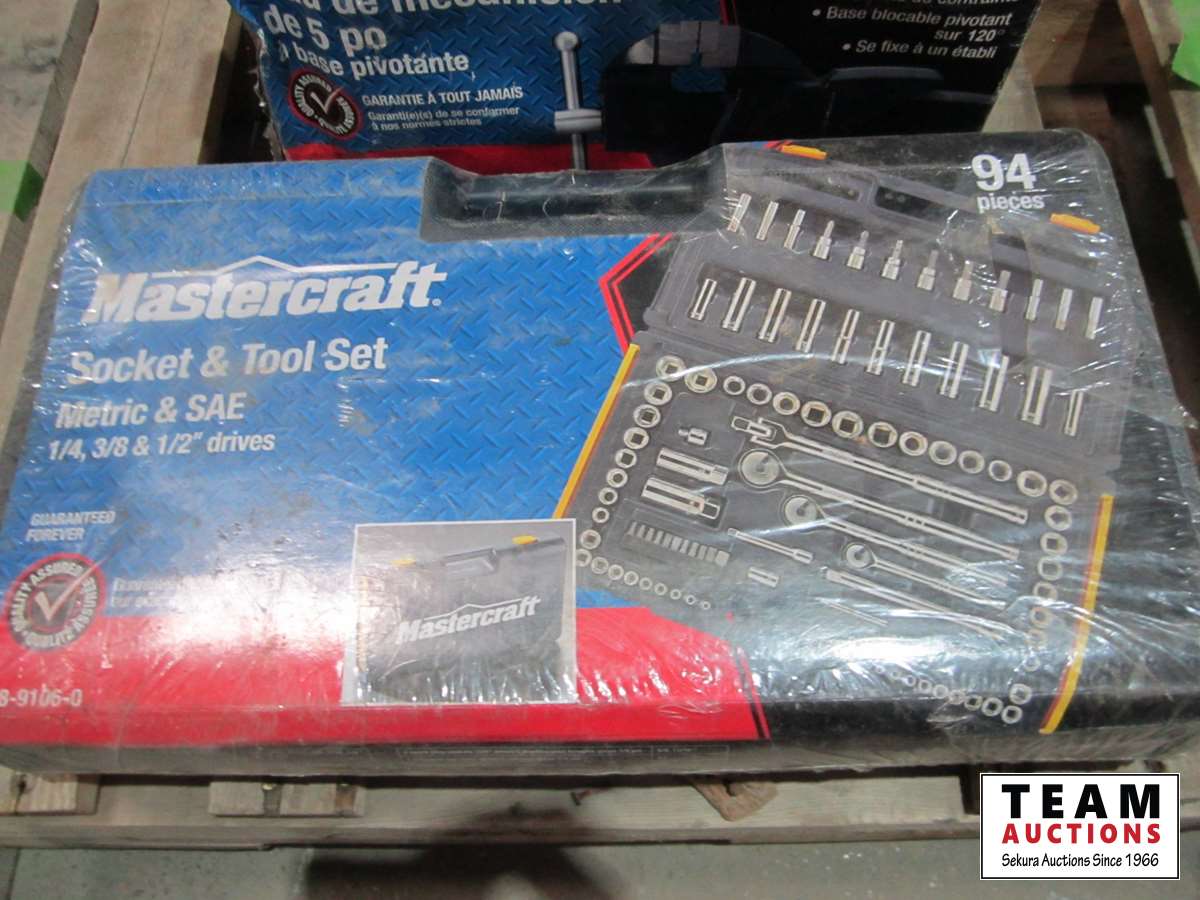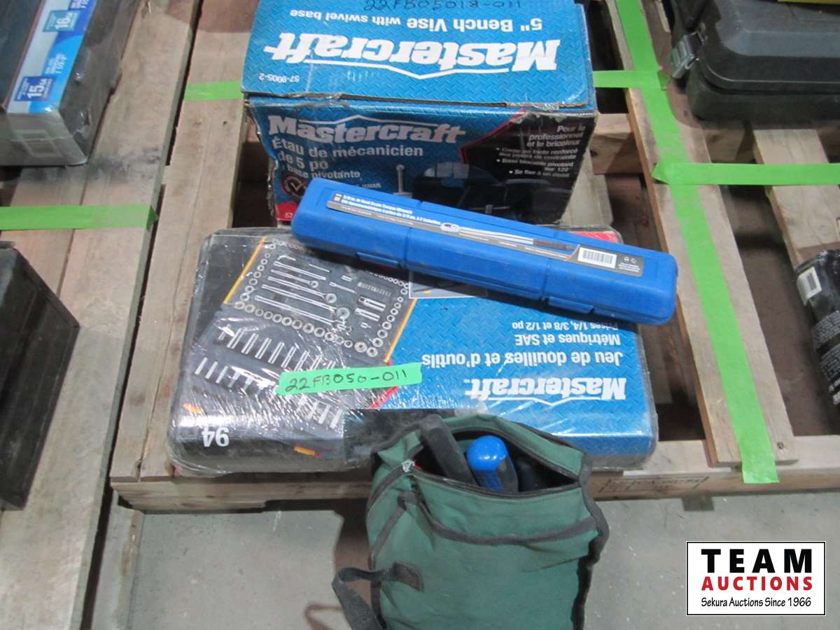 5 inch vise, tool bag with tools, 3/8 inch torque wrench, Mastercraft socket set