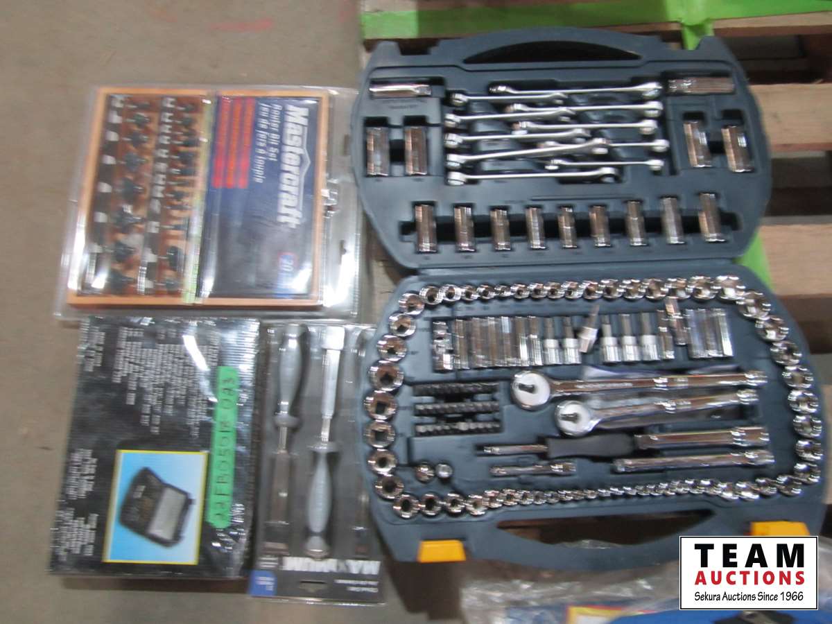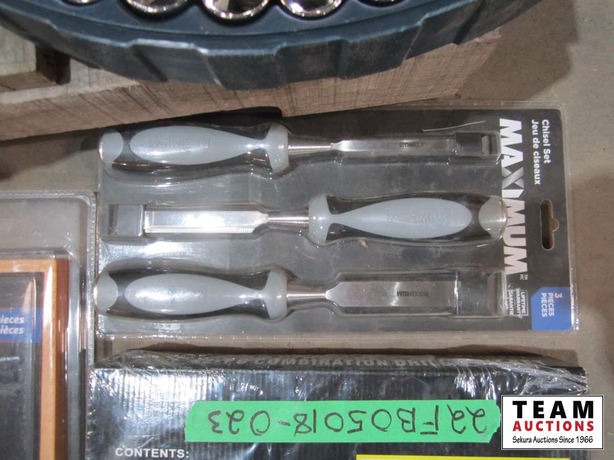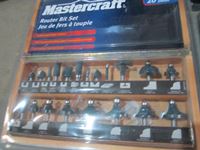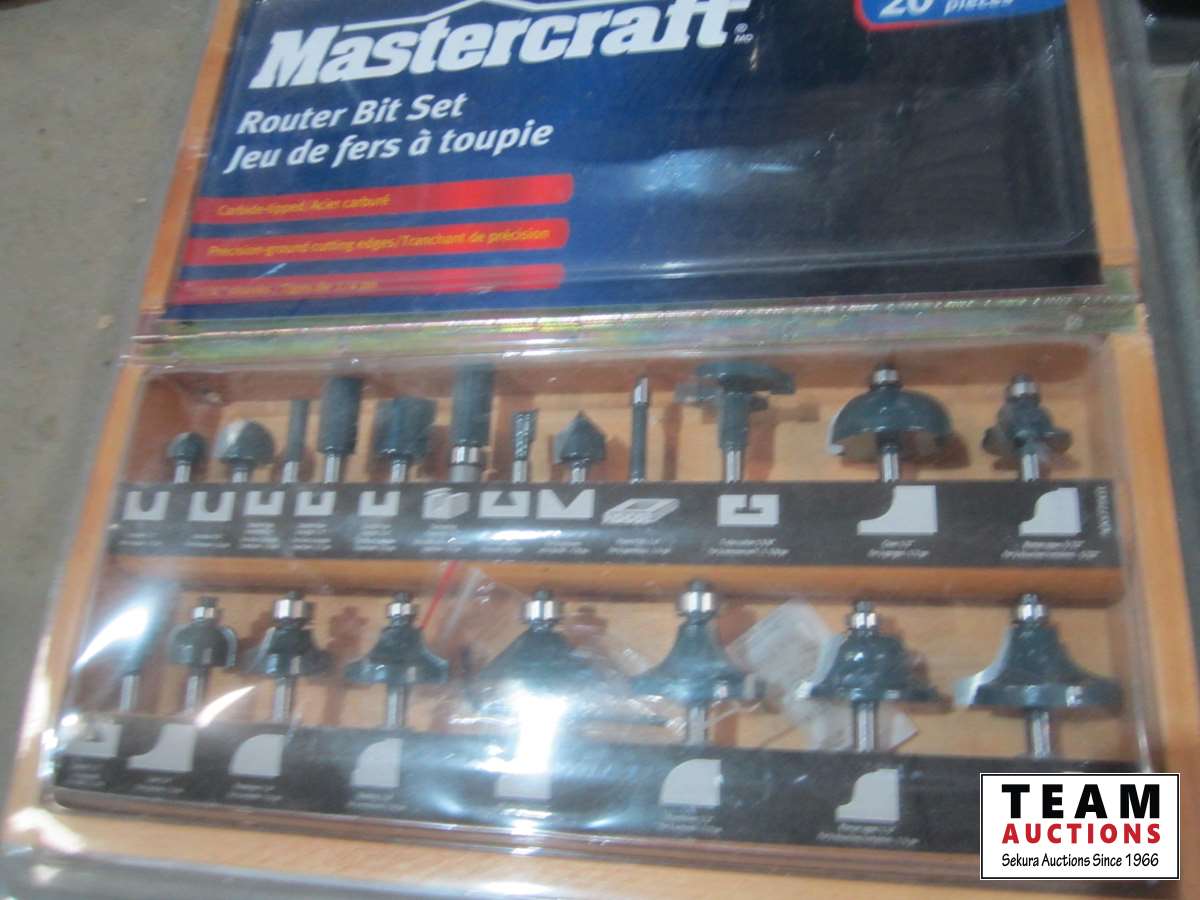 Chisel set, drill bit set, Mastercraft router bit set, socket set