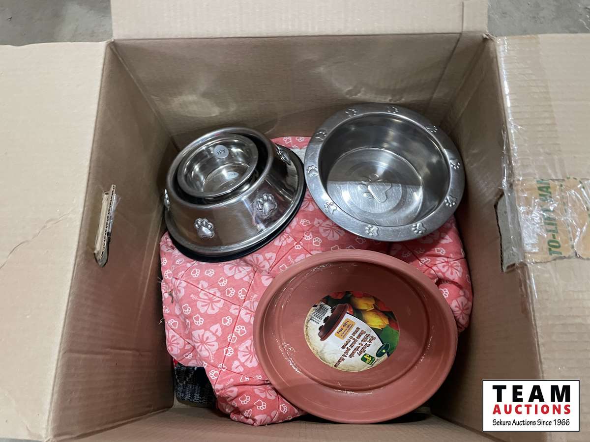 Dishes, leash, blankets