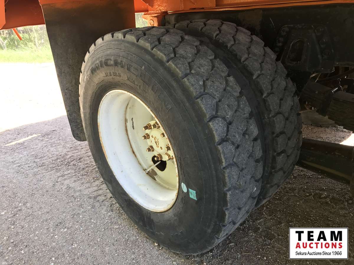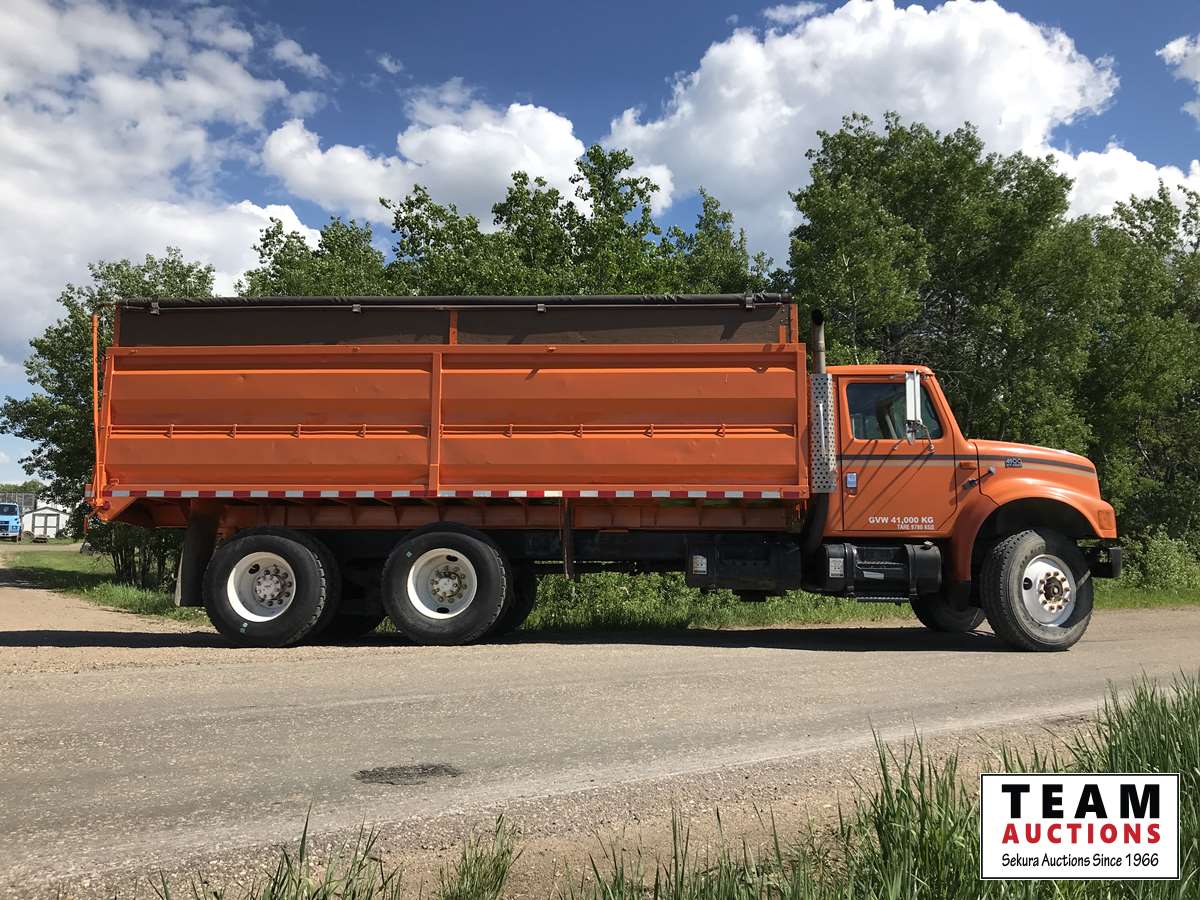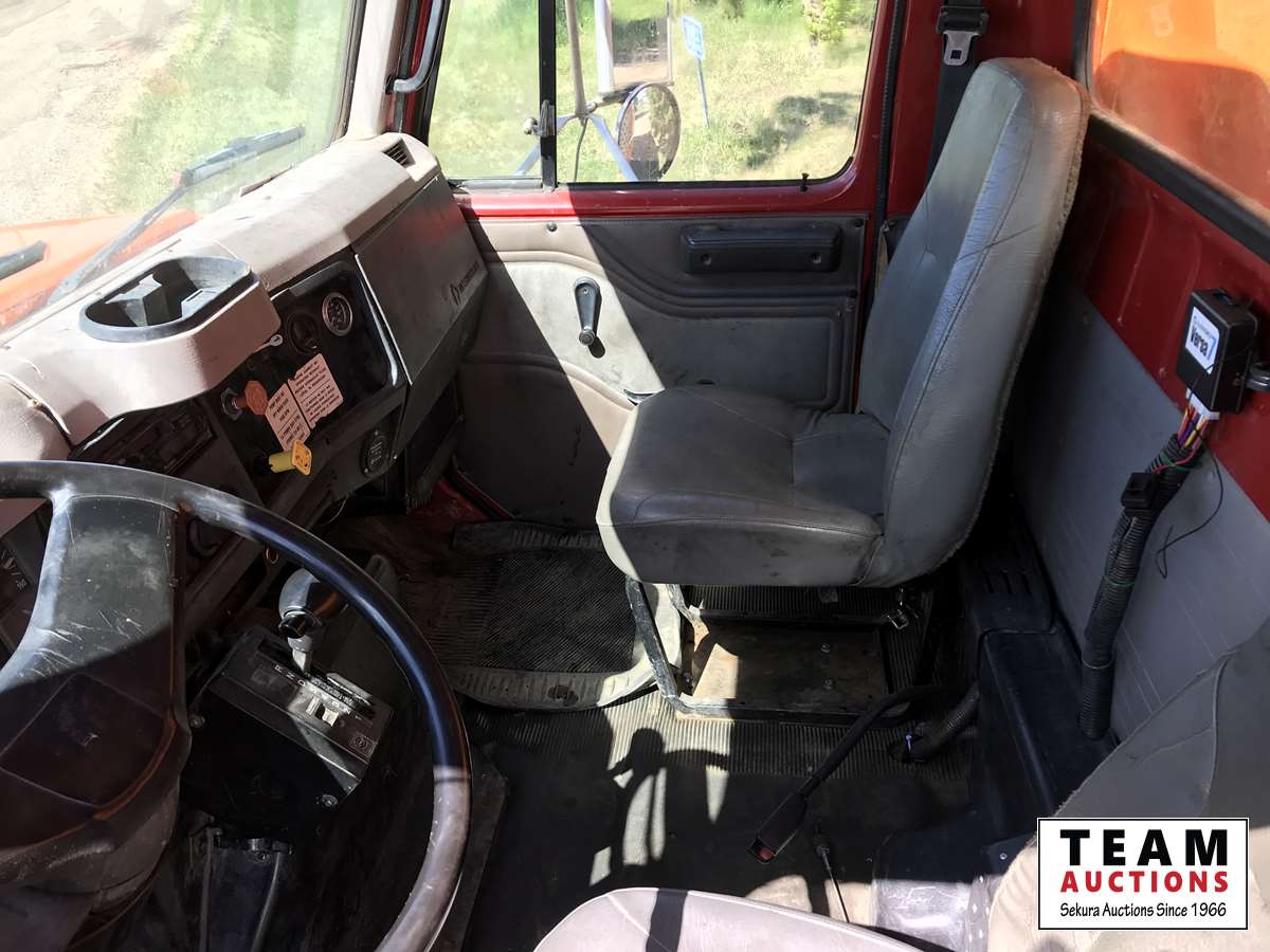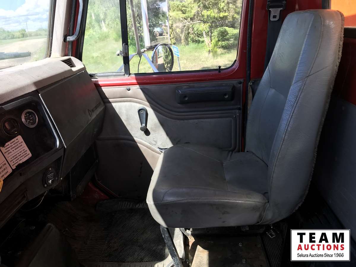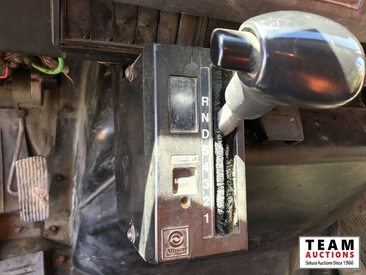 International DT466E, 6 cylinder, diesel, Aliision 5 speed automatic transmission, spring over walking beam suspension, differential lock, 20 ft steel box, twin cylinder hoist, Versa Glide Force remote for box and end gate, live PTO hot shift no clutch required, 80% 11R22.5 tires