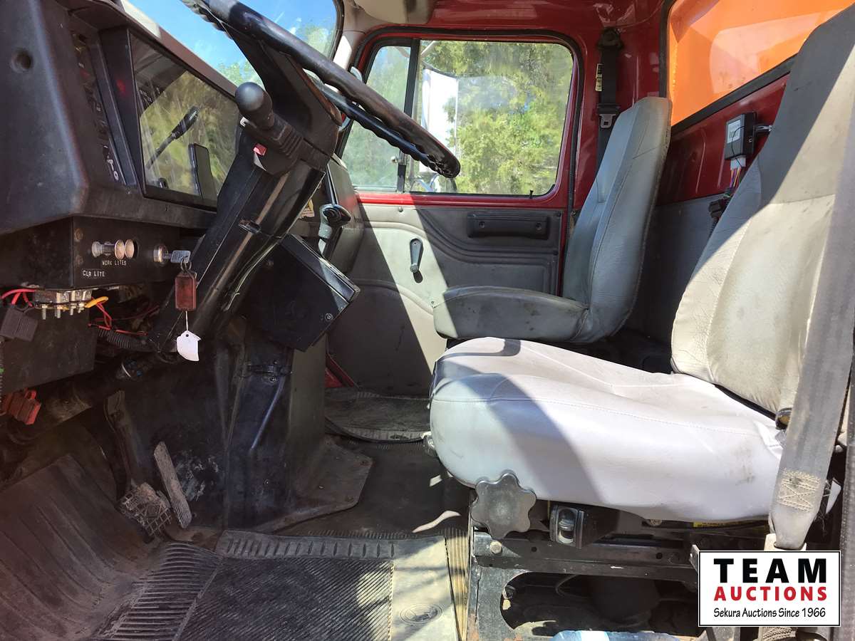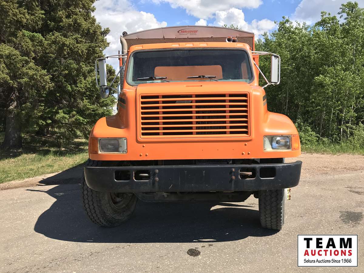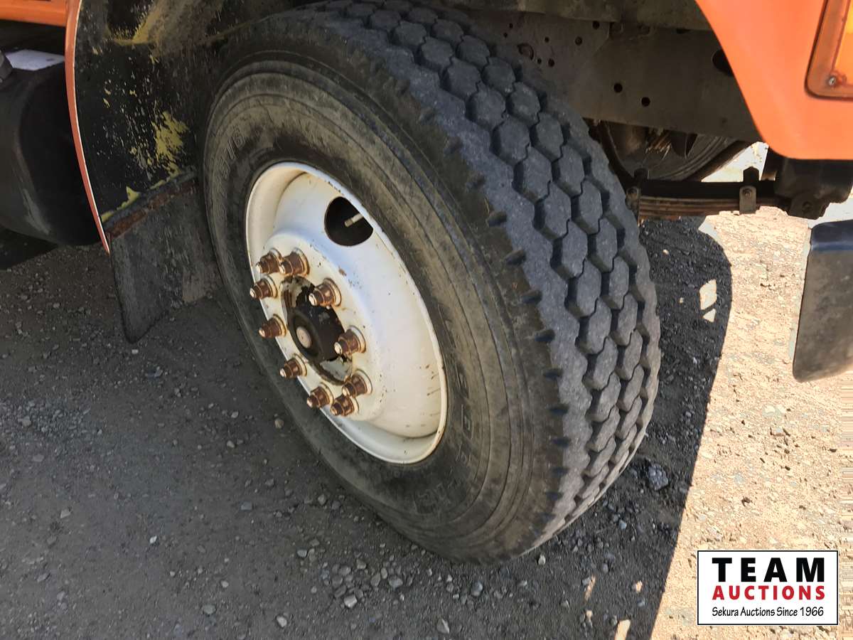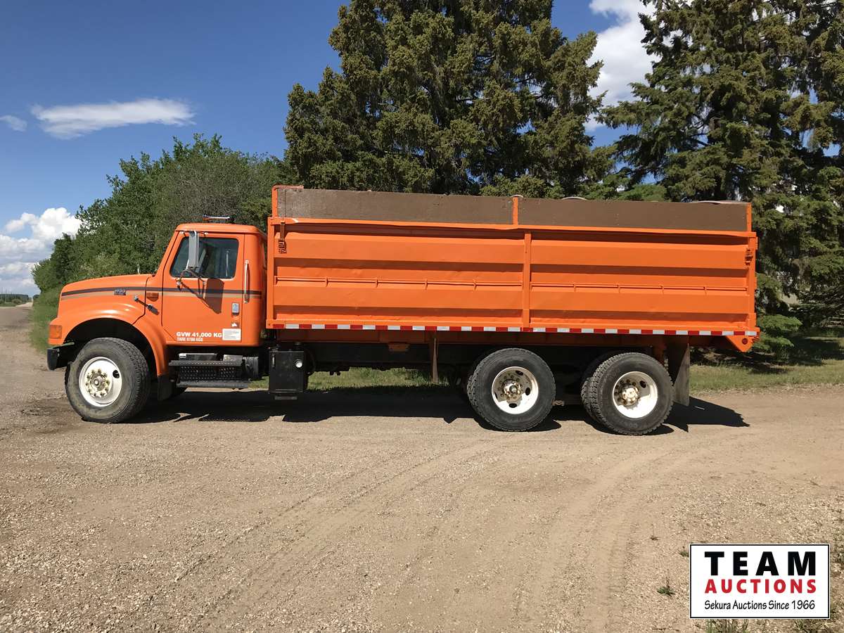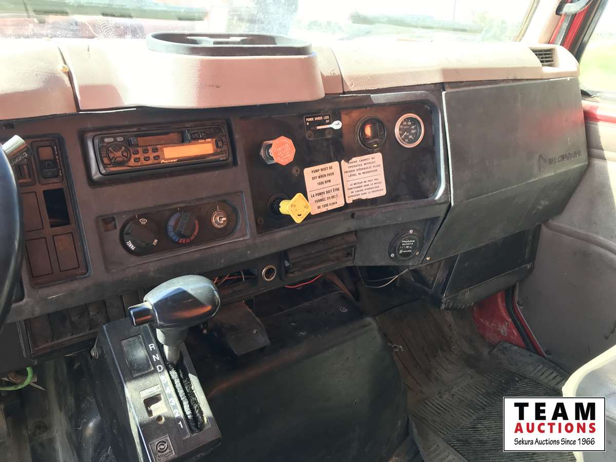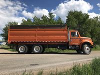 International DT466E, 6 cylinder, diesel, Aliision 5 speed automatic transmission, spring over walking beam suspension, differential lock, 20 ft steel box, twin cylinder hoist, Versa Glide Force remote for box and end gate, live PTO hot shift no clutch required, 80% 11R22.5 tires