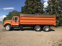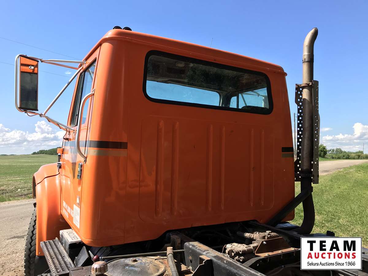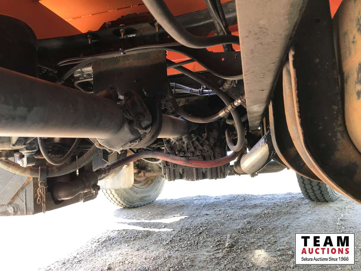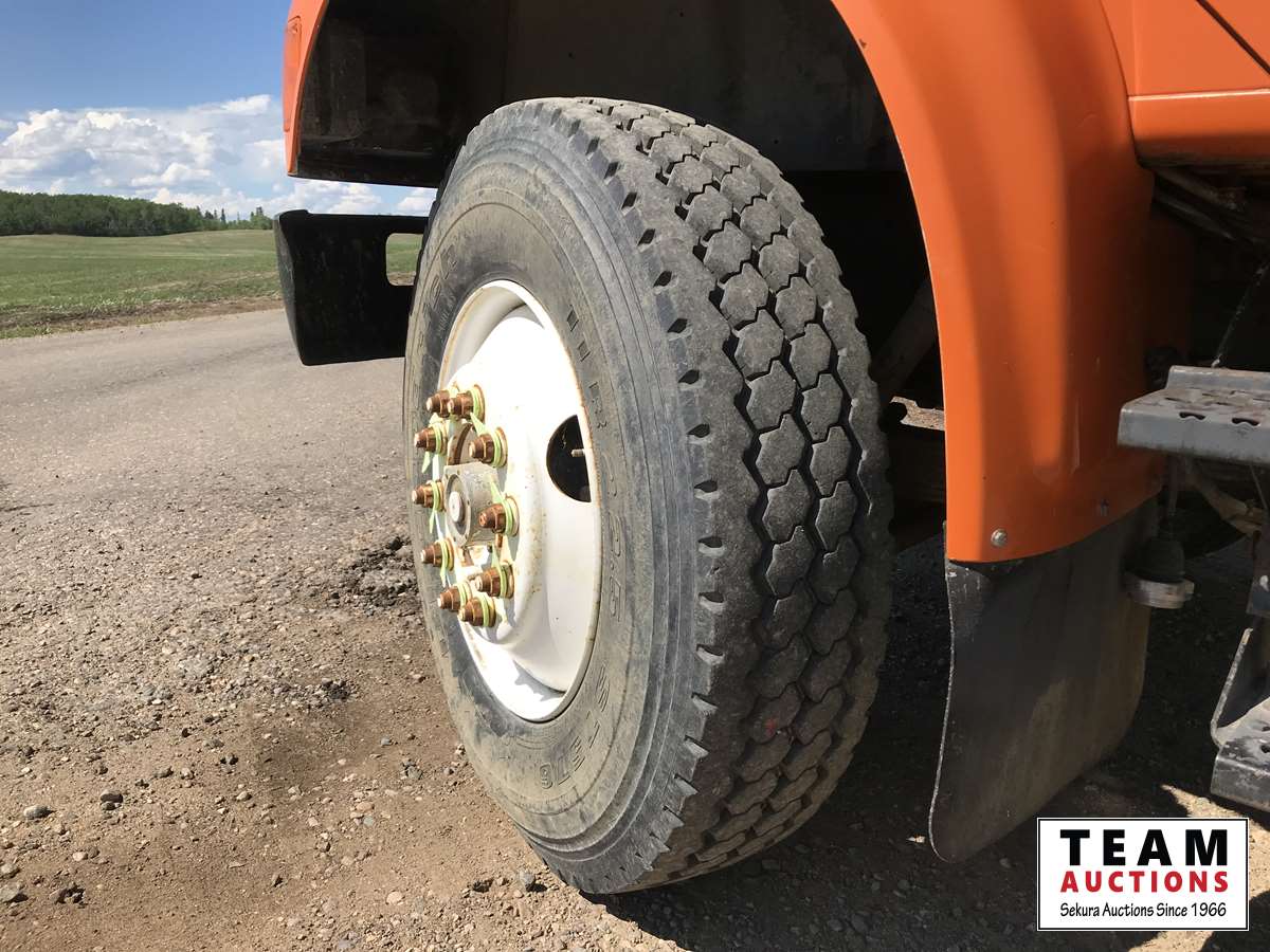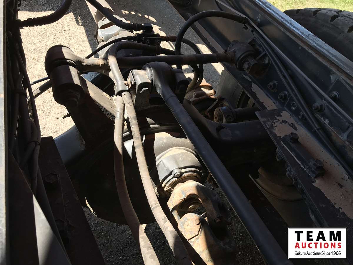 International DT466E, 6 cylinder, diesel, Aliision 5 speed automatic transmission, spring over walking beam suspension, differential lock, 20 ft steel box, twin cylinder hoist, Versa Glide Force remote for box and end gate, live PTO hot shift no clutch required, 80% 11R22.5 tires