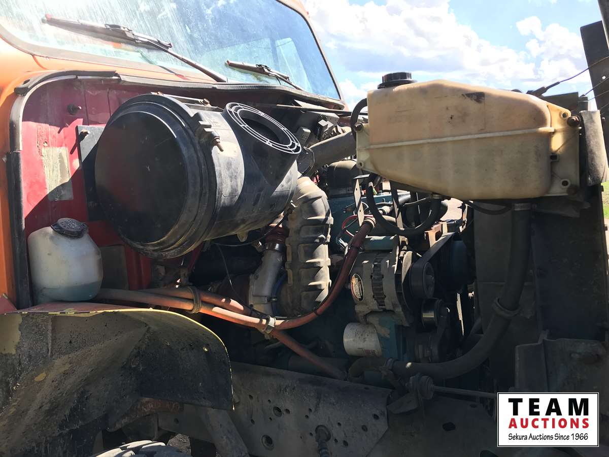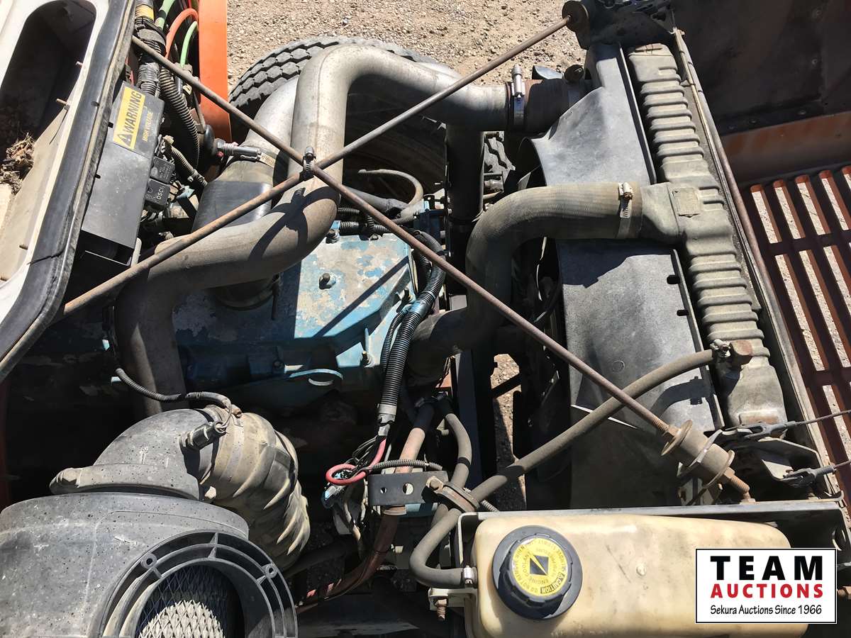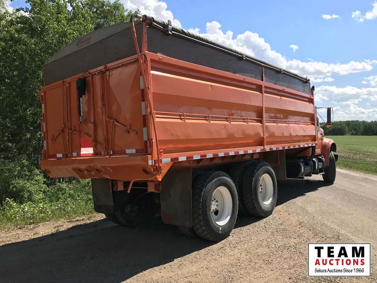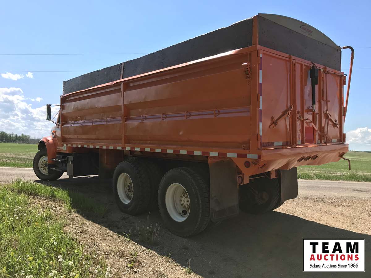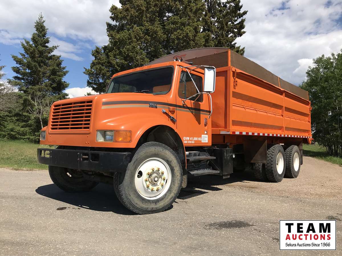 International DT466E, 6 cylinder, diesel, Aliision 5 speed automatic transmission, spring over walking beam suspension, differential lock, 20 ft steel box, twin cylinder hoist, Versa Glide Force remote for box and end gate, live PTO hot shift no clutch required, 80% 11R22.5 tires