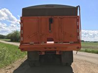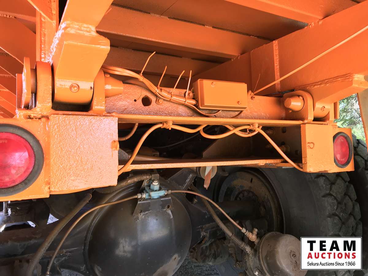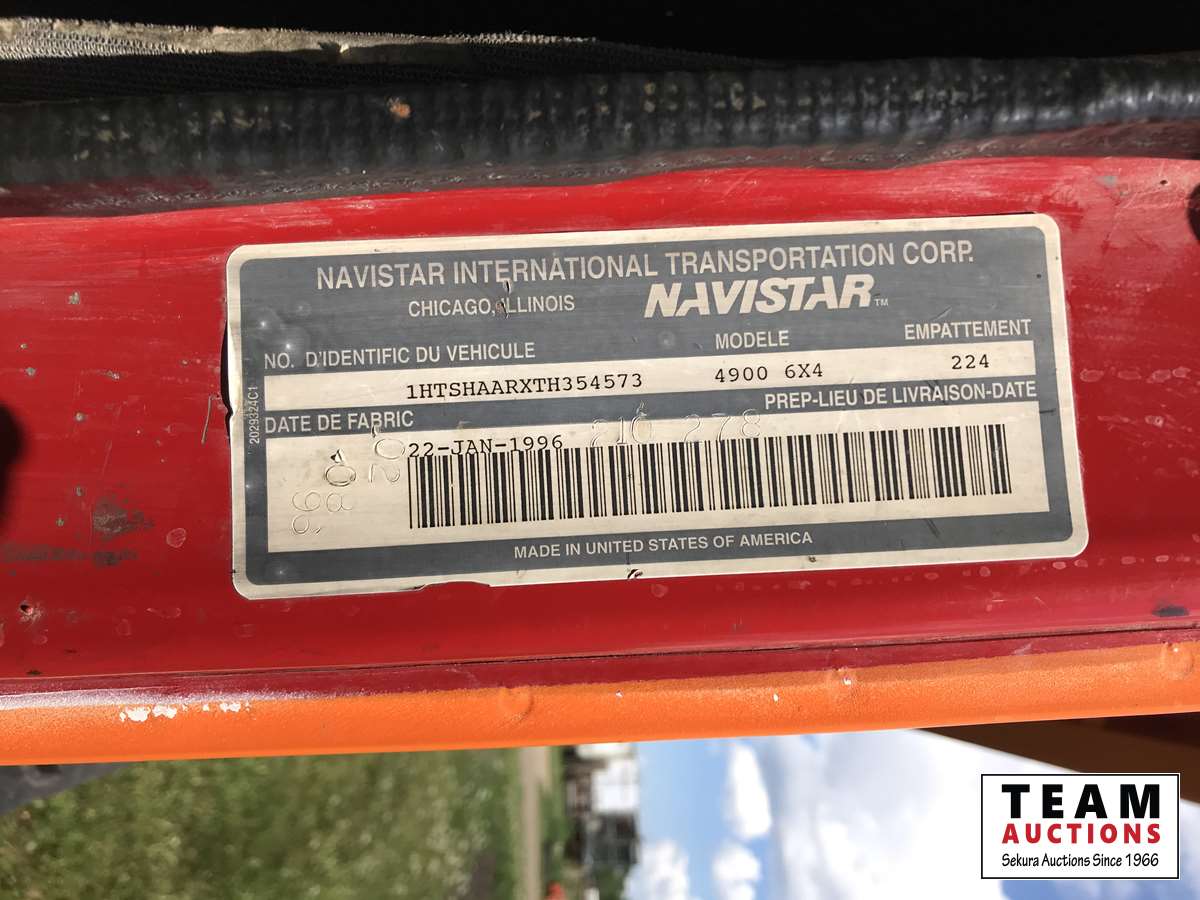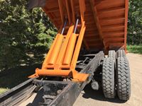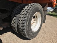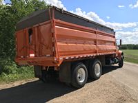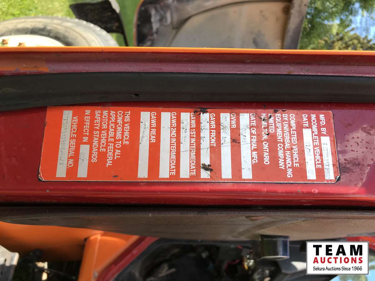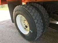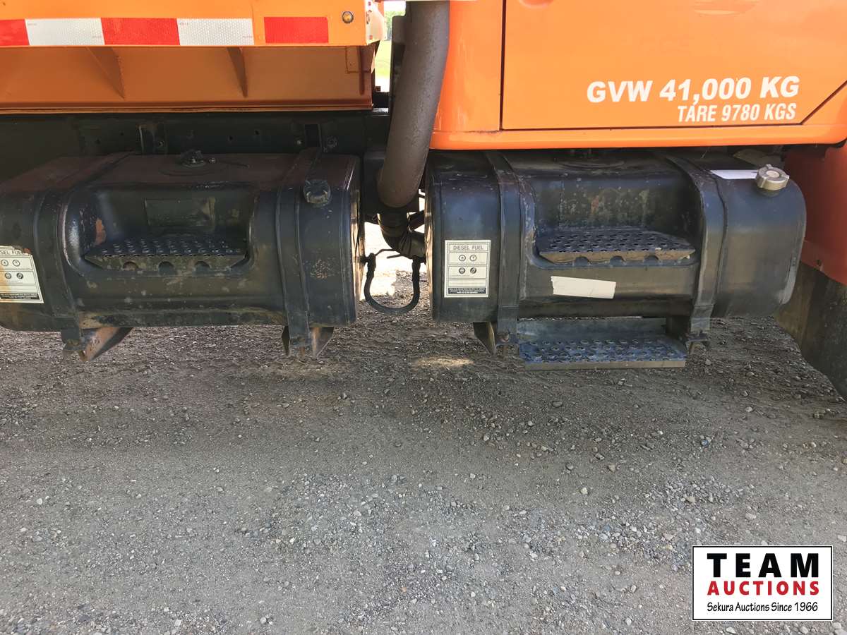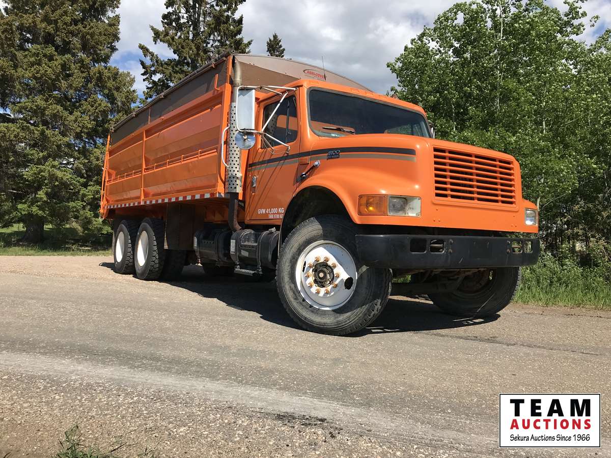 International DT466E, 6 cylinder, diesel, Aliision 5 speed automatic transmission, spring over walking beam suspension, differential lock, 20 ft steel box, twin cylinder hoist, Versa Glide Force remote for box and end gate, live PTO hot shift no clutch required, 80% 11R22.5 tires