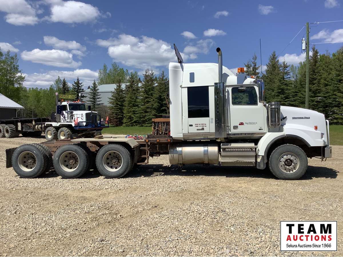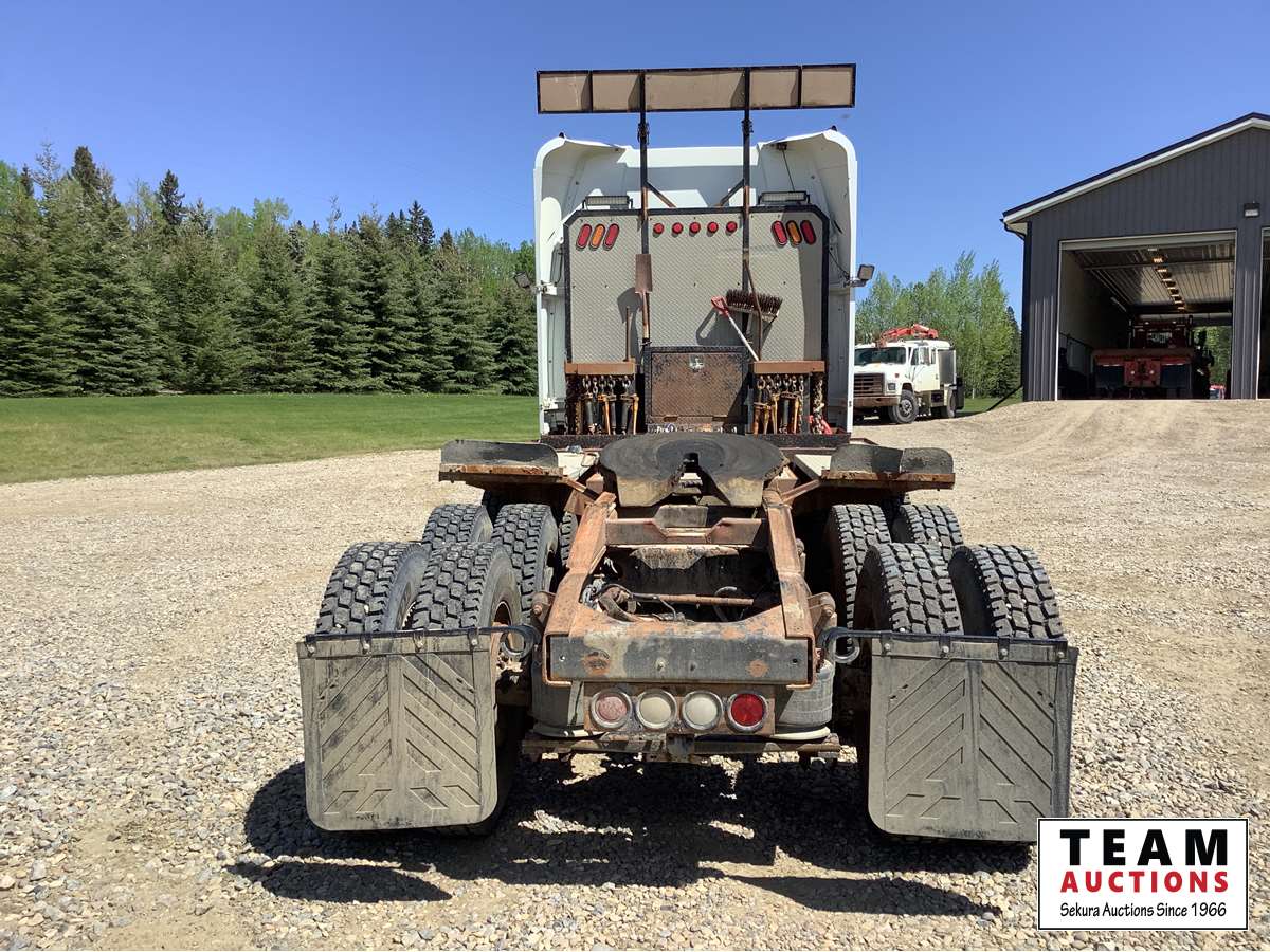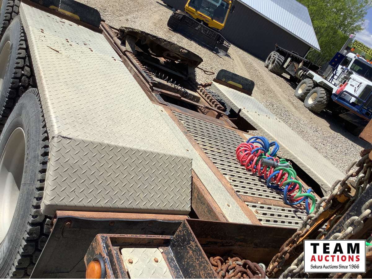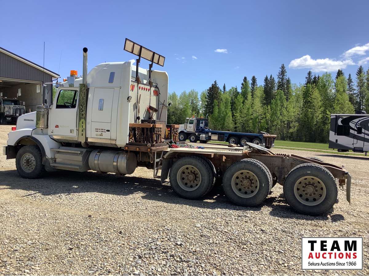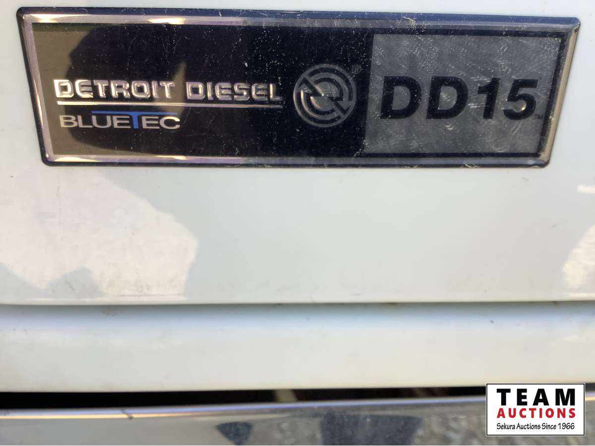 DD15 engine, Eaton Fuller 18 speed transmission, 14,200 lb front axle with twin steering box’s, air ride suspension, full locking rear differential, air slide fifth wheel, headache rack, wide load sign, beacon lights, set of chains and boomers, 385/65R22.5 front tires, real good 11R24 rear tires, aluminum rims