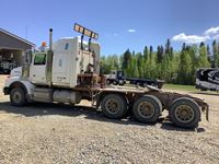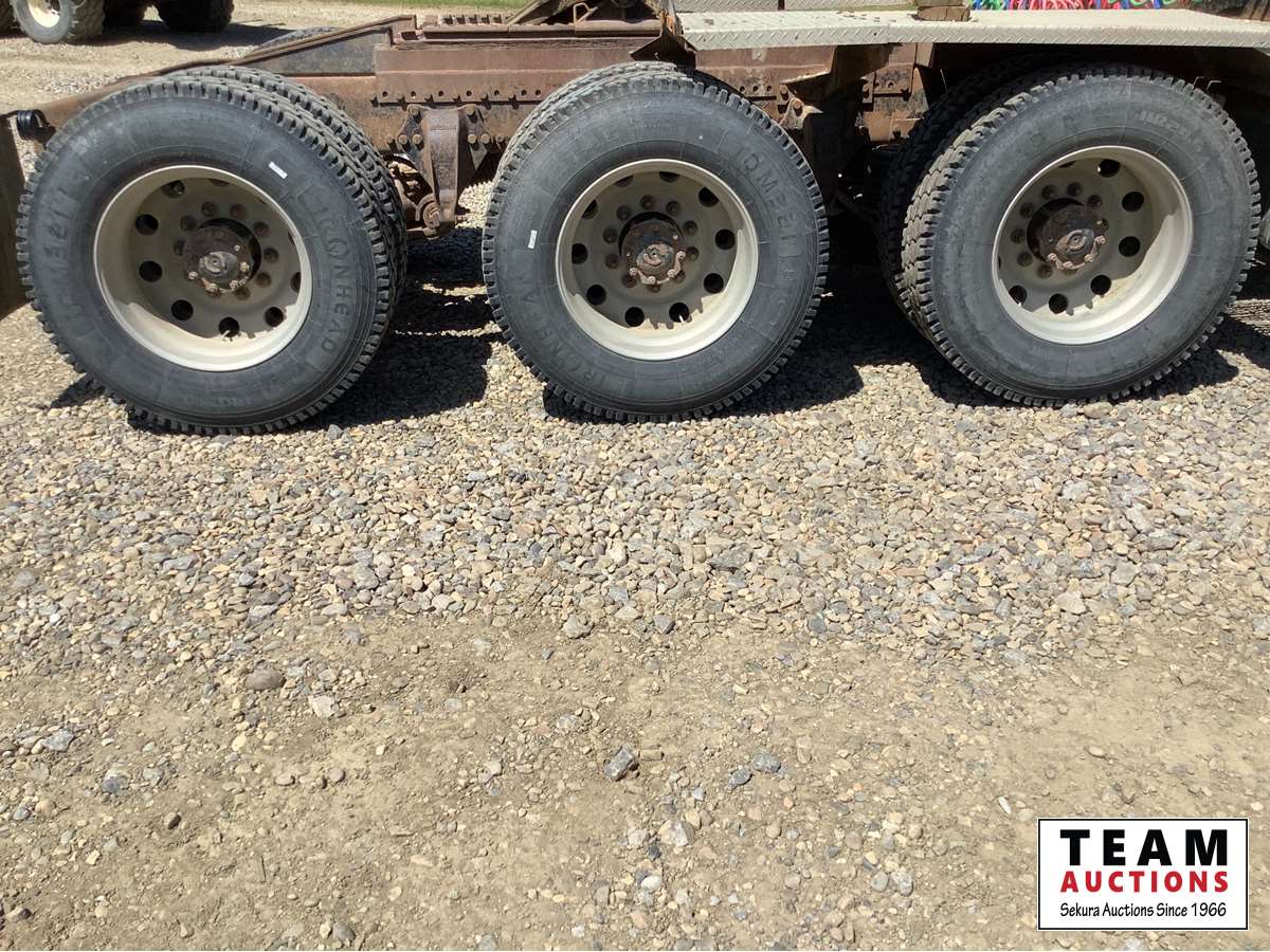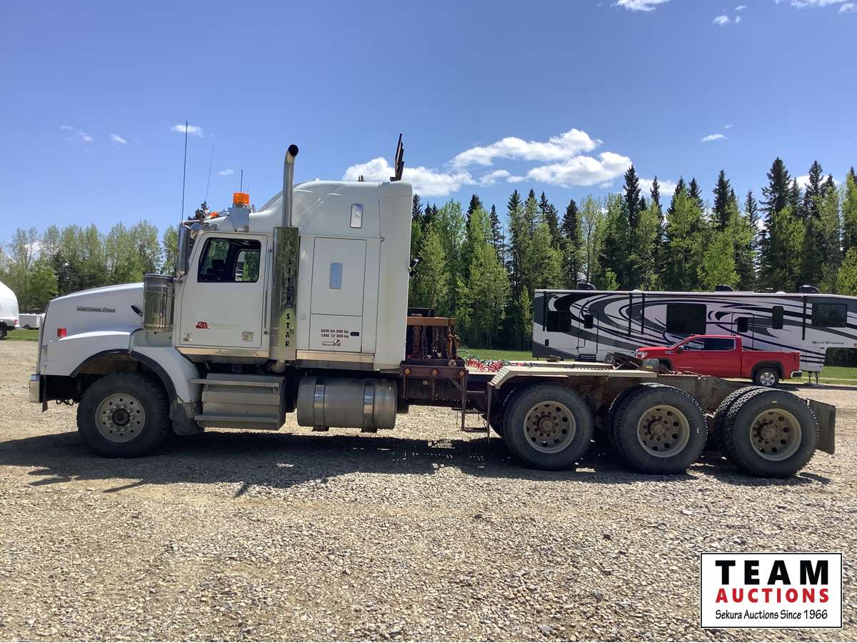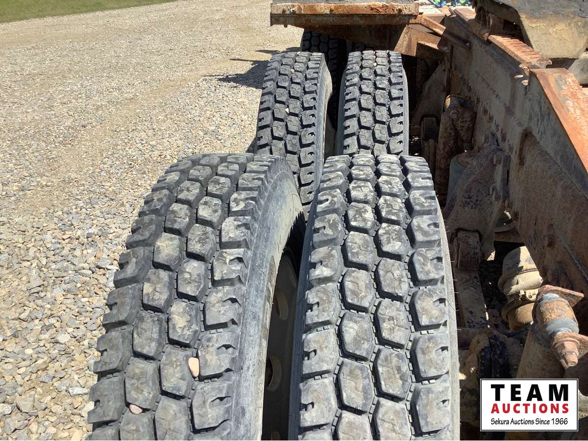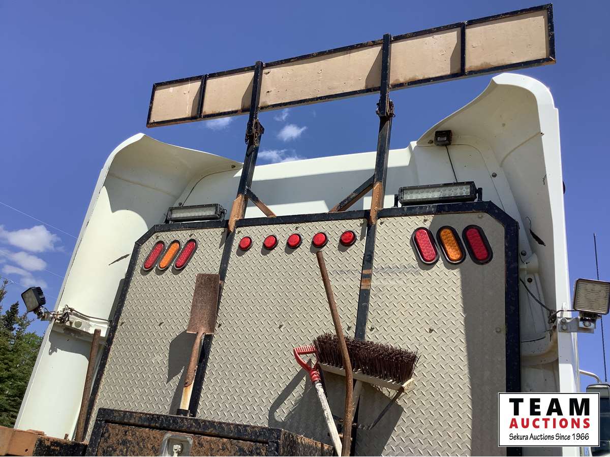 DD15 engine, Eaton Fuller 18 speed transmission, 14,200 lb front axle with twin steering box’s, air ride suspension, full locking rear differential, air slide fifth wheel, headache rack, wide load sign, beacon lights, set of chains and boomers, 385/65R22.5 front tires, real good 11R24 rear tires, aluminum rims