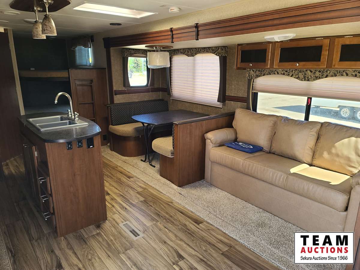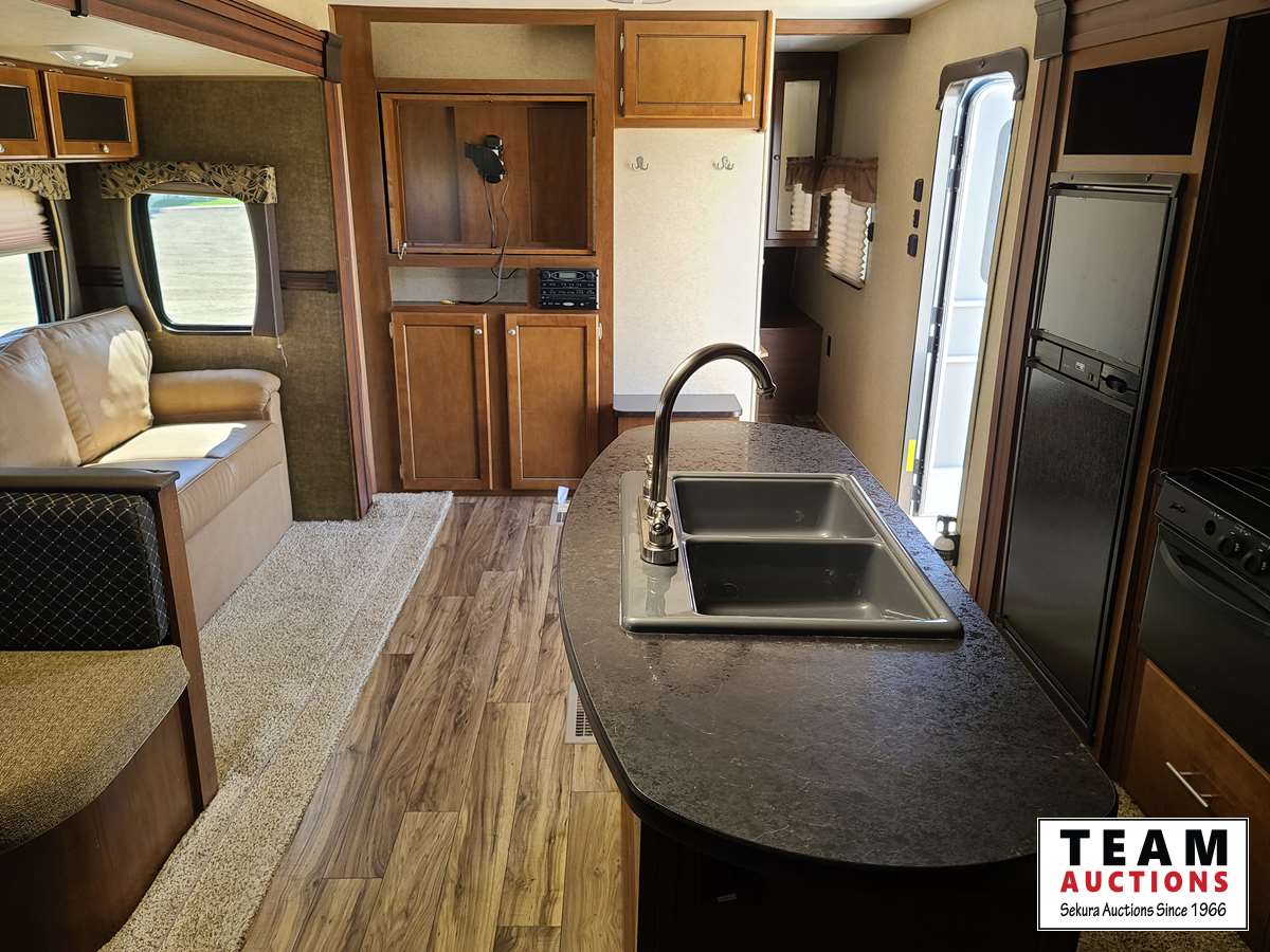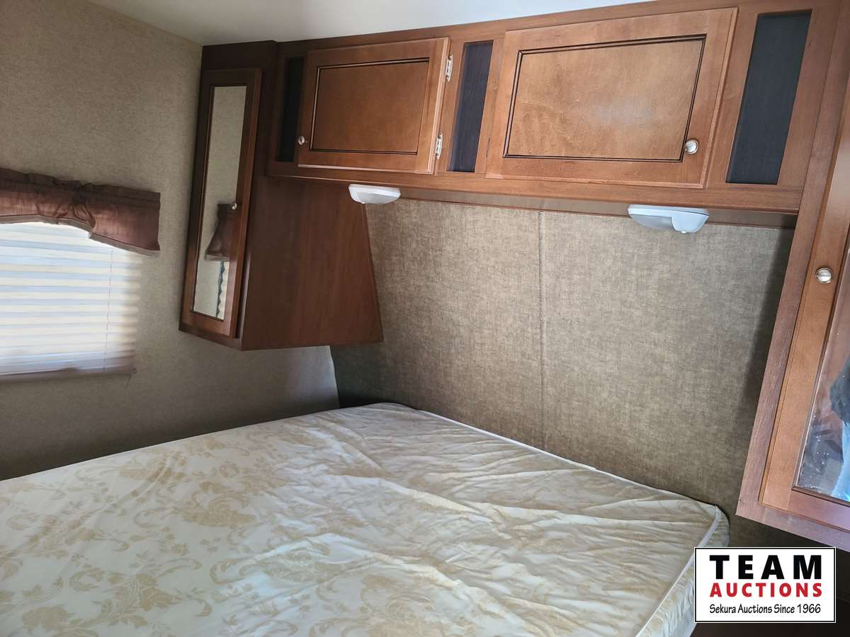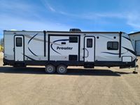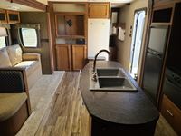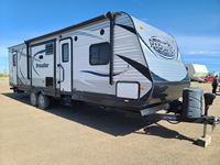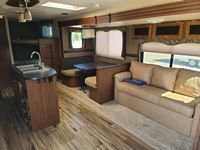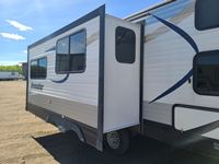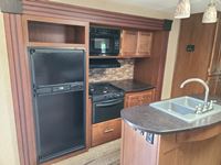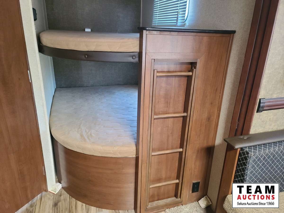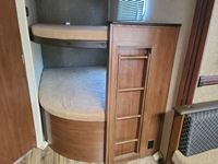 (2) slide outs, fridge, stove, microwave, kitchen island, couch, power awning, power jacks, queen bed, double bed w/single bed bunk, bathroom, 225/75R15 tires