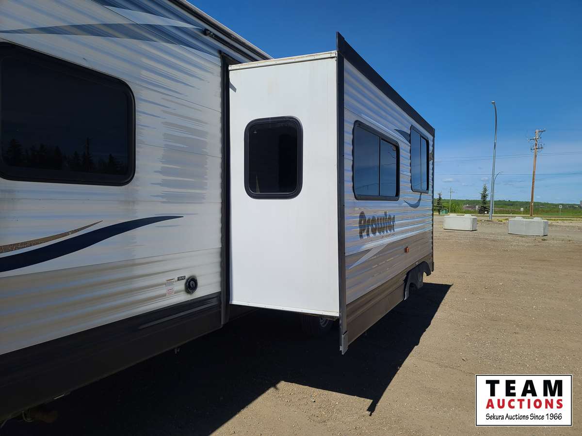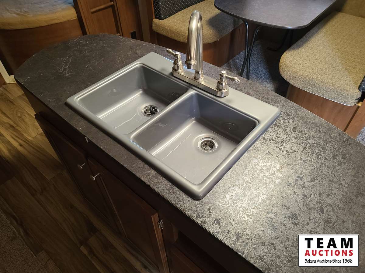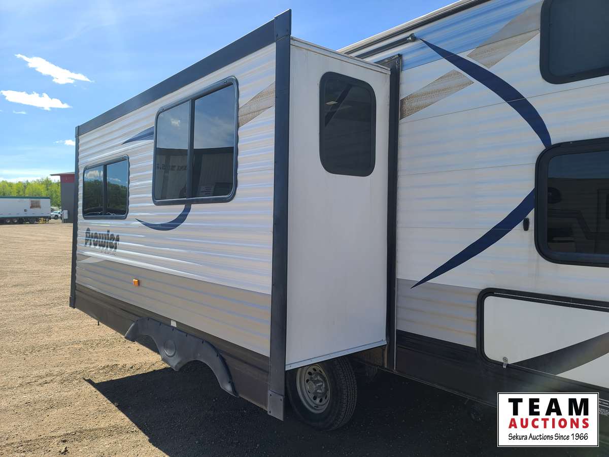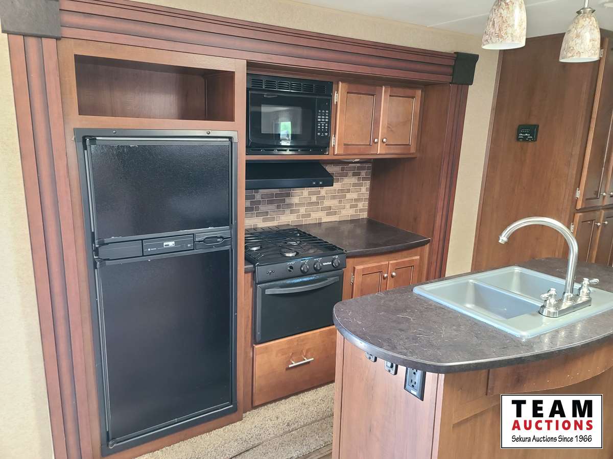 (2) slide outs, fridge, stove, microwave, kitchen island, couch, power awning, power jacks, queen bed, double bed w/single bed bunk, bathroom, 225/75R15 tires