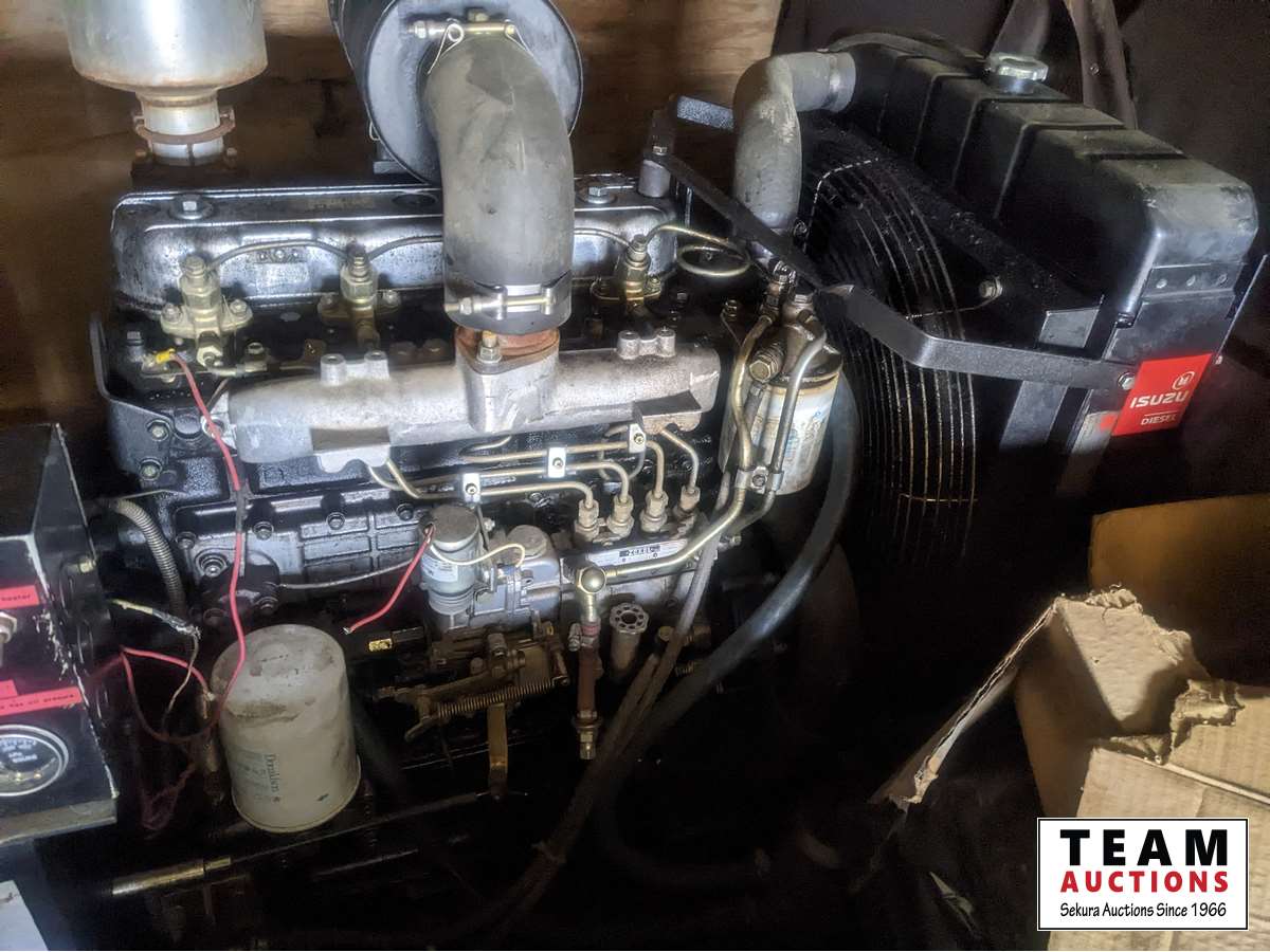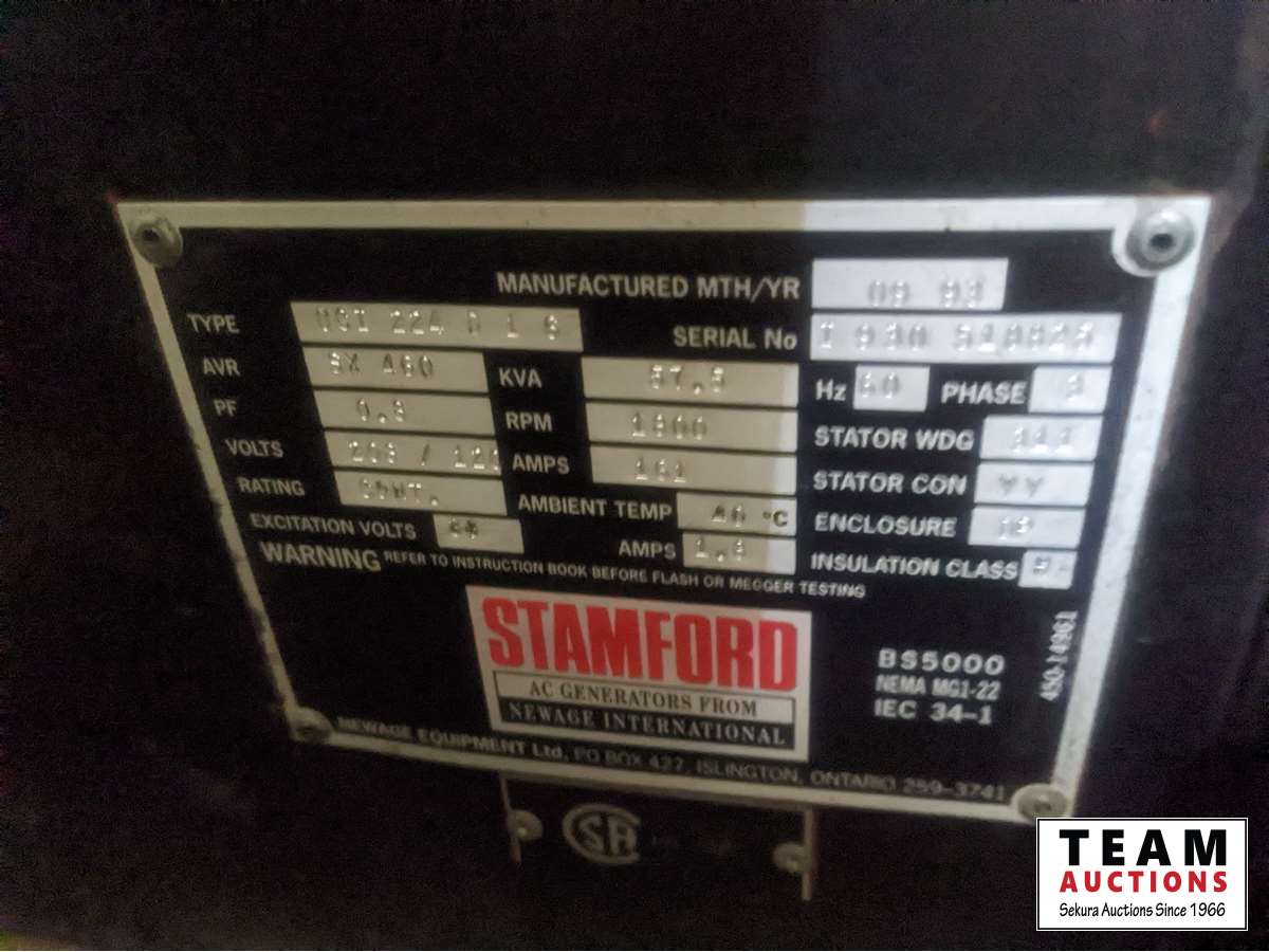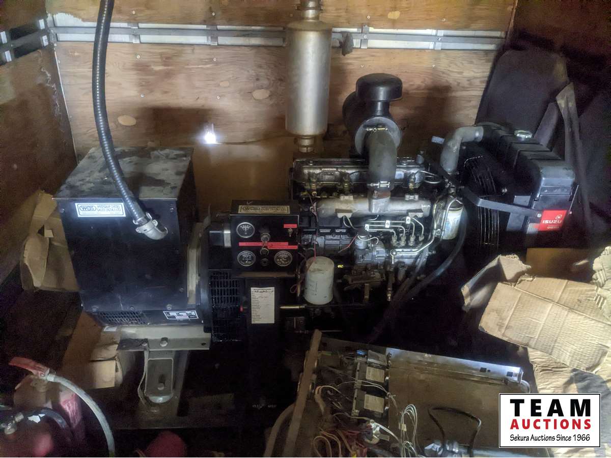 1993 Stamford generator (inoperable), Isuzu, 3 PH, 57.5 kVA,208/120 V, fuel tank, shelving, mounted on 28 ft skid