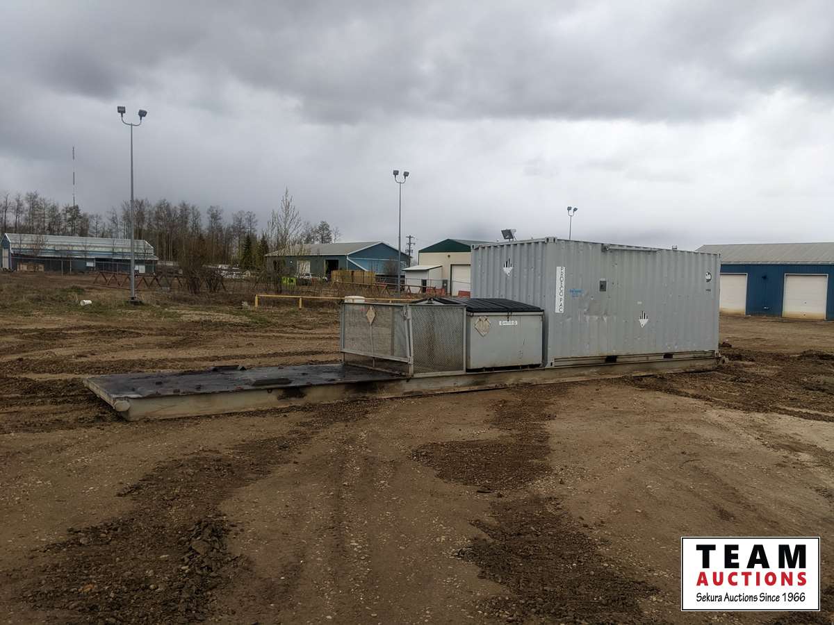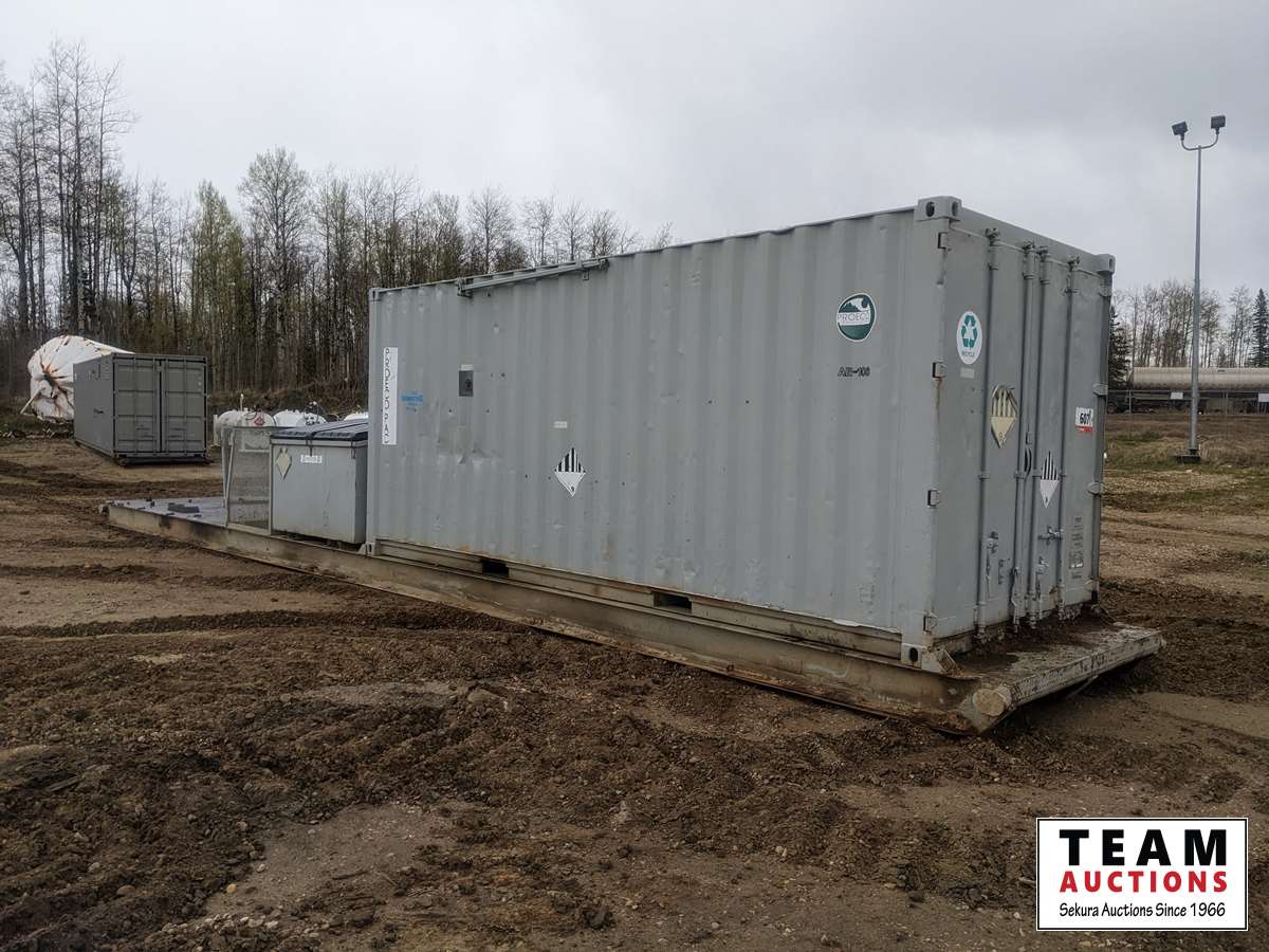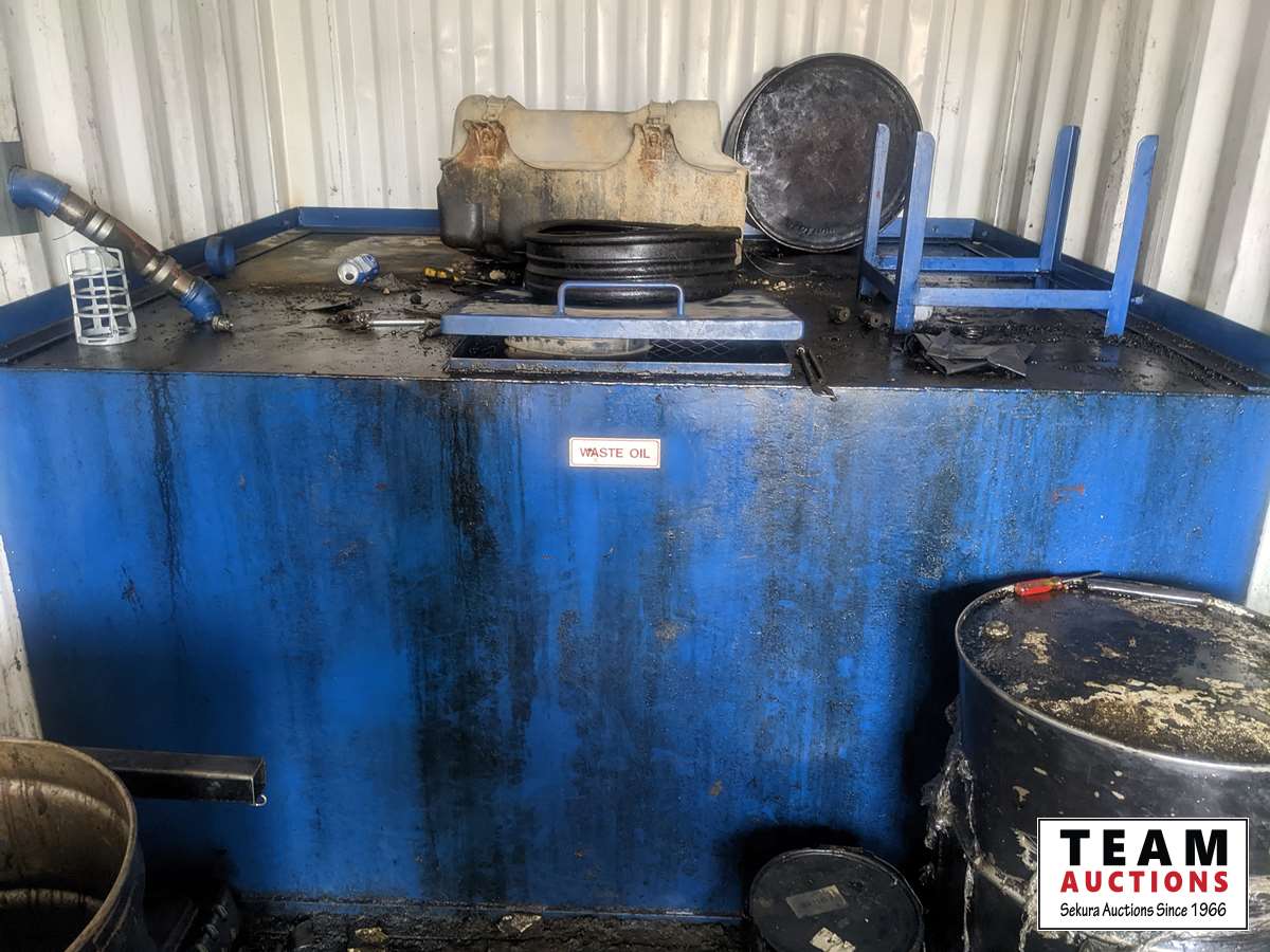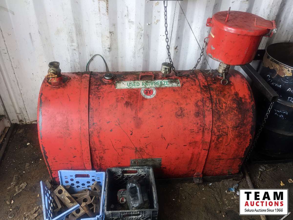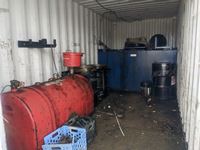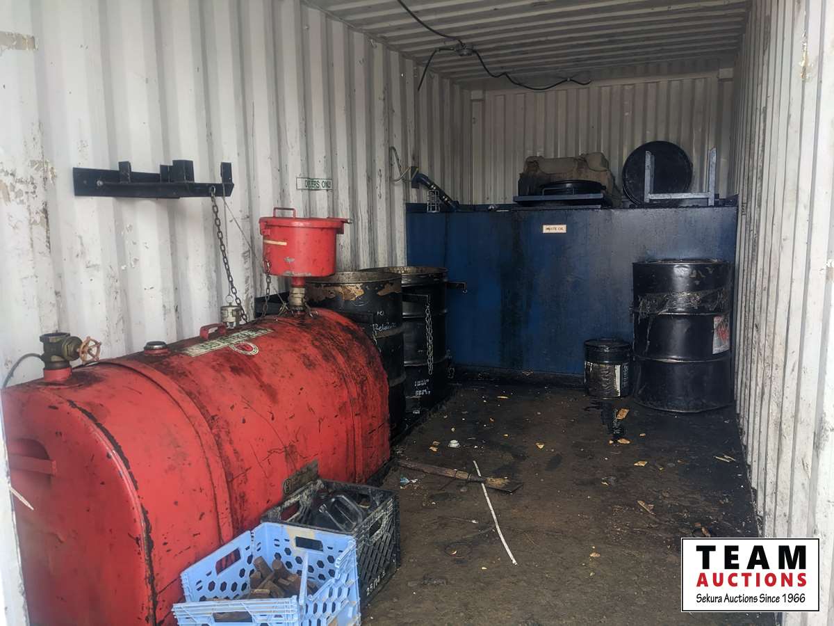 20 ft shipping container, 5153 litre used oil storage tank, 2006 UN 761 litre antifreeze storage tank, (2) Garbage bins
