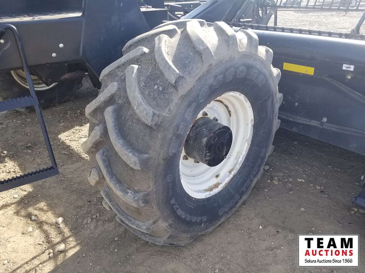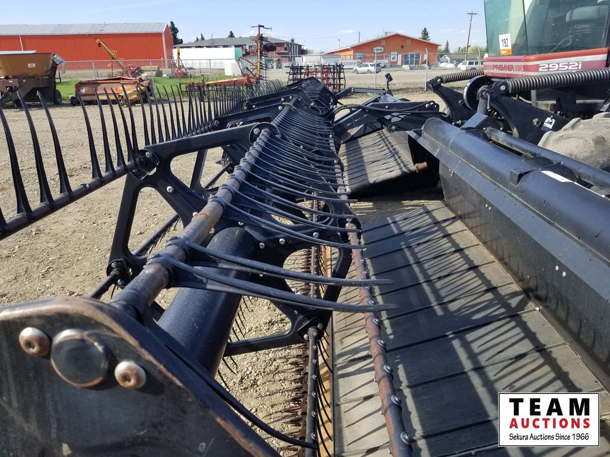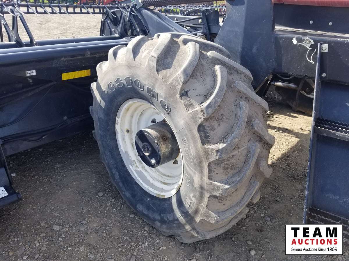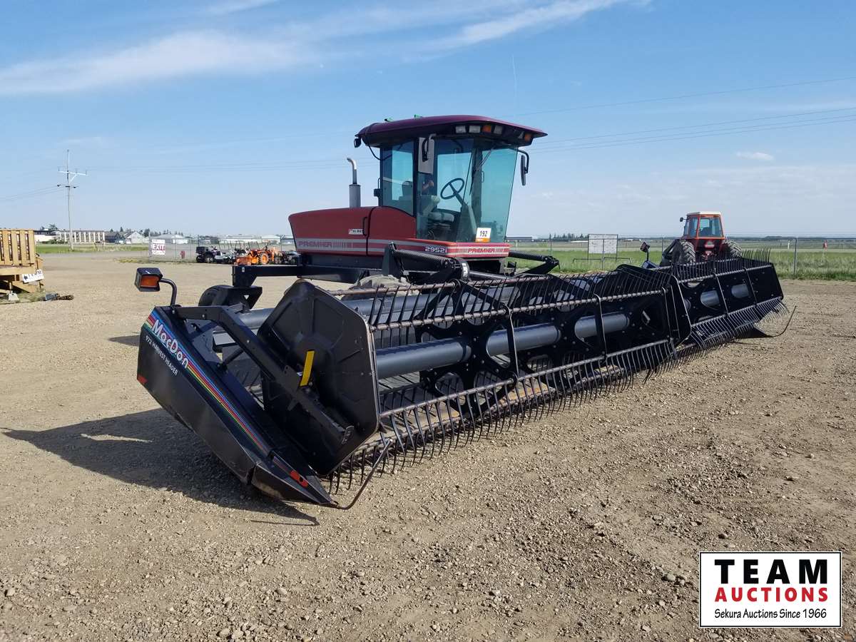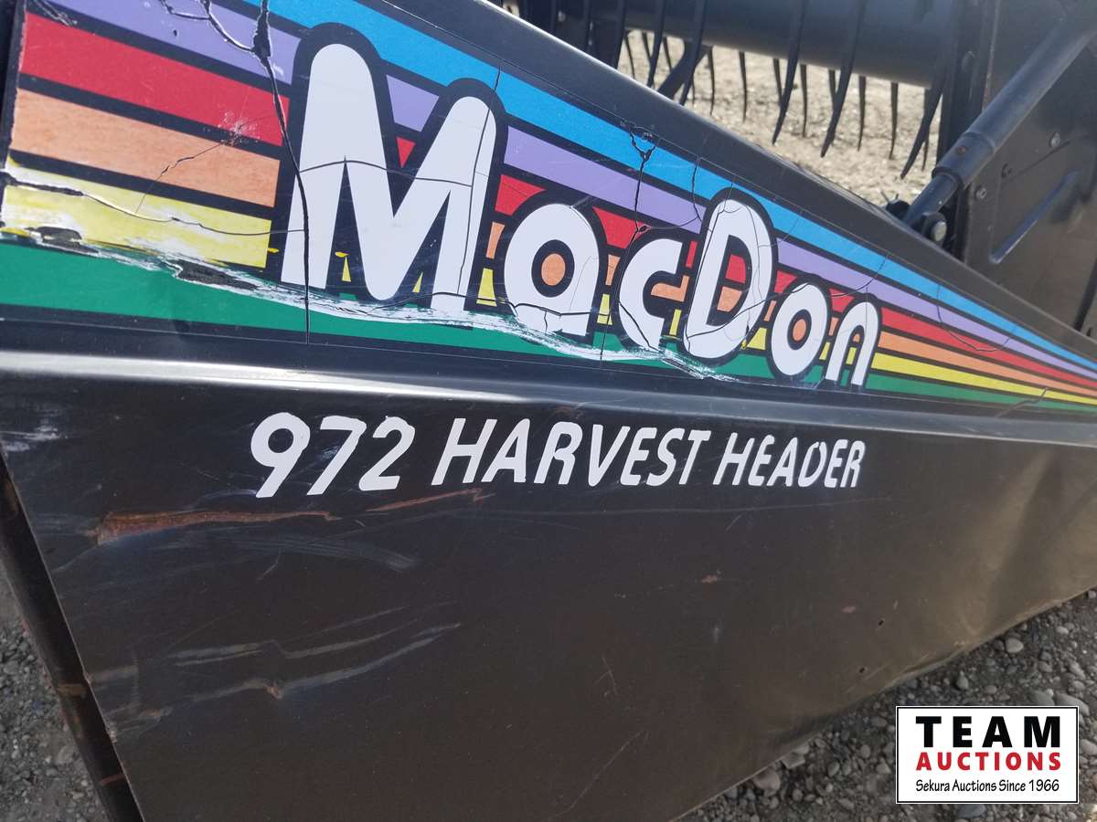 MacDon 972 header, P/U reel, split, double knife drive, trip delivery, 540/65R24 F, 16.5-16.1 R, Header hrs: 2211