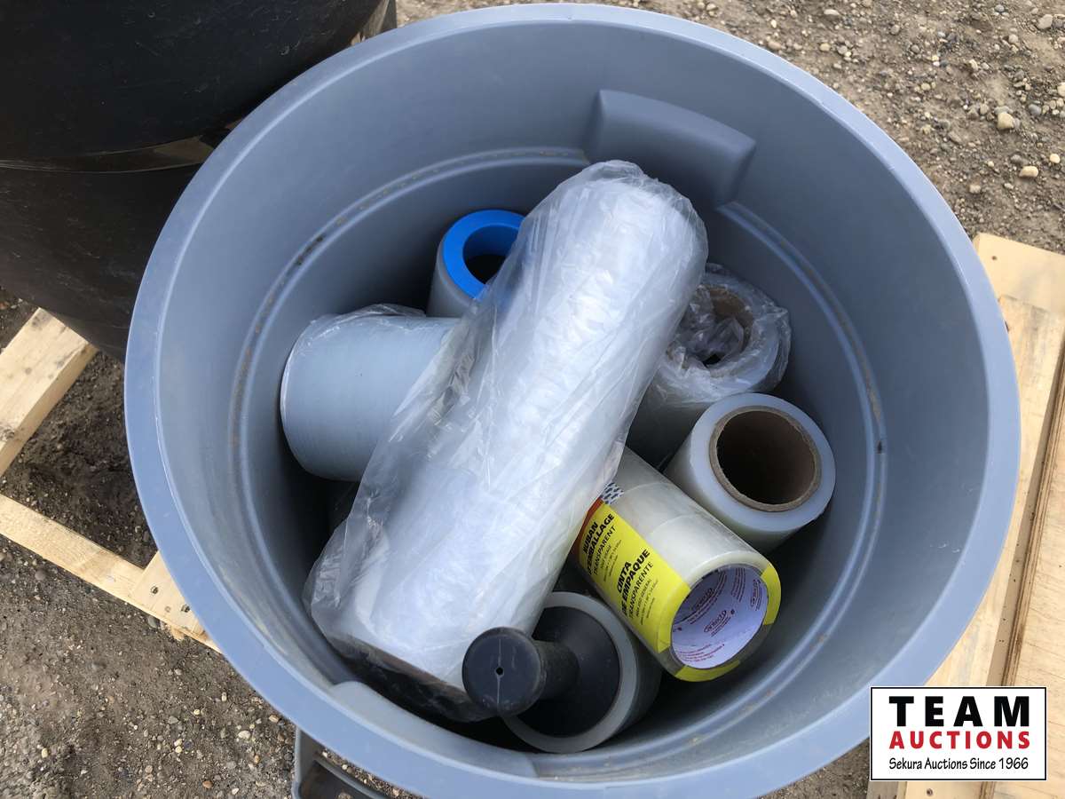 (4) garbage cans, tape, shrink wrap, hinges, roller