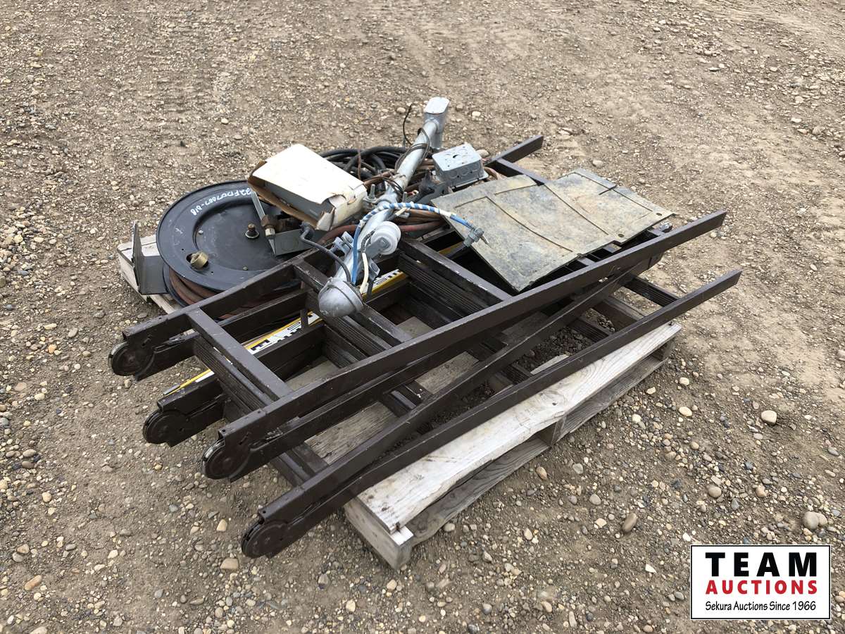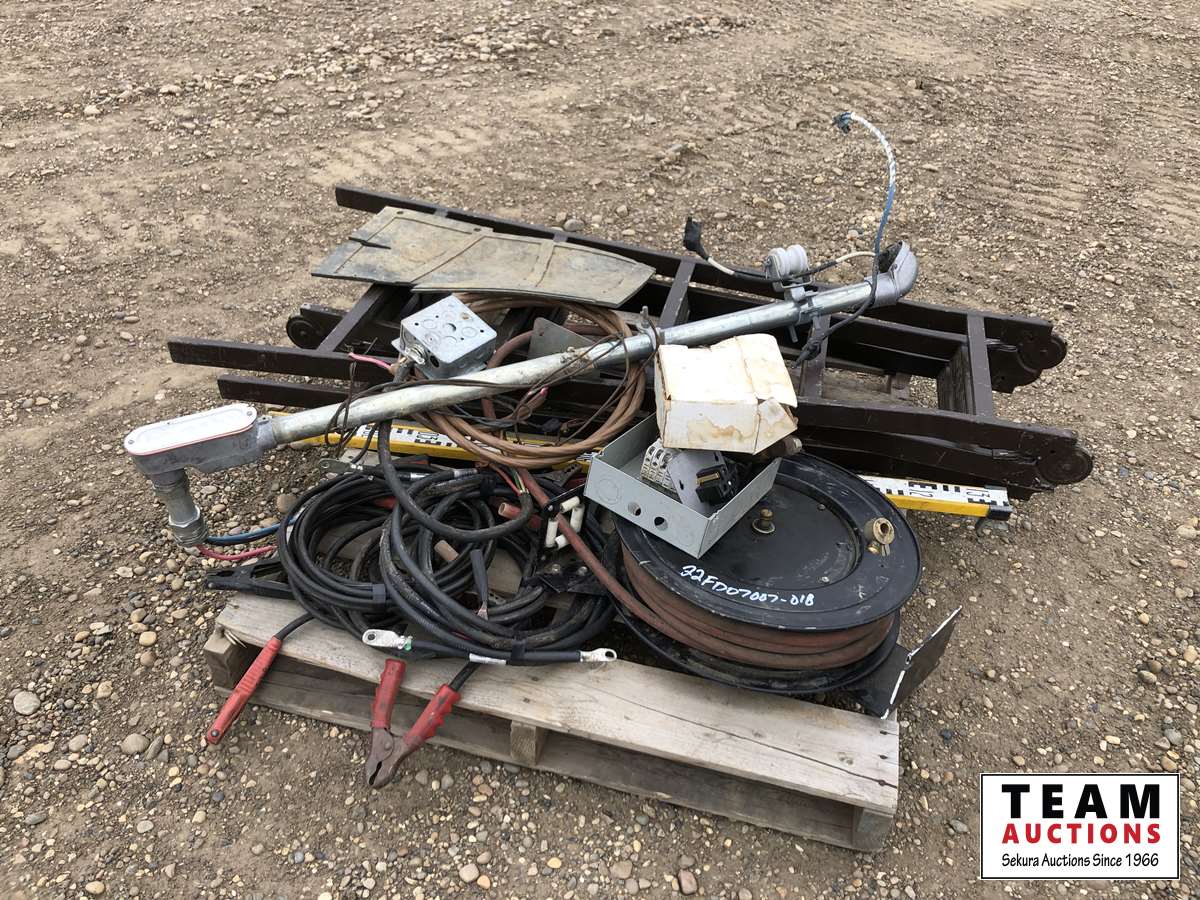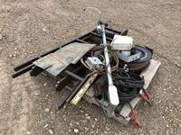 Booster cables, hose reel, (2) ladders, miscellaneous cable & electrical