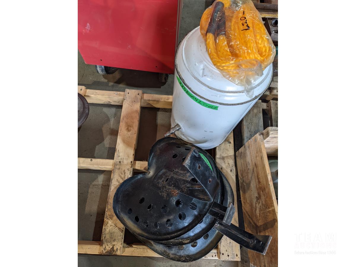 1100 (3) Tractor Seats, Rope and Antique Water Jug