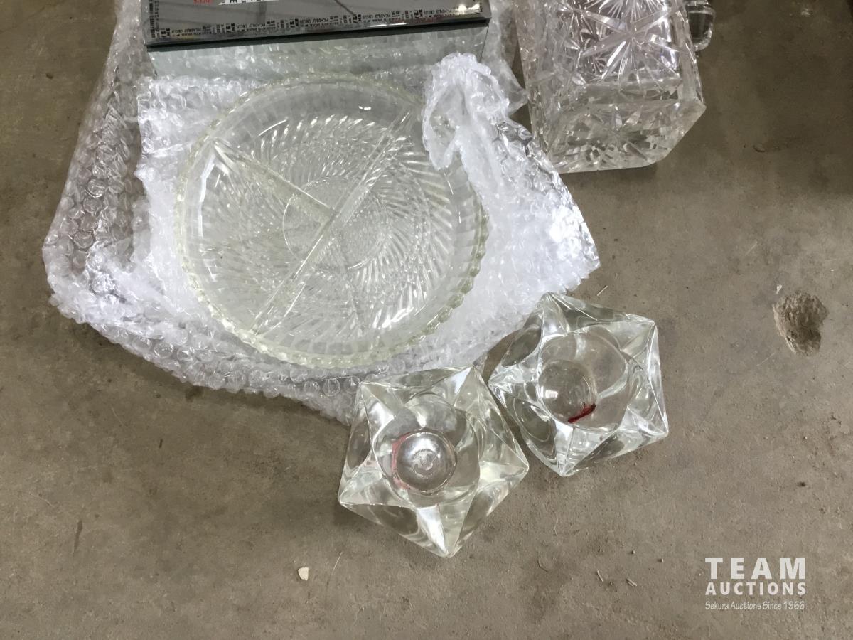 crystal liquor bottle, glass candle, glass ash trays, glass mirror jewelry box, antique dishes