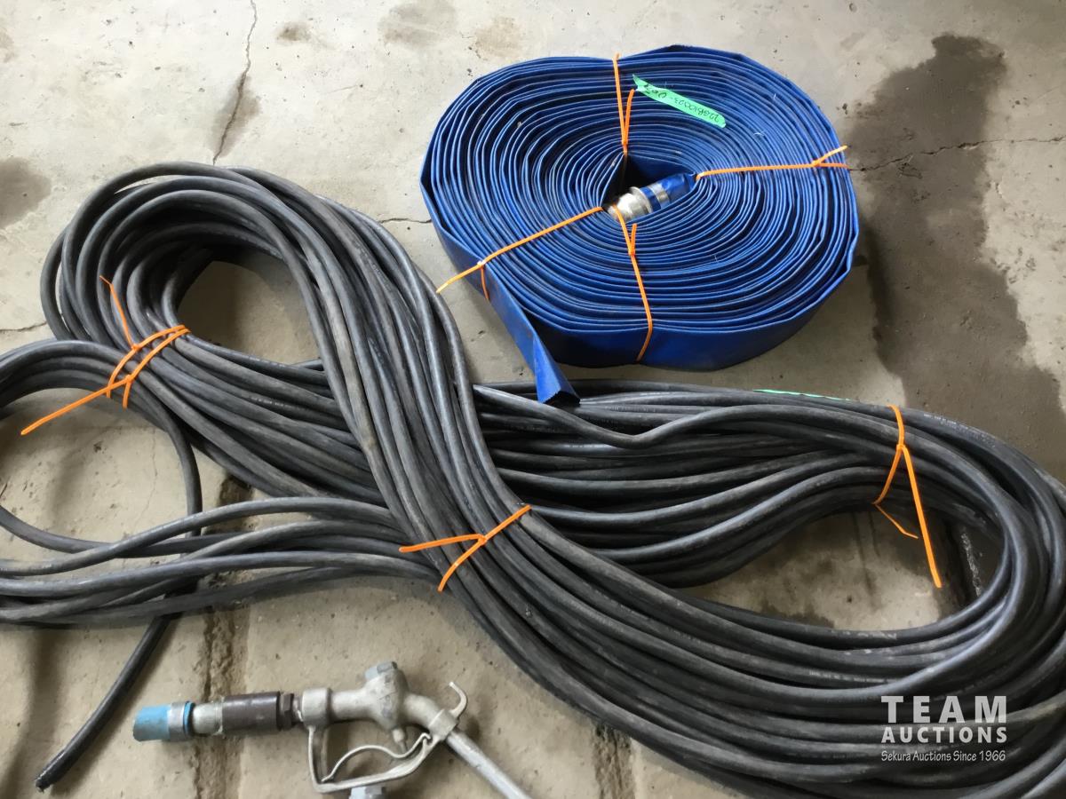 90 ft of 2 inch lay flat hose, 280 ft of 10/4 500w electrical wire, hand fuel pump w/ nozzle and hose