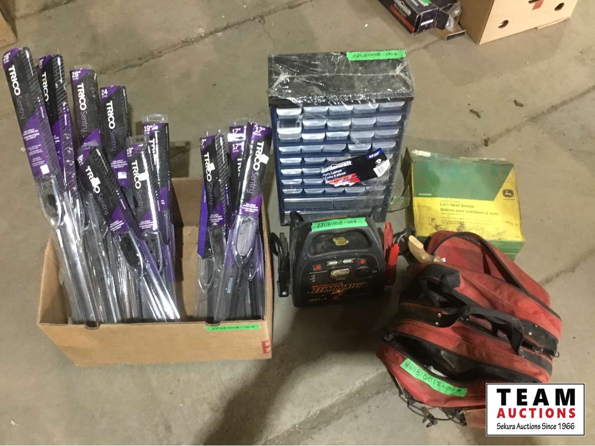 Parts cabinet, booster pack, wood working tools, JD grease, miscellaneous windshield wipers