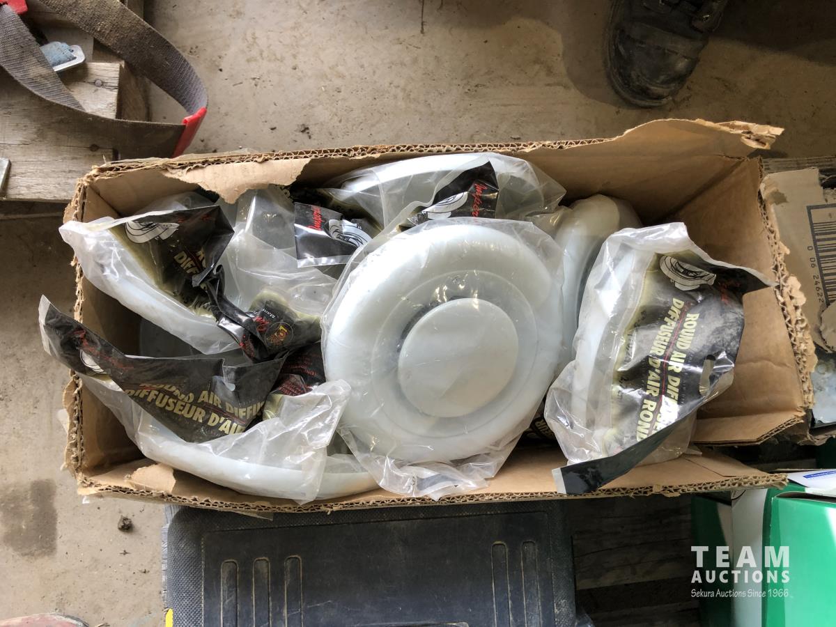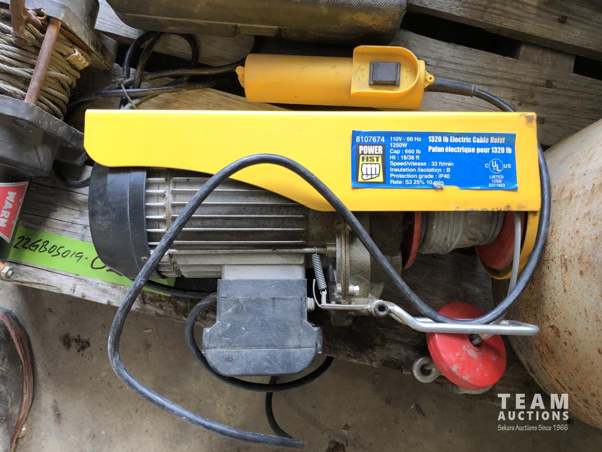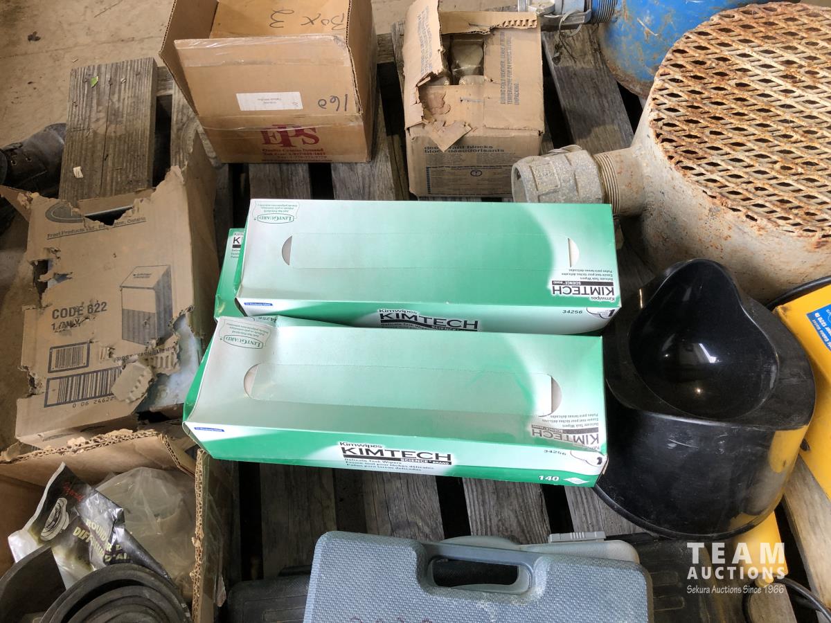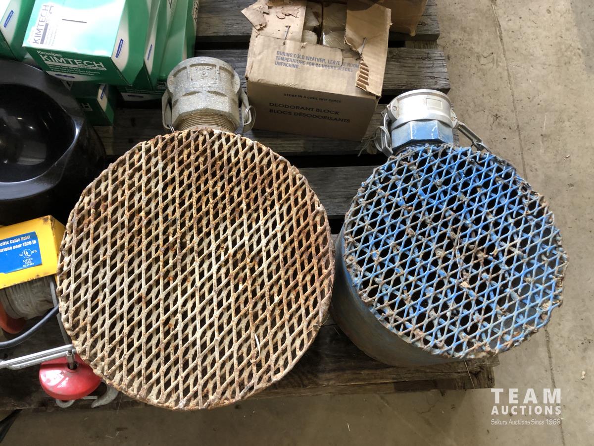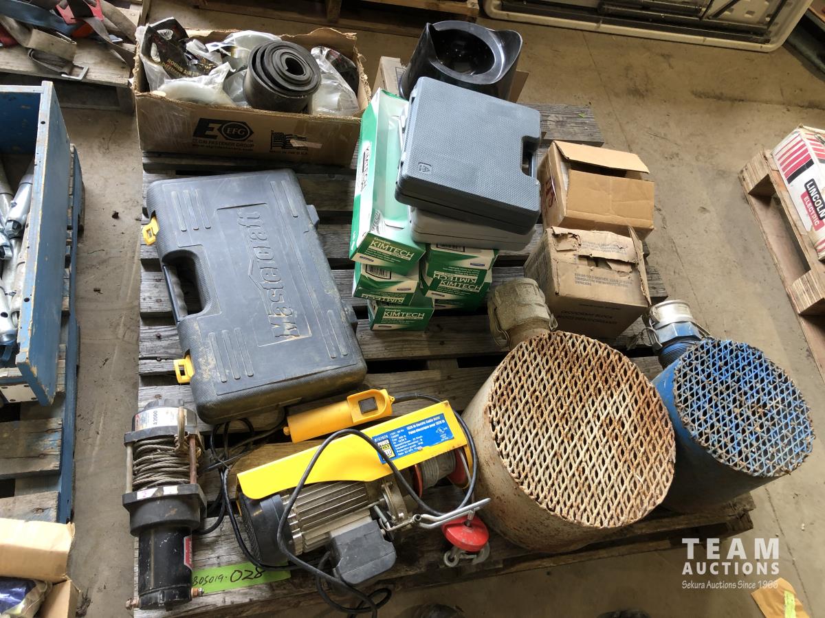 Winch 2000 lb, (2) brad nailers, Mastercraft socket set, electric cable hoist, (2) Pump suction screens, box of wipes, urinal cakes, Qty of new padlocks, paper towel dispenser, qty of vents